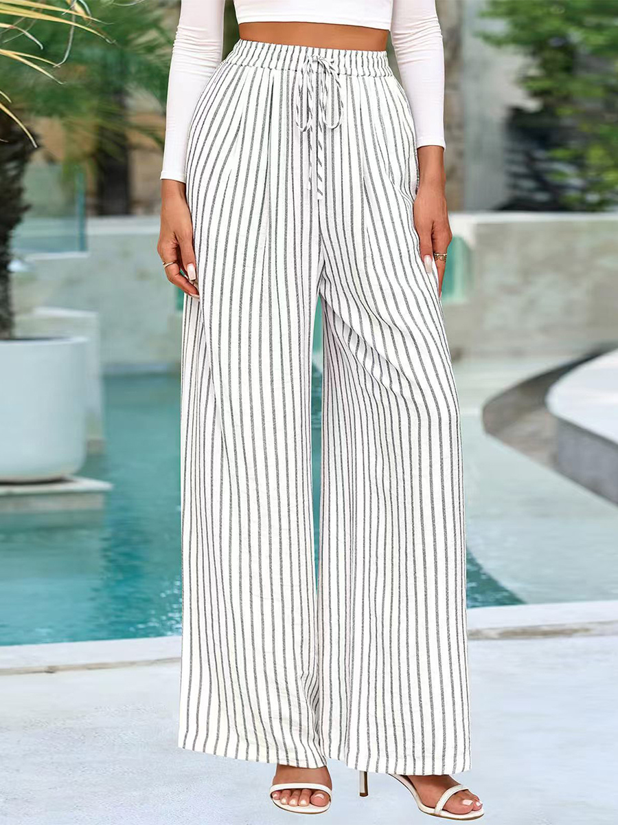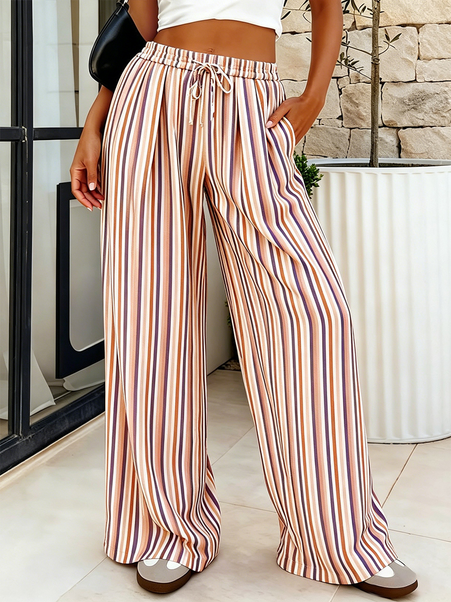 ボヘミアン風ストライプワイドレッグパンツ(レディース) - 縦柄プリント、ハイウエスト、ドローストリング付きパラッツォパンツ - サマービーチリゾート2026