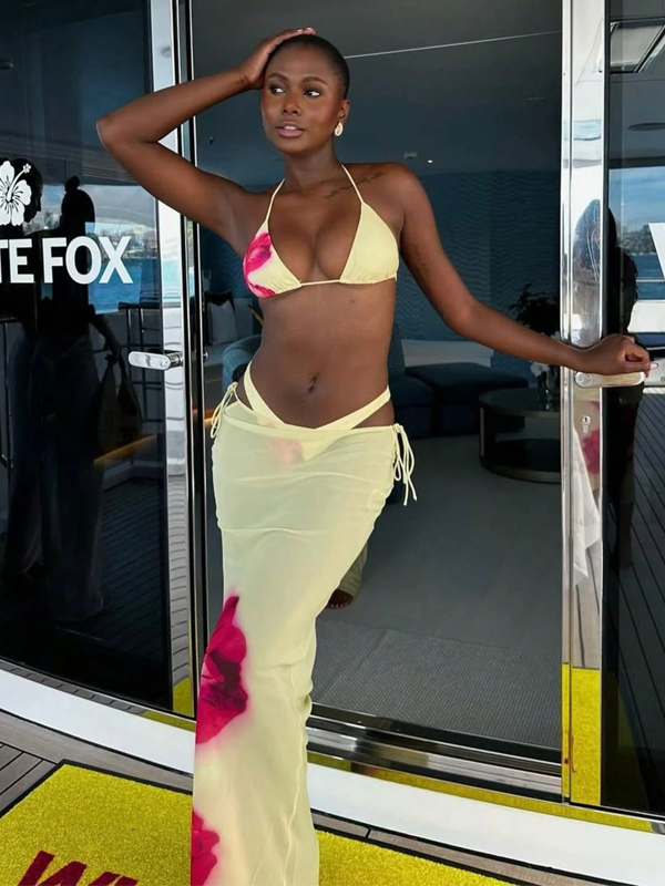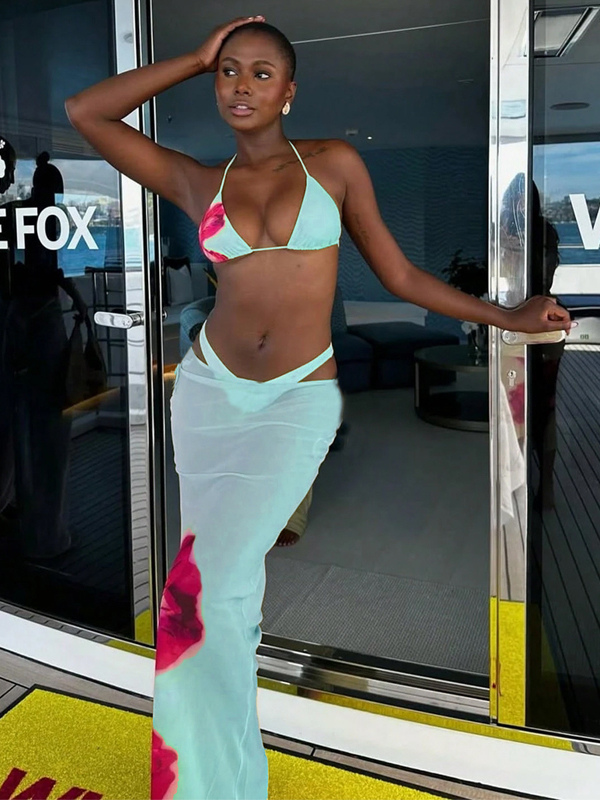 花柄プリントの3点セット水着(レディース) - ホルターネックトライアングルビキニとマキシスカートカバーアップ - サマービーチリゾート2026