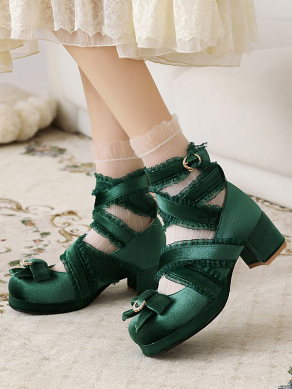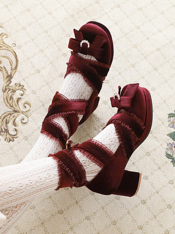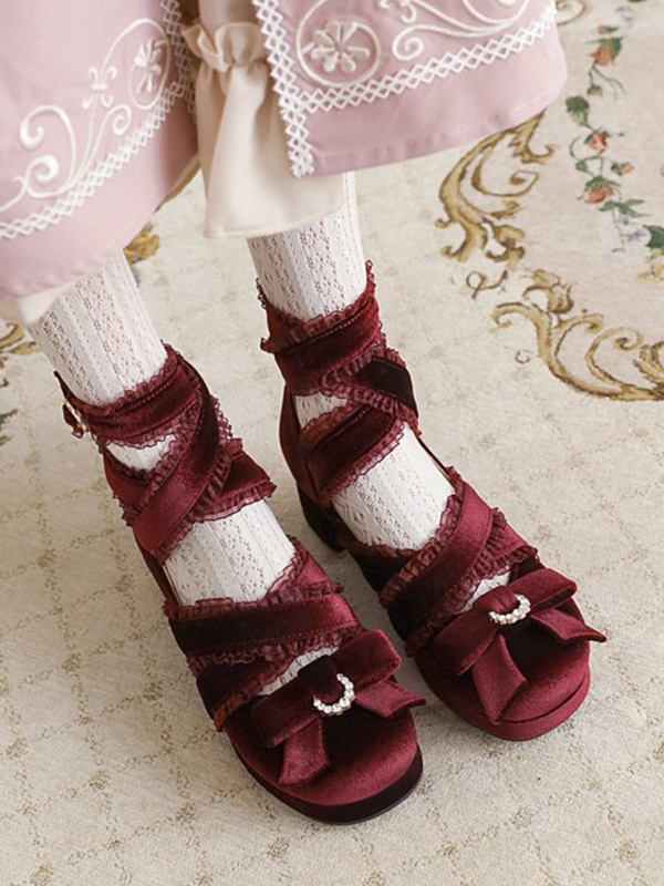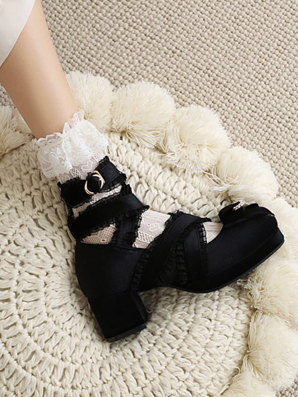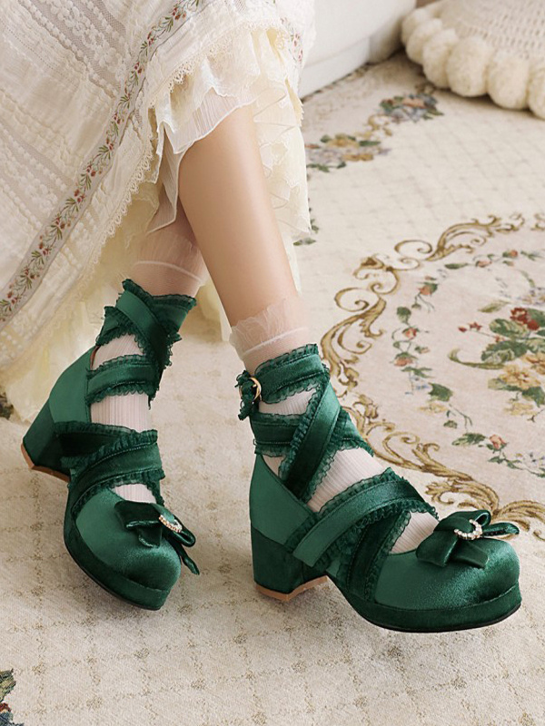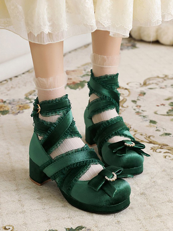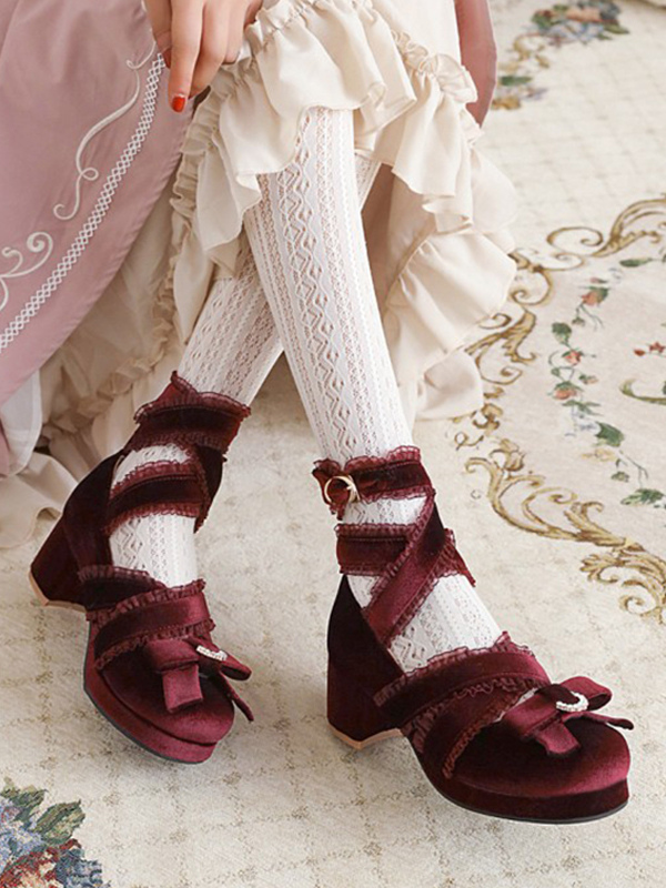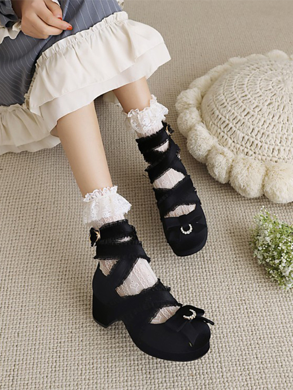 スウィートロリータパンプス ブラックリボン コーデュロイ チャンキーヒール ロリータシューズ