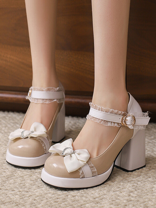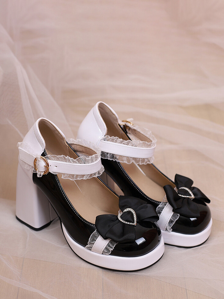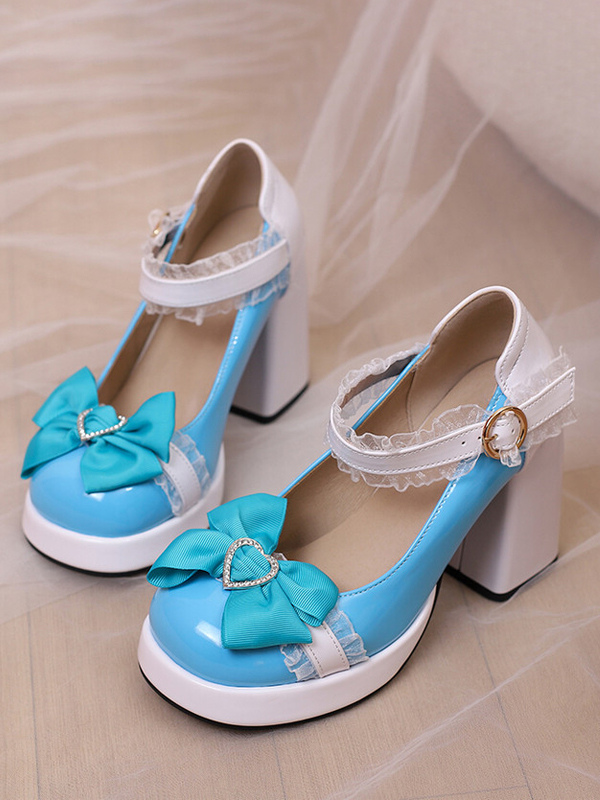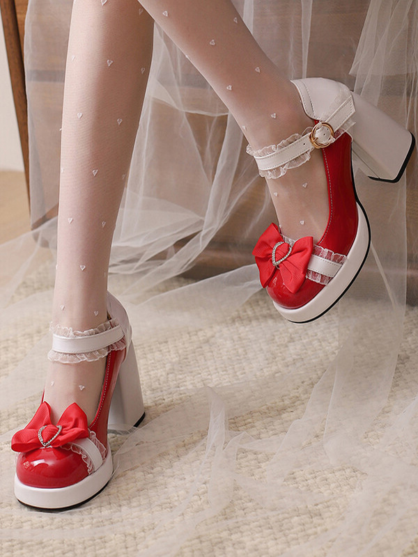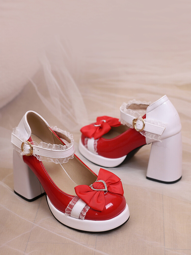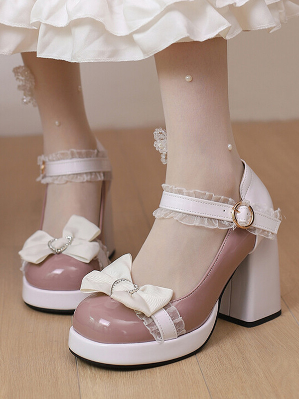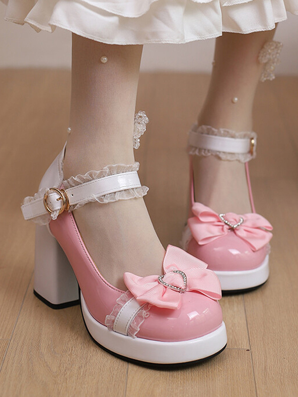 スウィートロリータシューズ ピンクのレースリボン パテントレザー チャンキーヒール ロリータパンプス