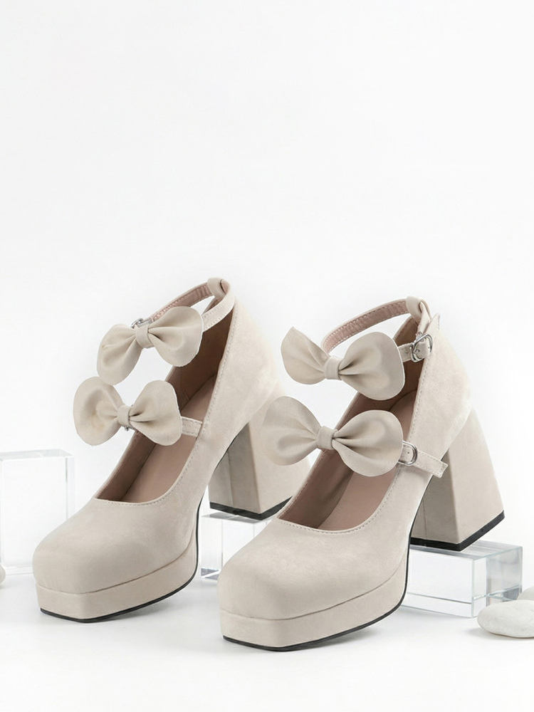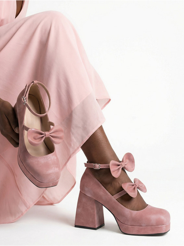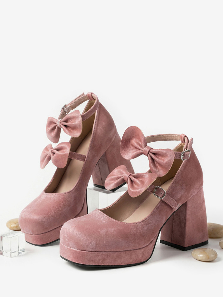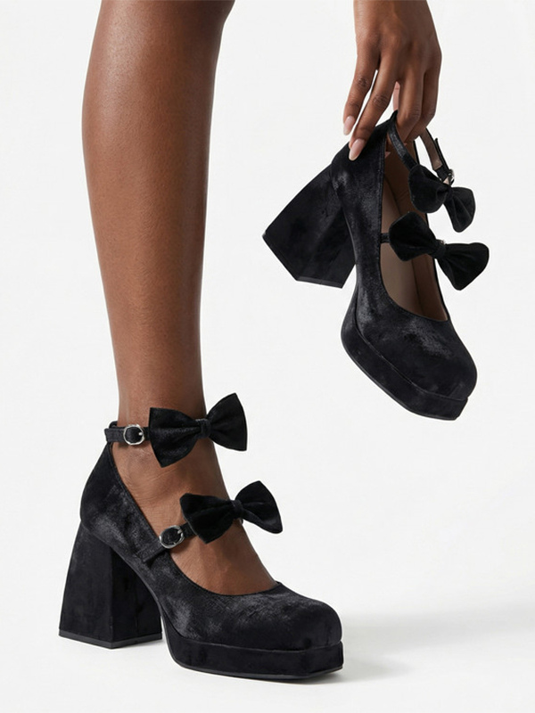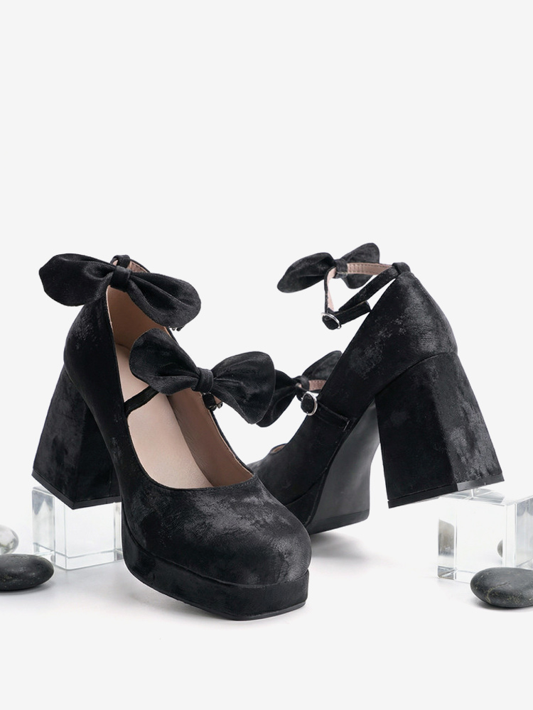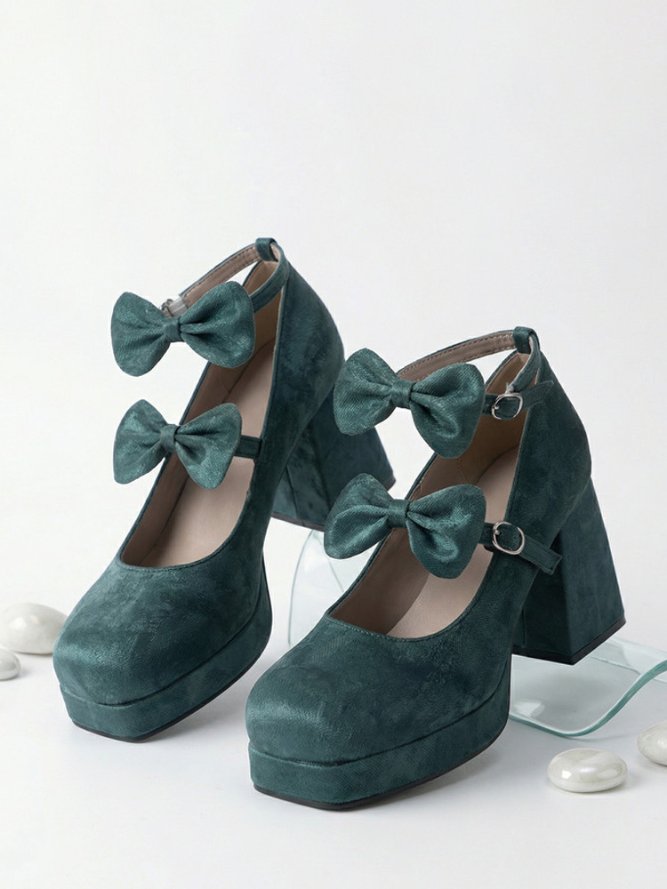 スウィートロリータシューズ ダークグリーンリボン マイクロスエードアッパー チャンキーヒール ロリータパンプス