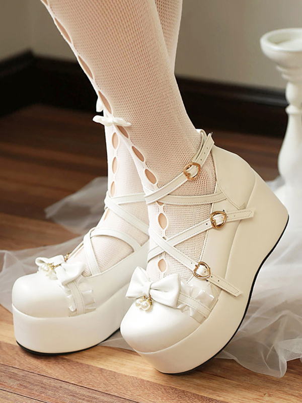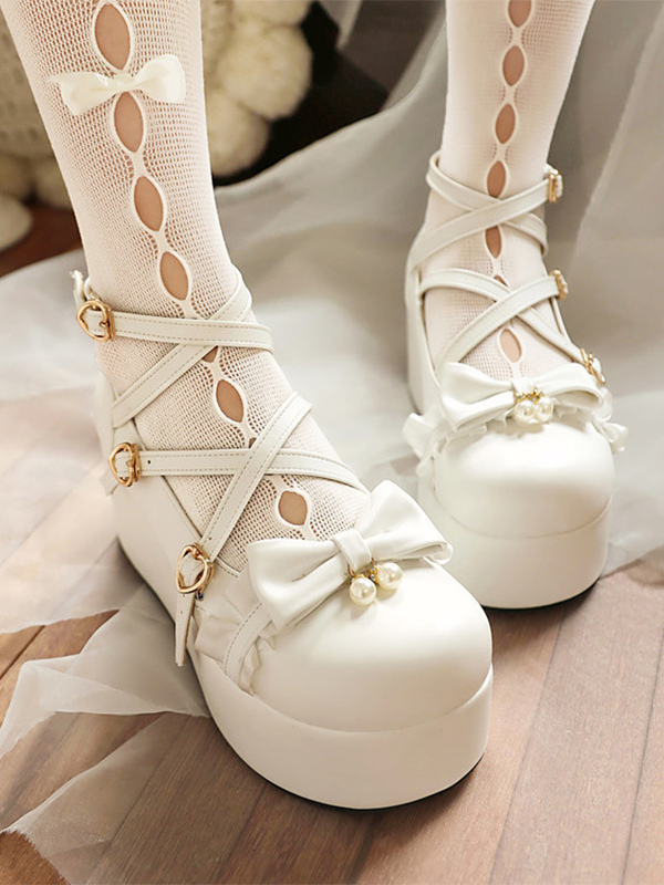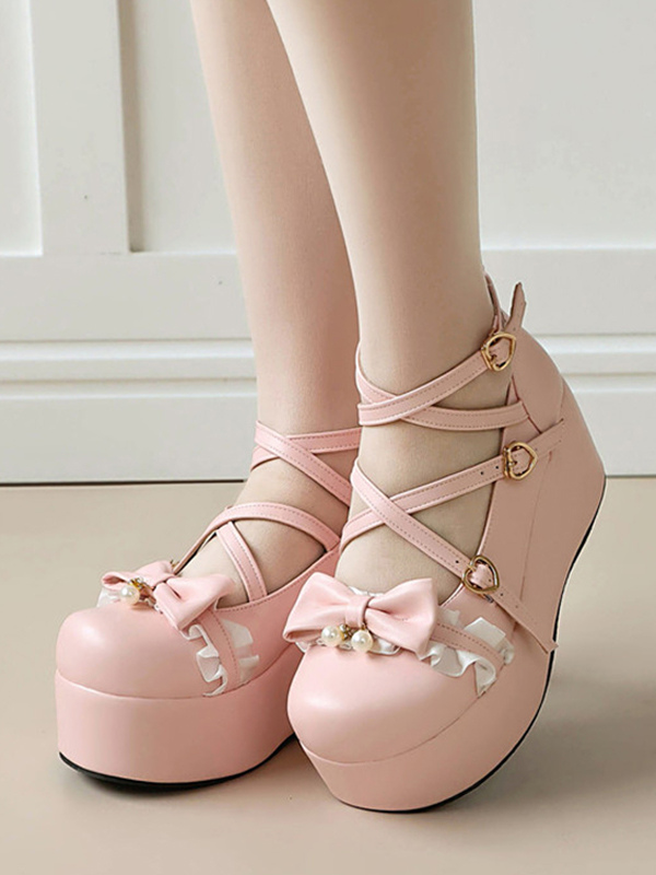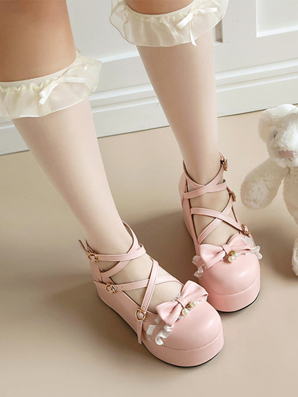スウィートロリータシューズ ピンクのリボン レース ラウンドトゥ PUレザー プラットフォーム ロリータパンプス
