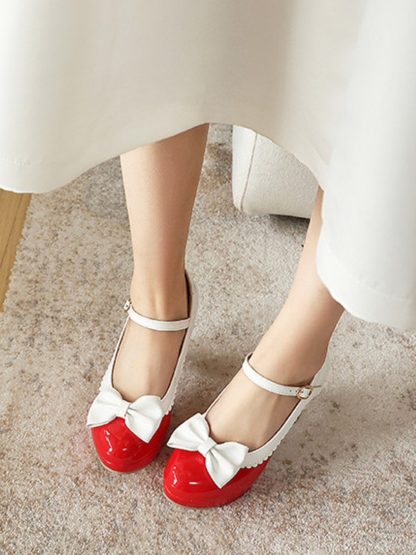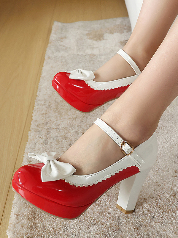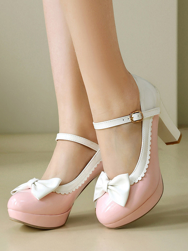 スウィートロリータ メリージェーンシューズ ピンクのリボン ラウンドトゥ PUレザー チャンキーヒール ロリータパンプス
