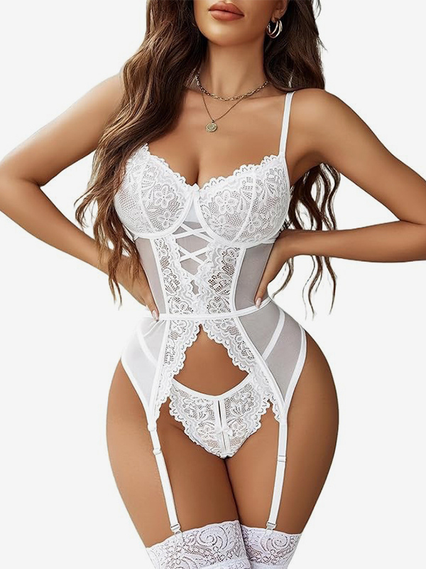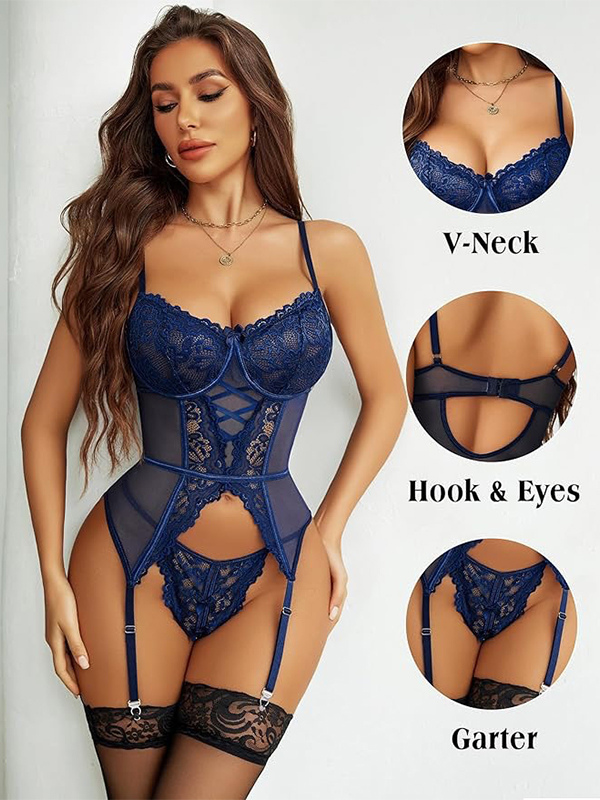 ランジェリー コルセット レースアップ ダークネイビー メッシュ レース ビスチェ ニーハイソックス付き