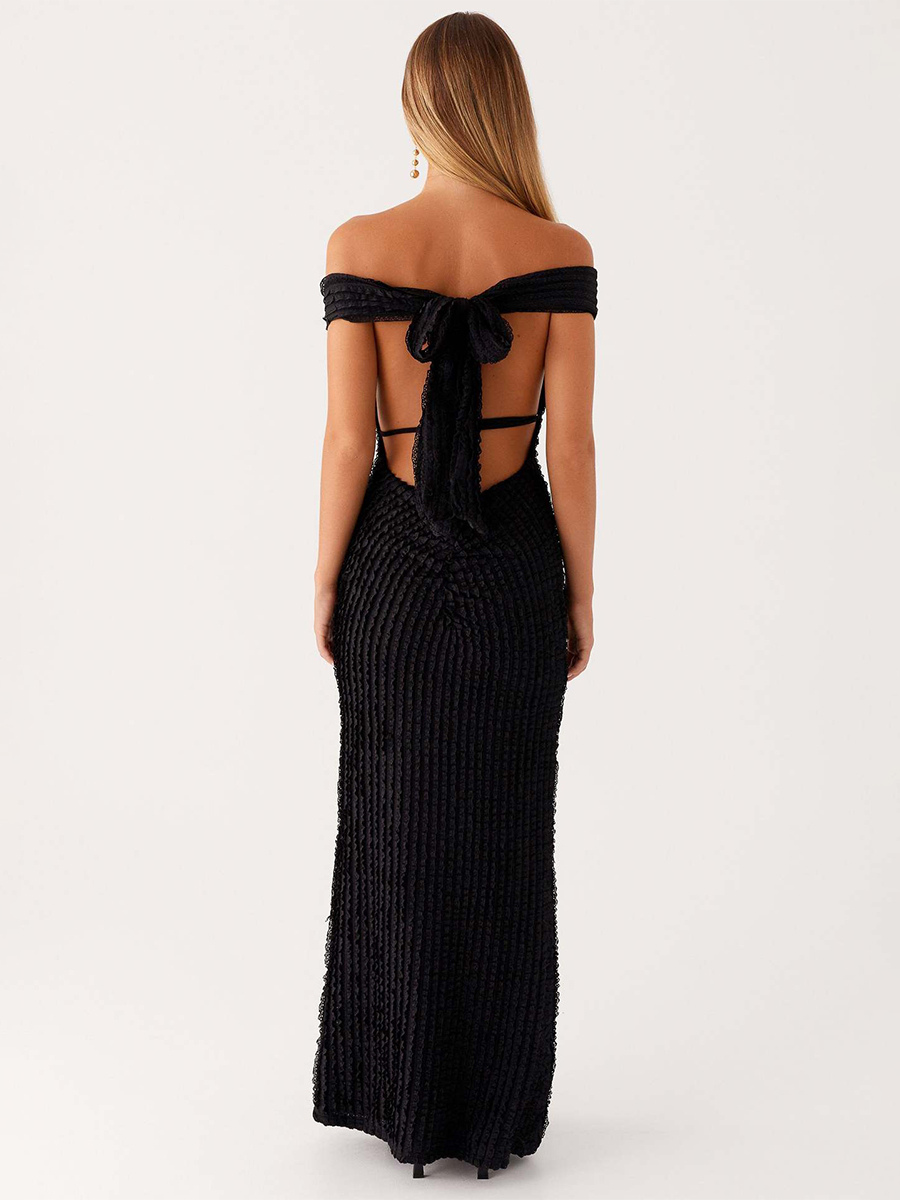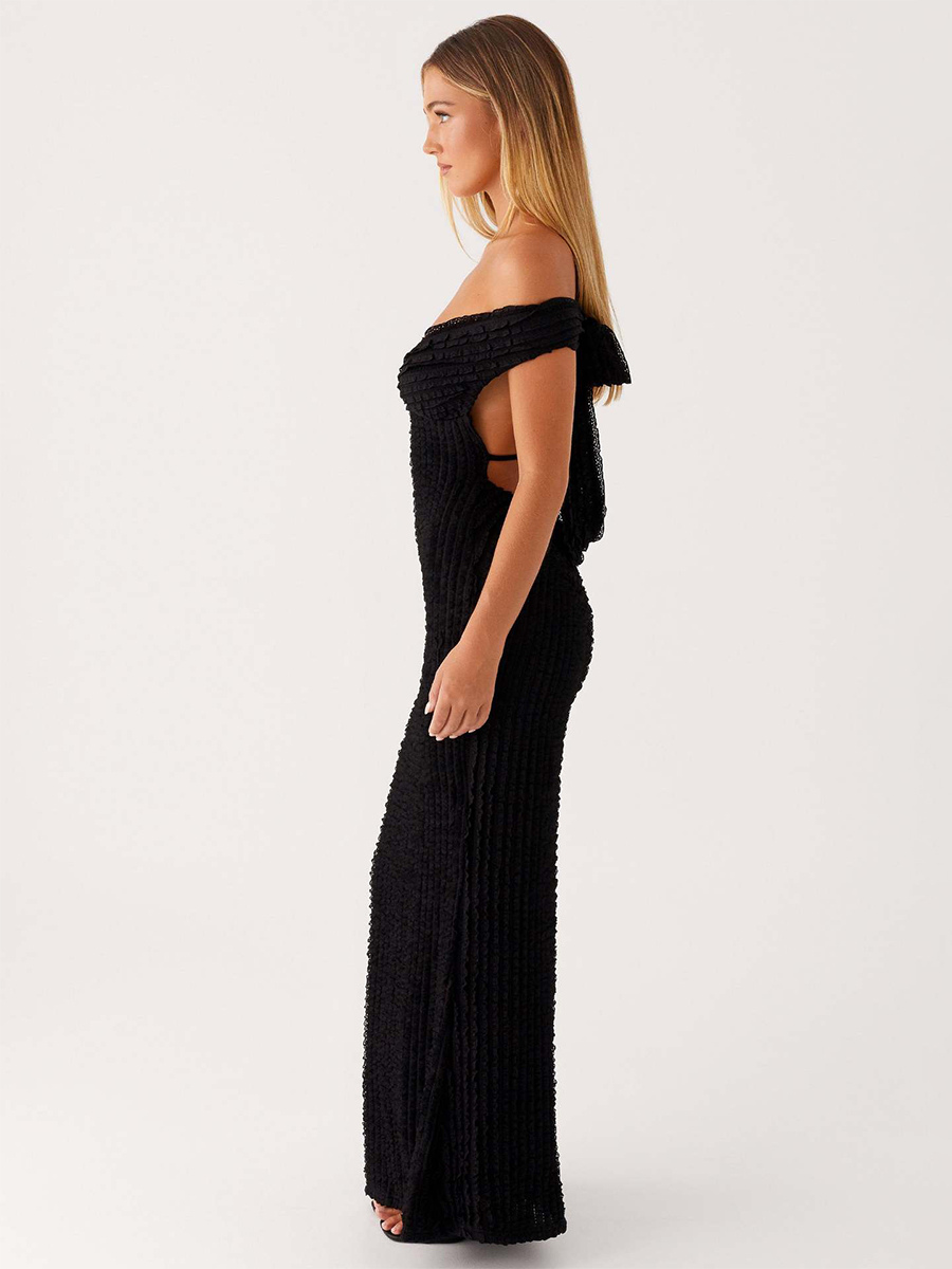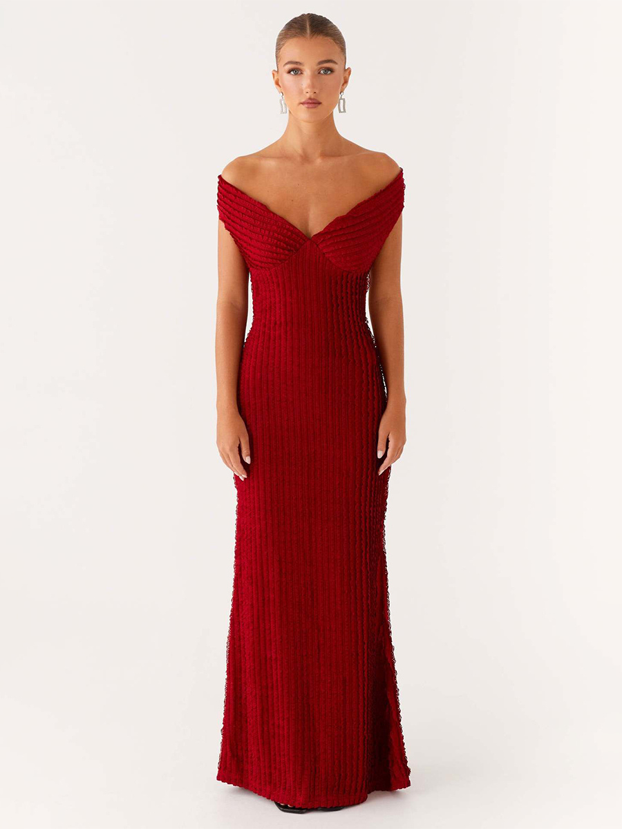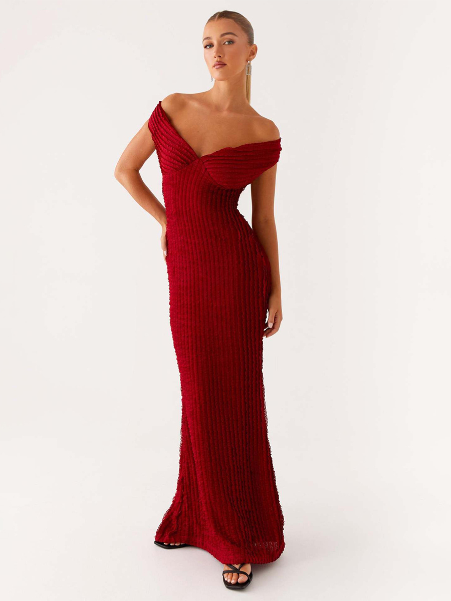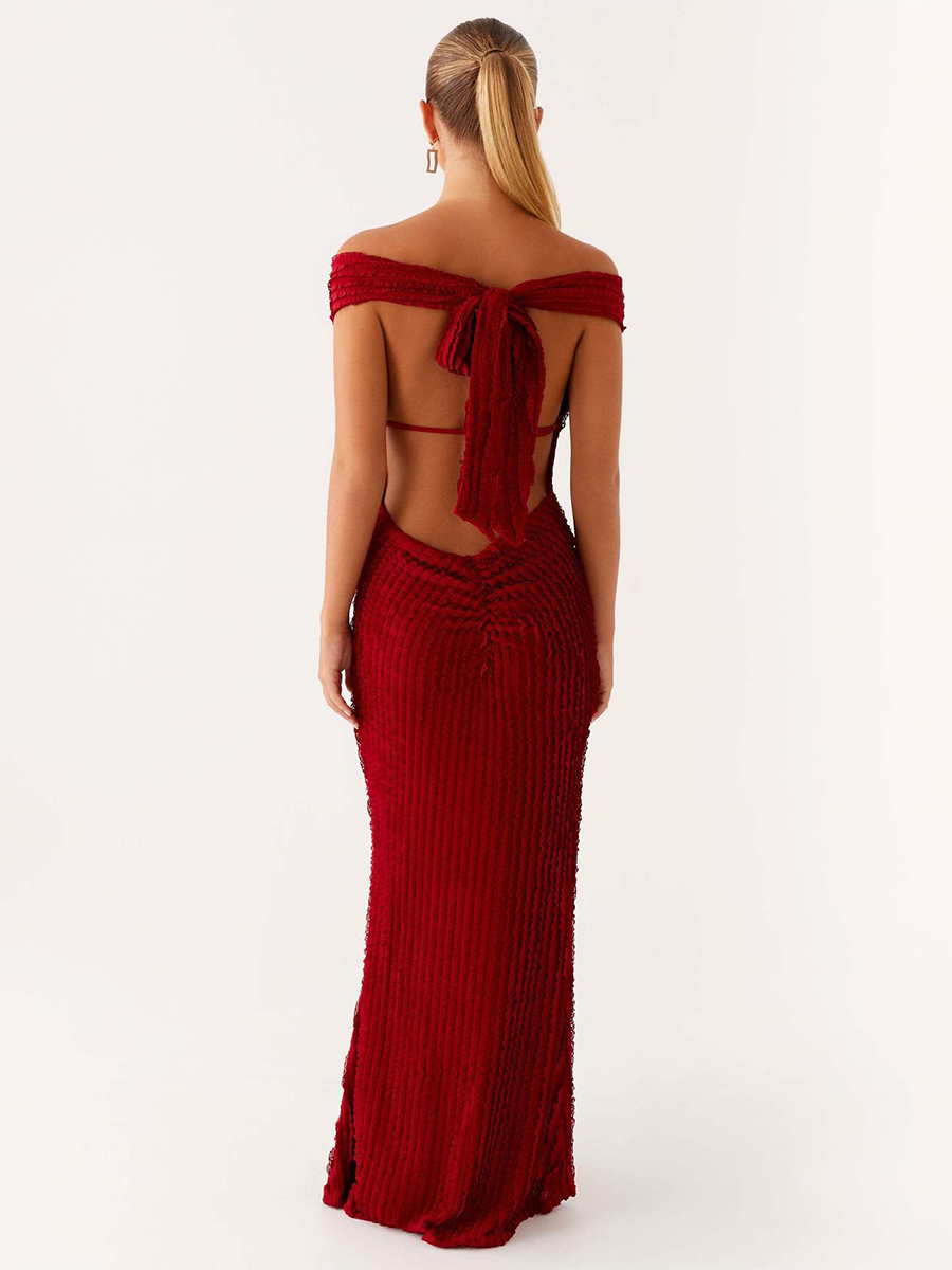 オフショルダーマキシドレス(女性用) - テクスチャード加工の背中開きボディコンマーメイドドレス - 夏の夜の結婚式ゲスト向け 2026