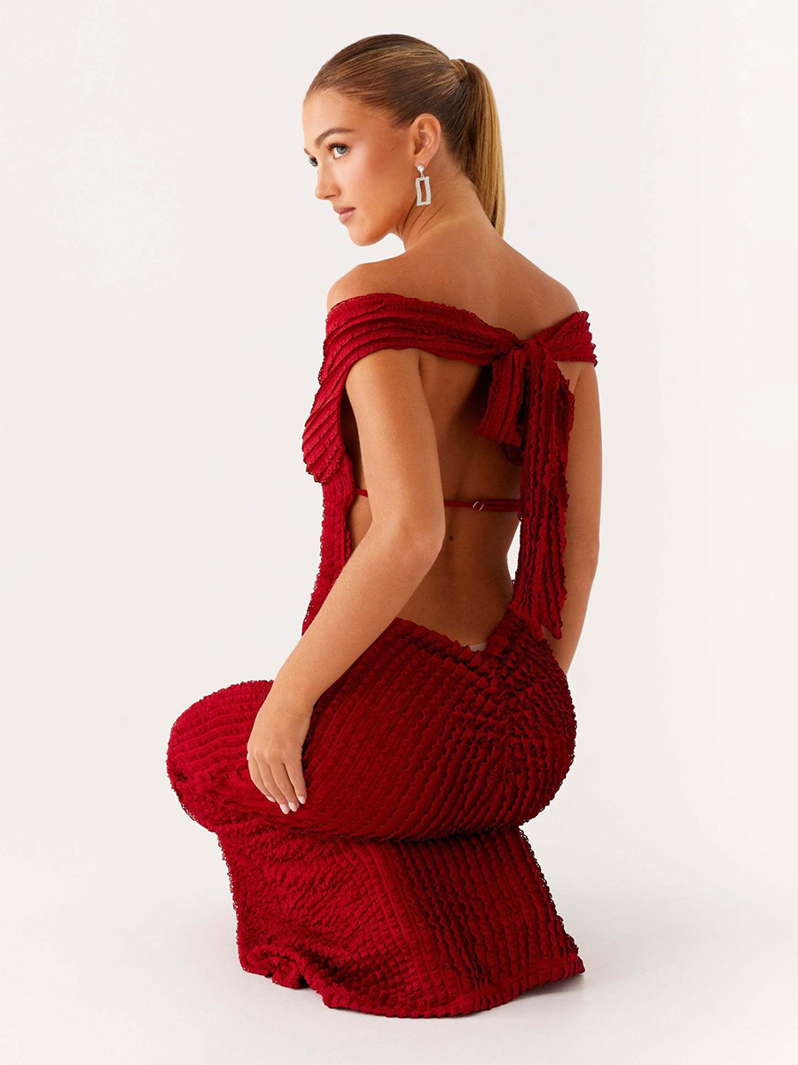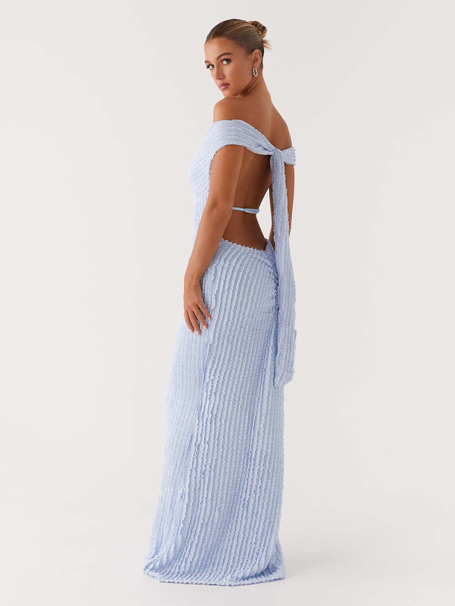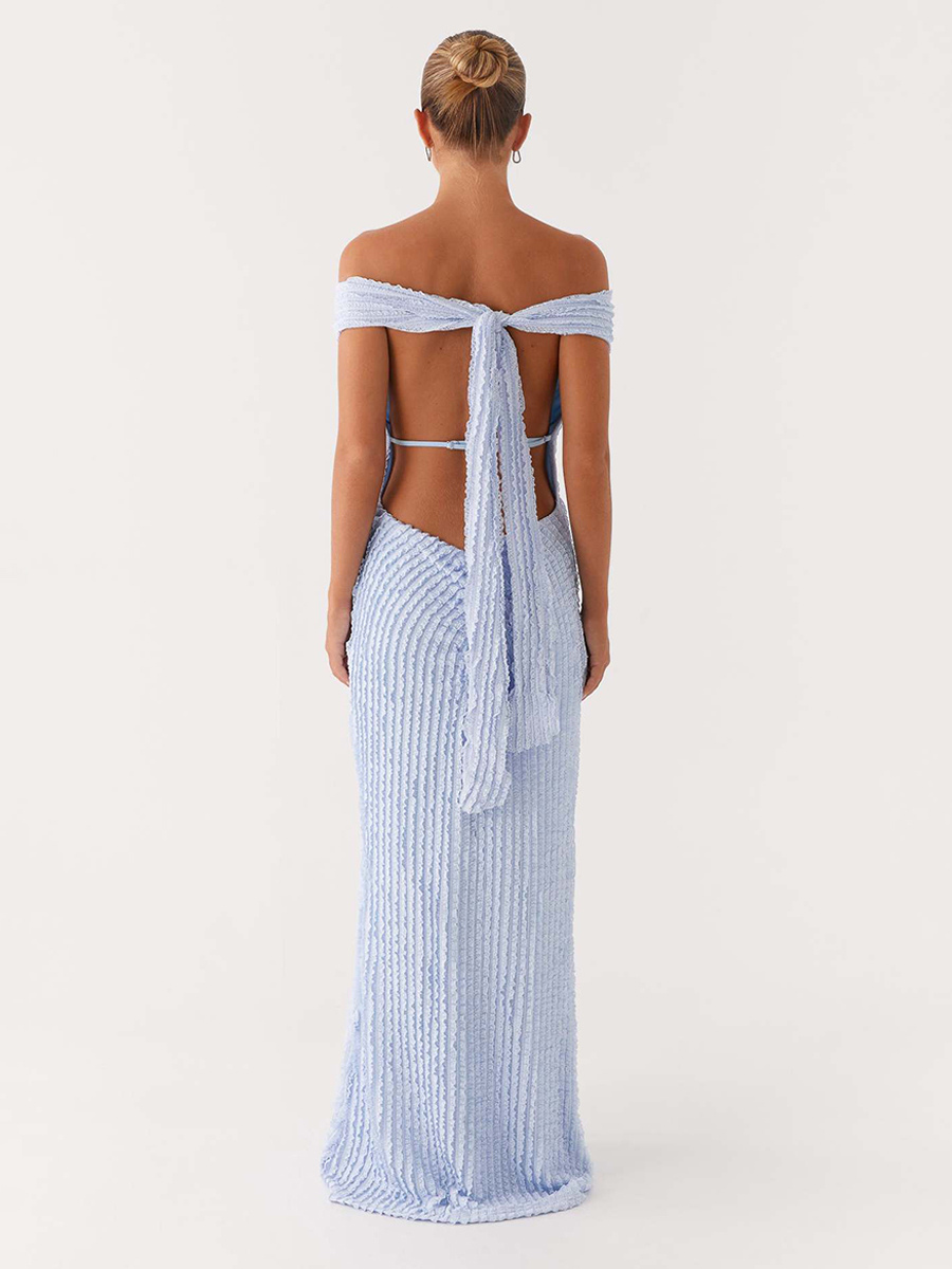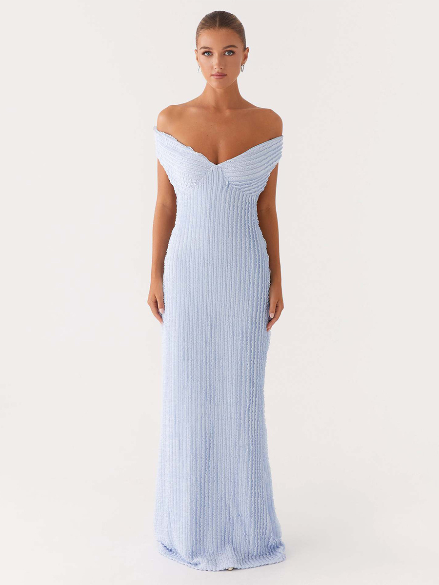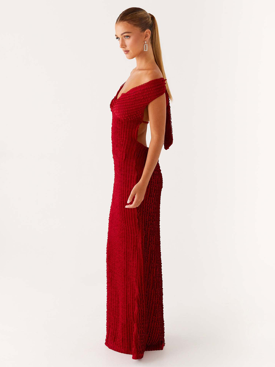 オフショルダーマキシドレス(女性用) - テクスチャード加工の背中開きボディコンマーメイドドレス - 夏の夜の結婚式ゲスト向け 2026