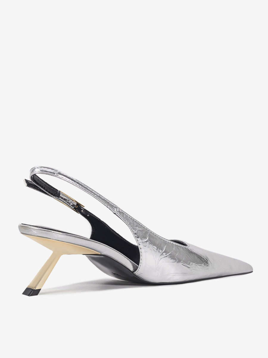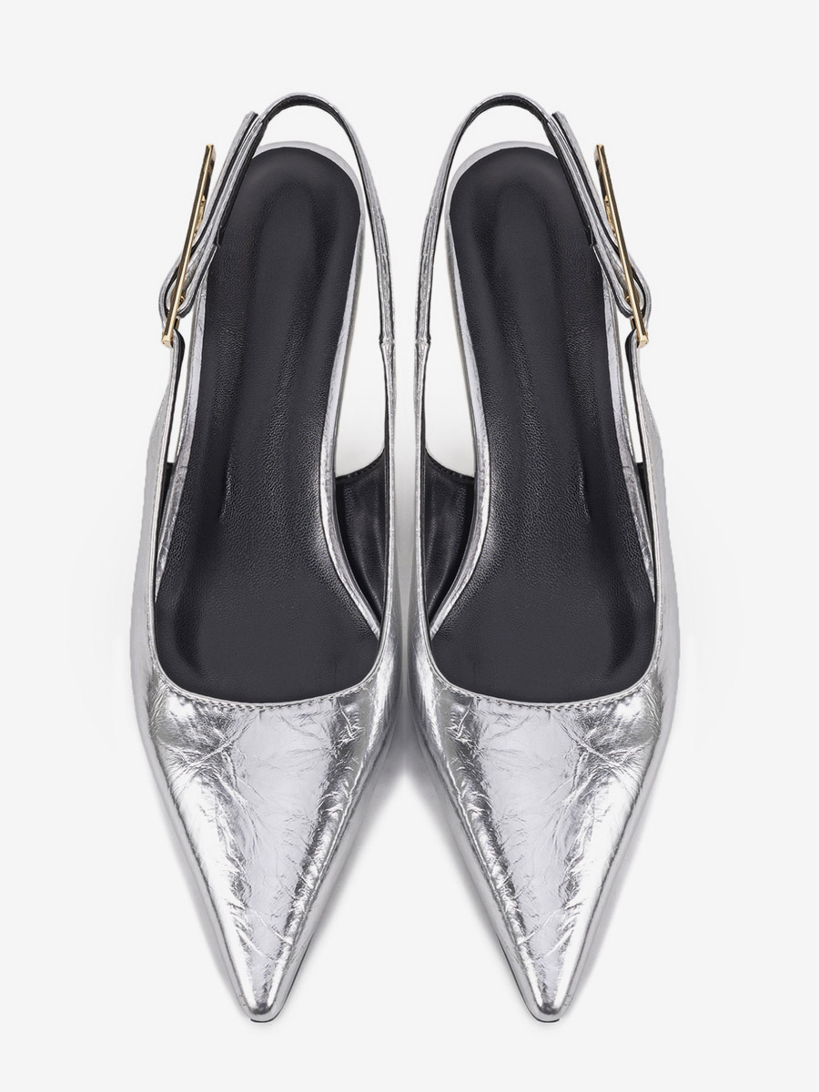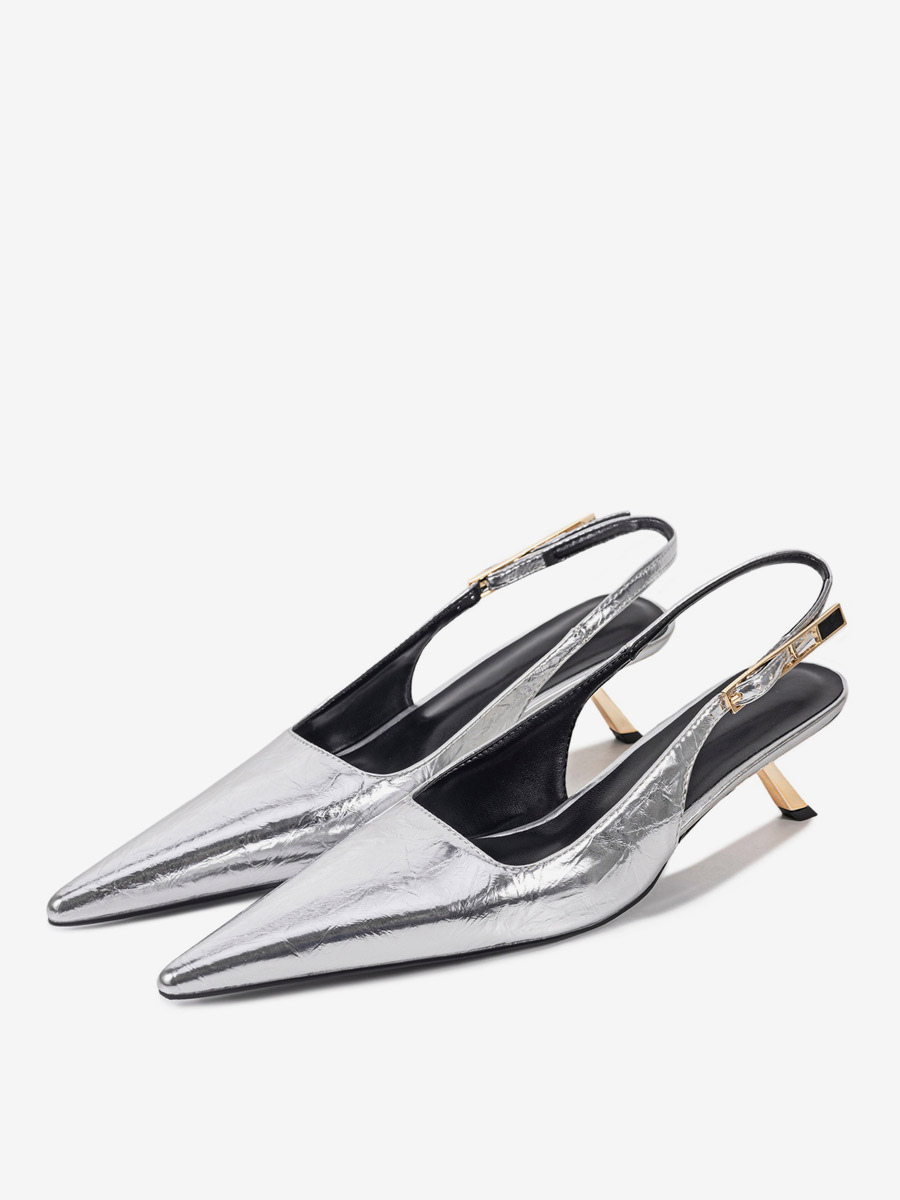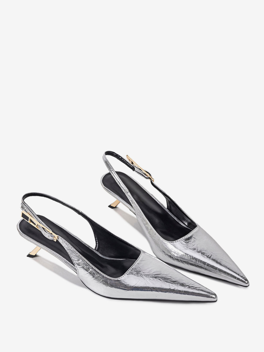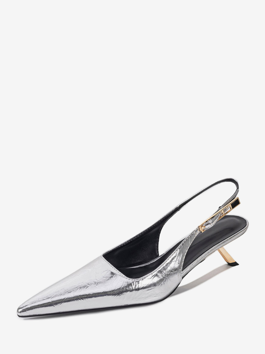 シルバーのハイヒールパンプス、レディース、ポインテッドトゥ、スリングバック、キトゥンヒールパンプス