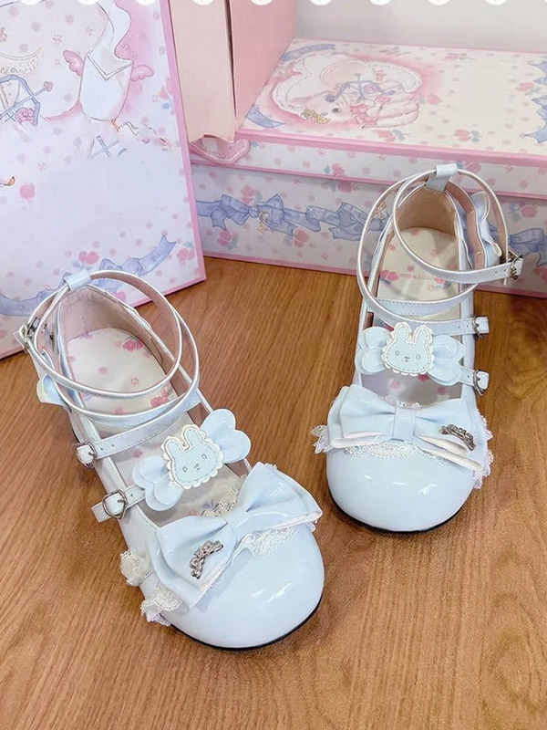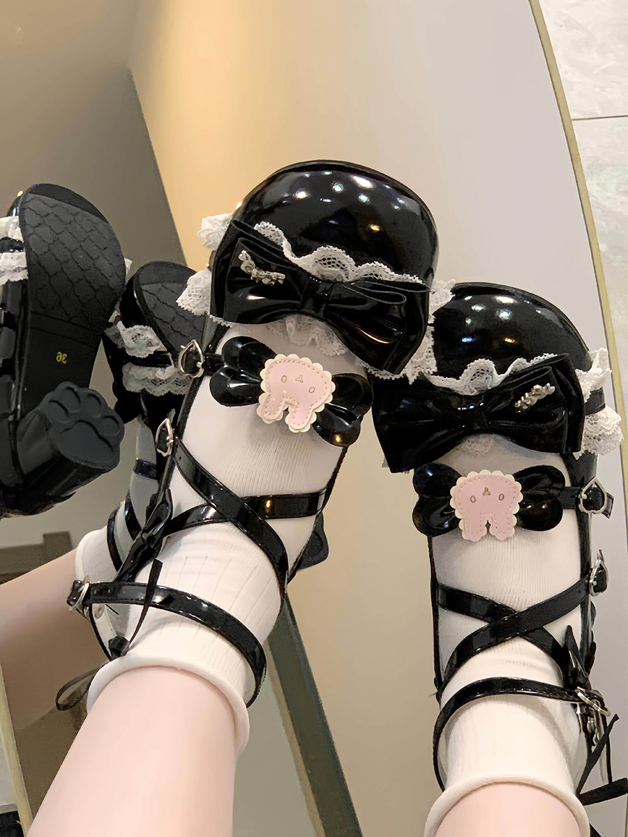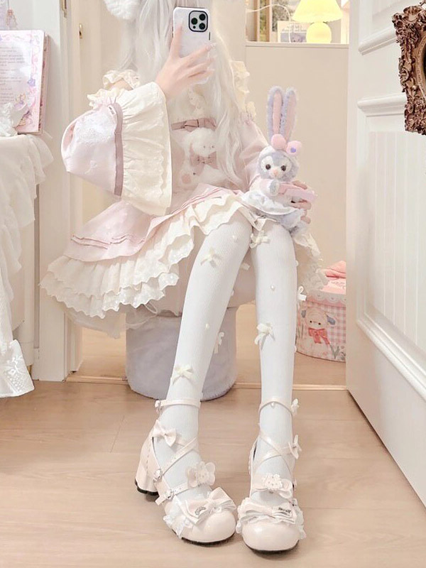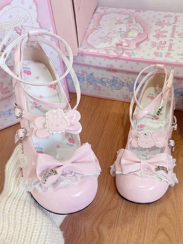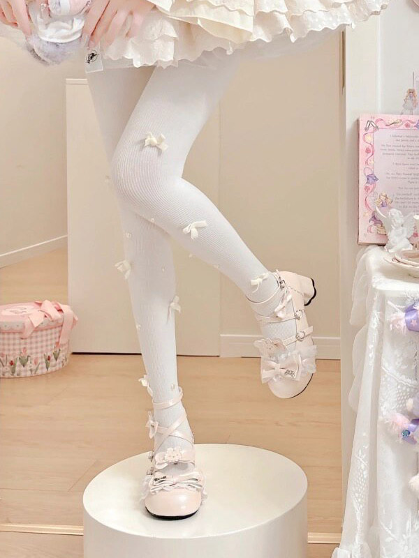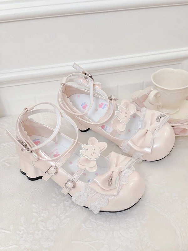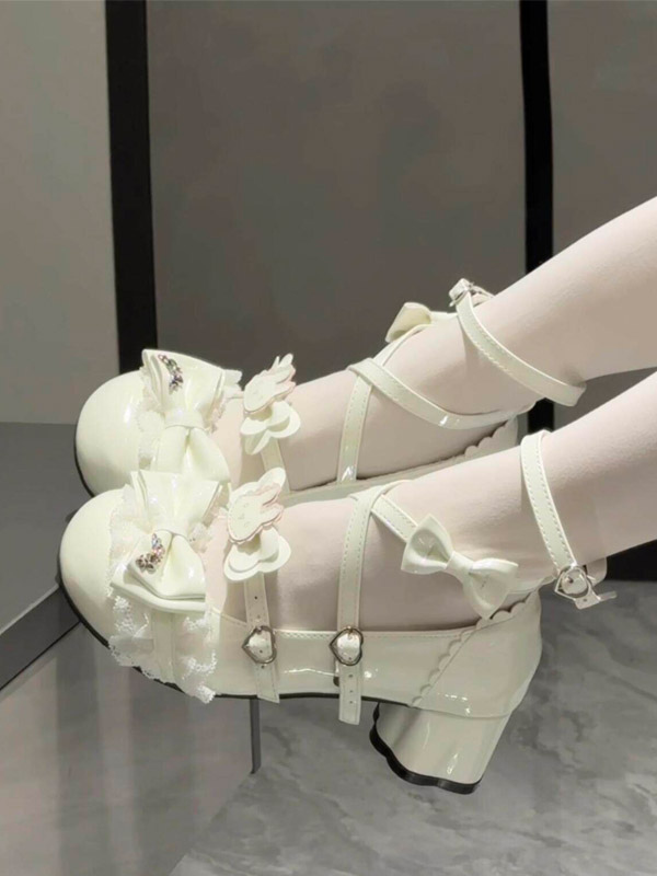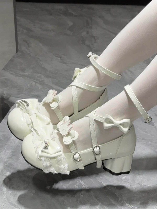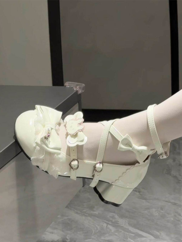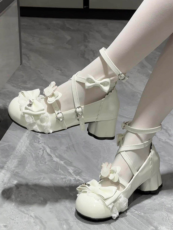 スウィートロリータシューズ エクリュ ホワイト リボン PUレザー アンクルストラップ チャンキーヒール ロリータパンプス