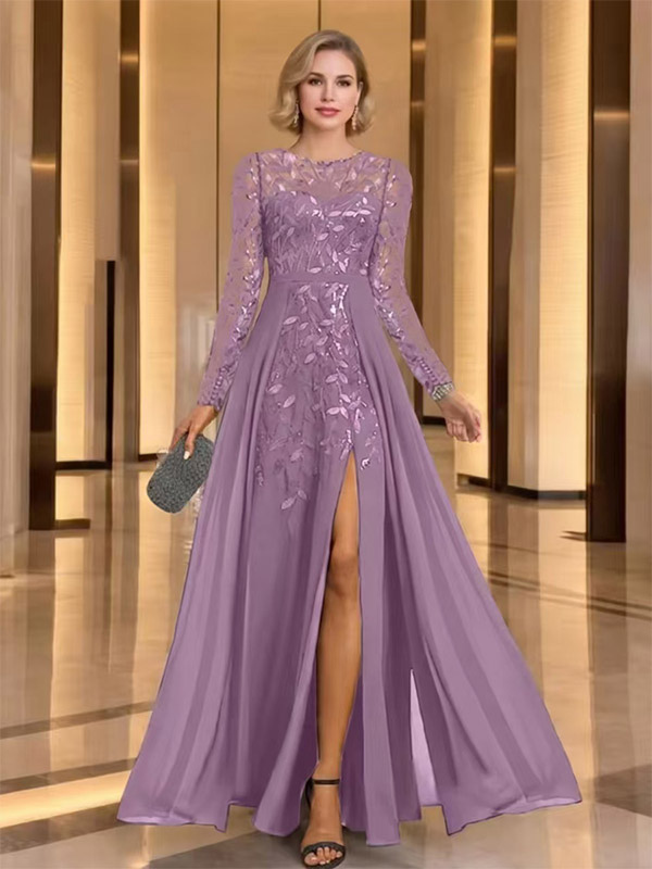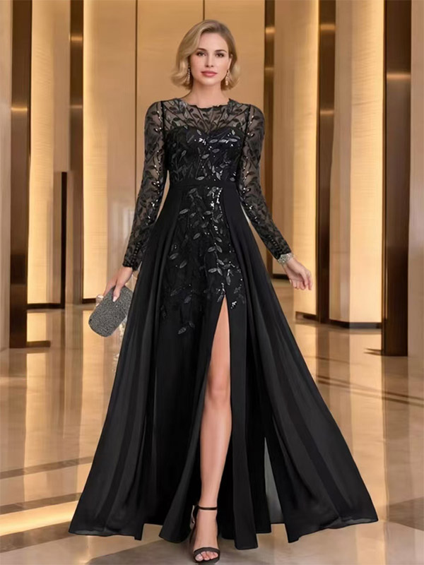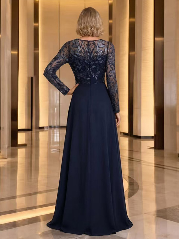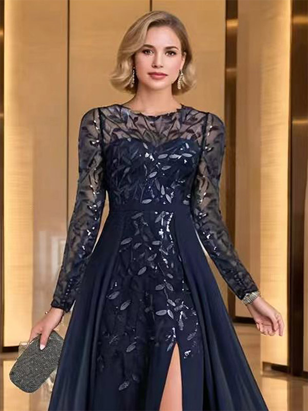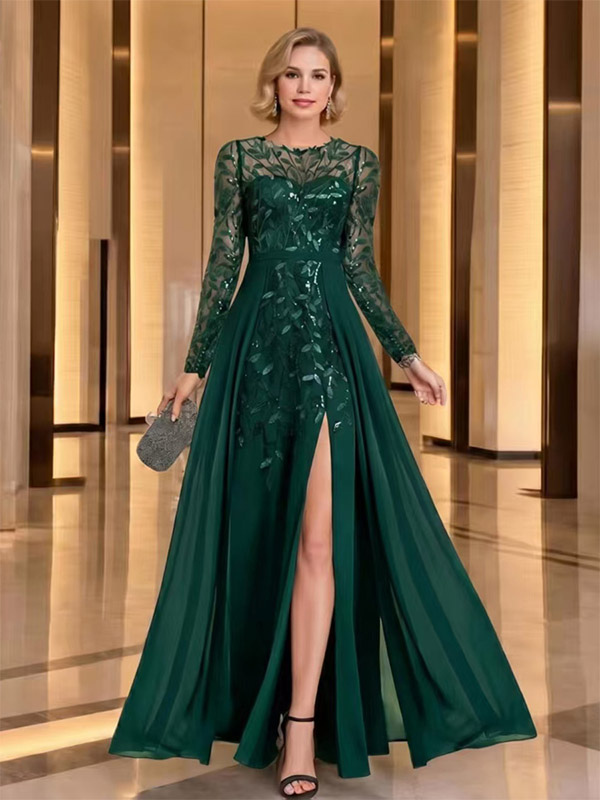 マザーズドレス パーティードレス ジュエルネック 長袖 Aライン スパンコール ウェディングゲストドレス