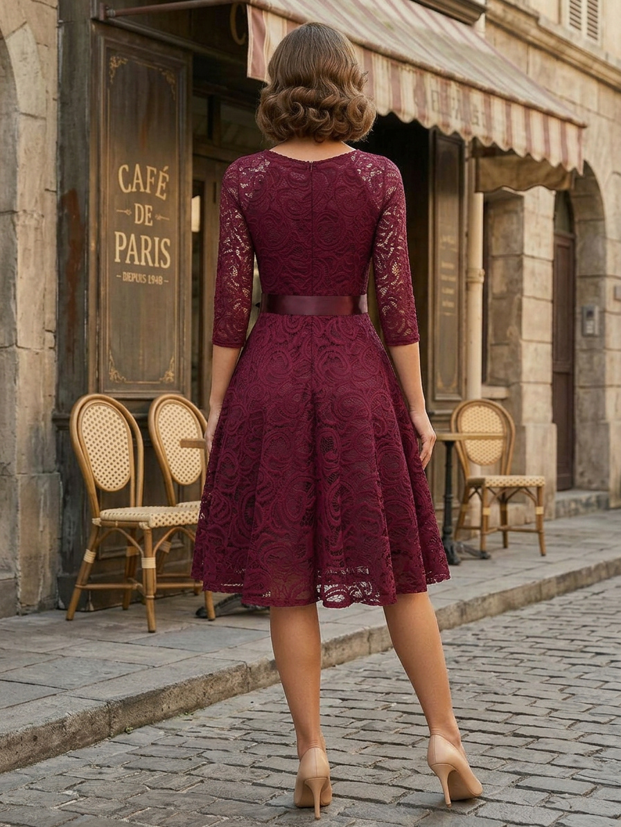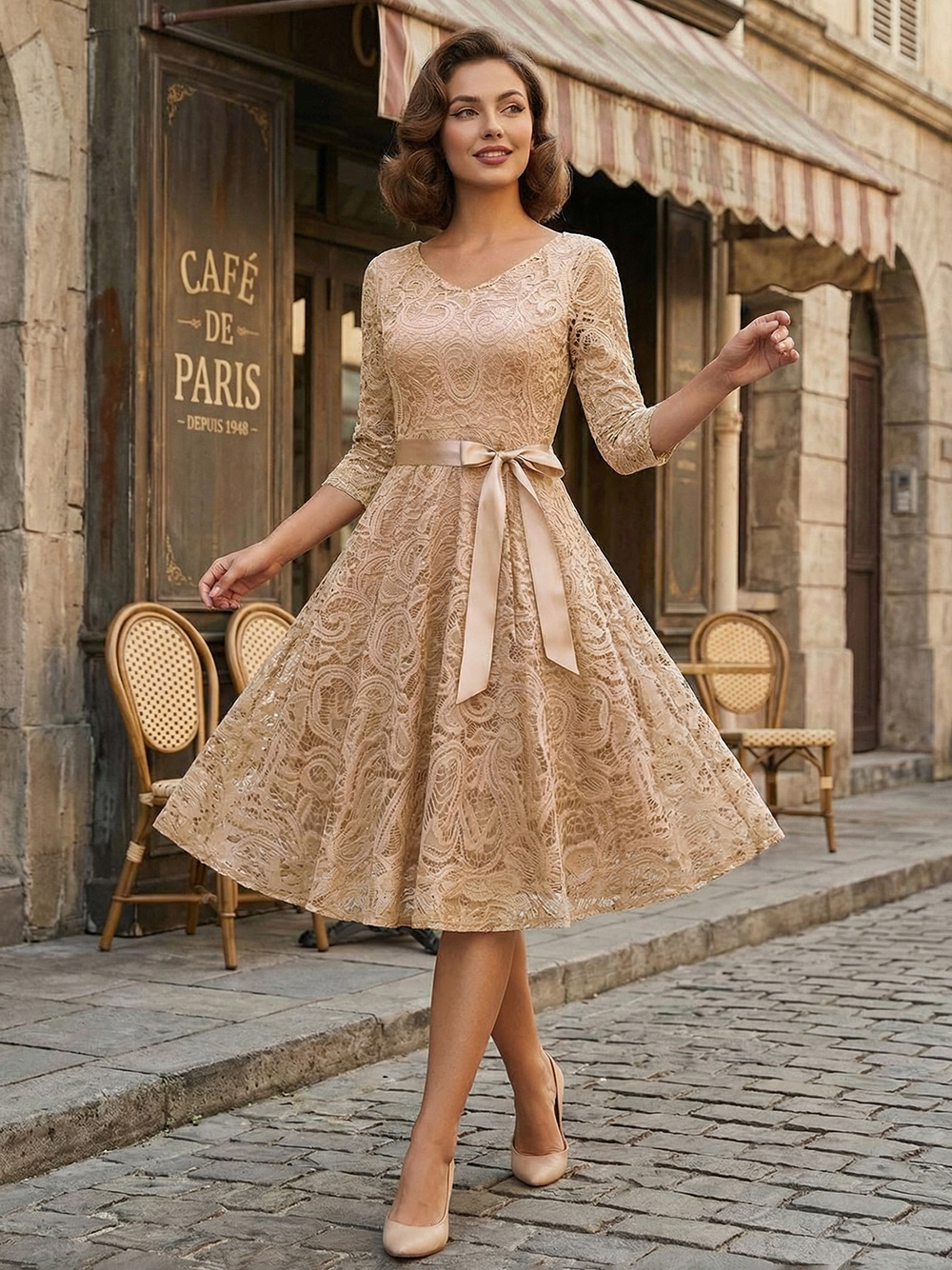 ヴィンテージレーススイングドレス(女性用) - 1950年代風 Vネック 3/4スリーブ ベルト付き Aライン ミディドレス - 春の結婚式ゲスト向け 2026