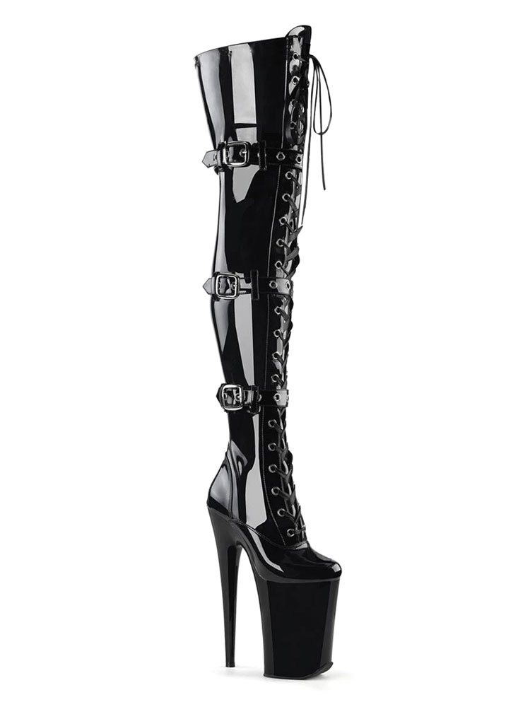 女性のセクシーなブーツラウンドトゥジッパージッパースチレットヒールレイブクラブブラックサイハイブーツ ポールダンスシューズ