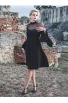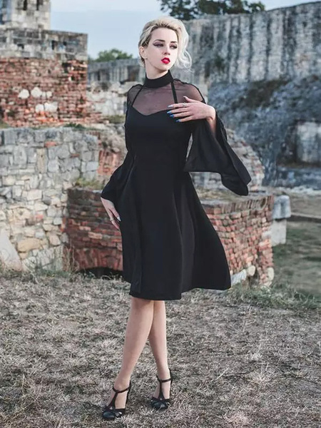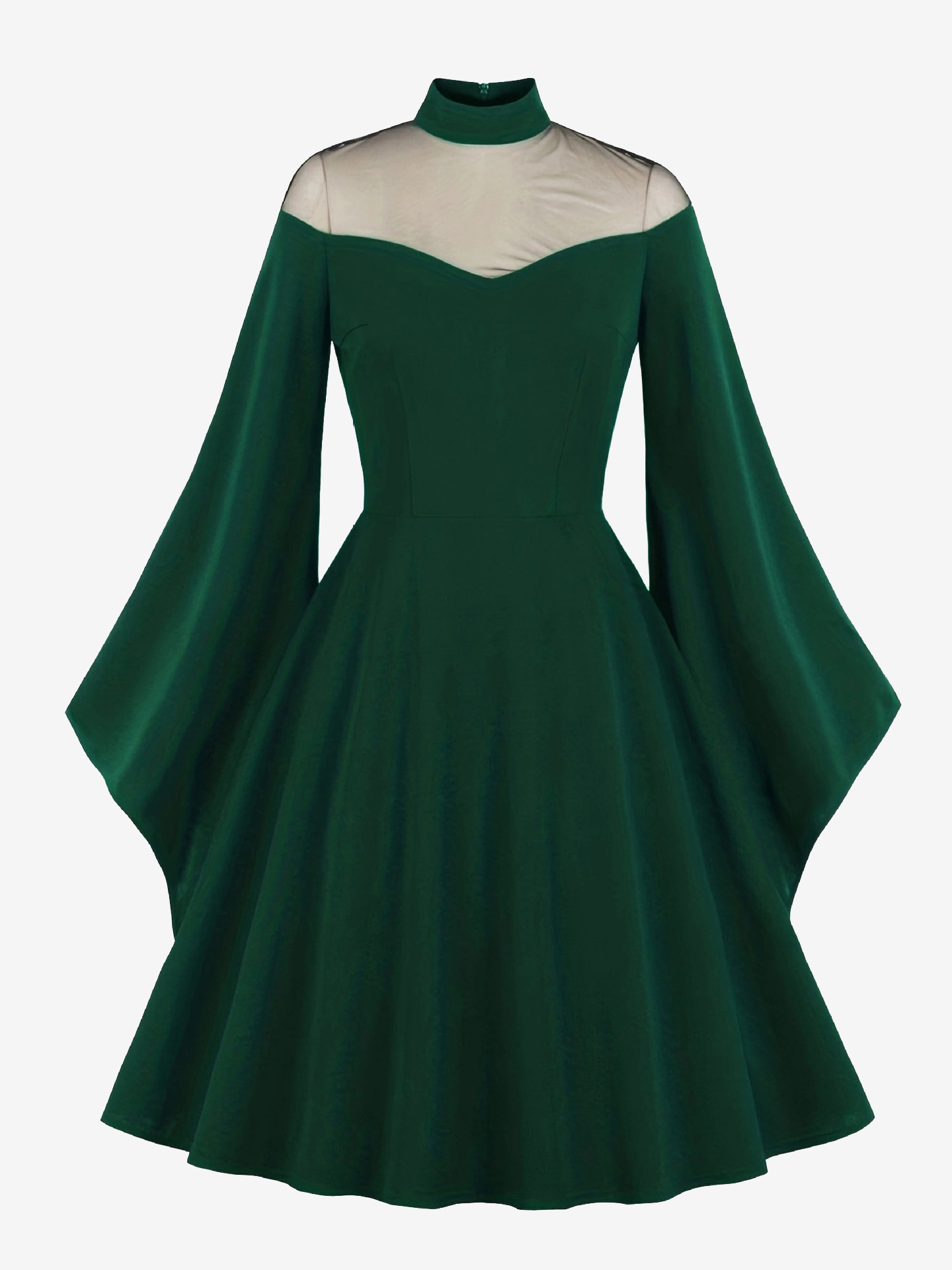 ヴィンテージ1950年代ゴシックカクテルドレス(女性用) - シースルーメッシュネックベルスリーブスイングミディガウン - 春のイブニングパーティー2026