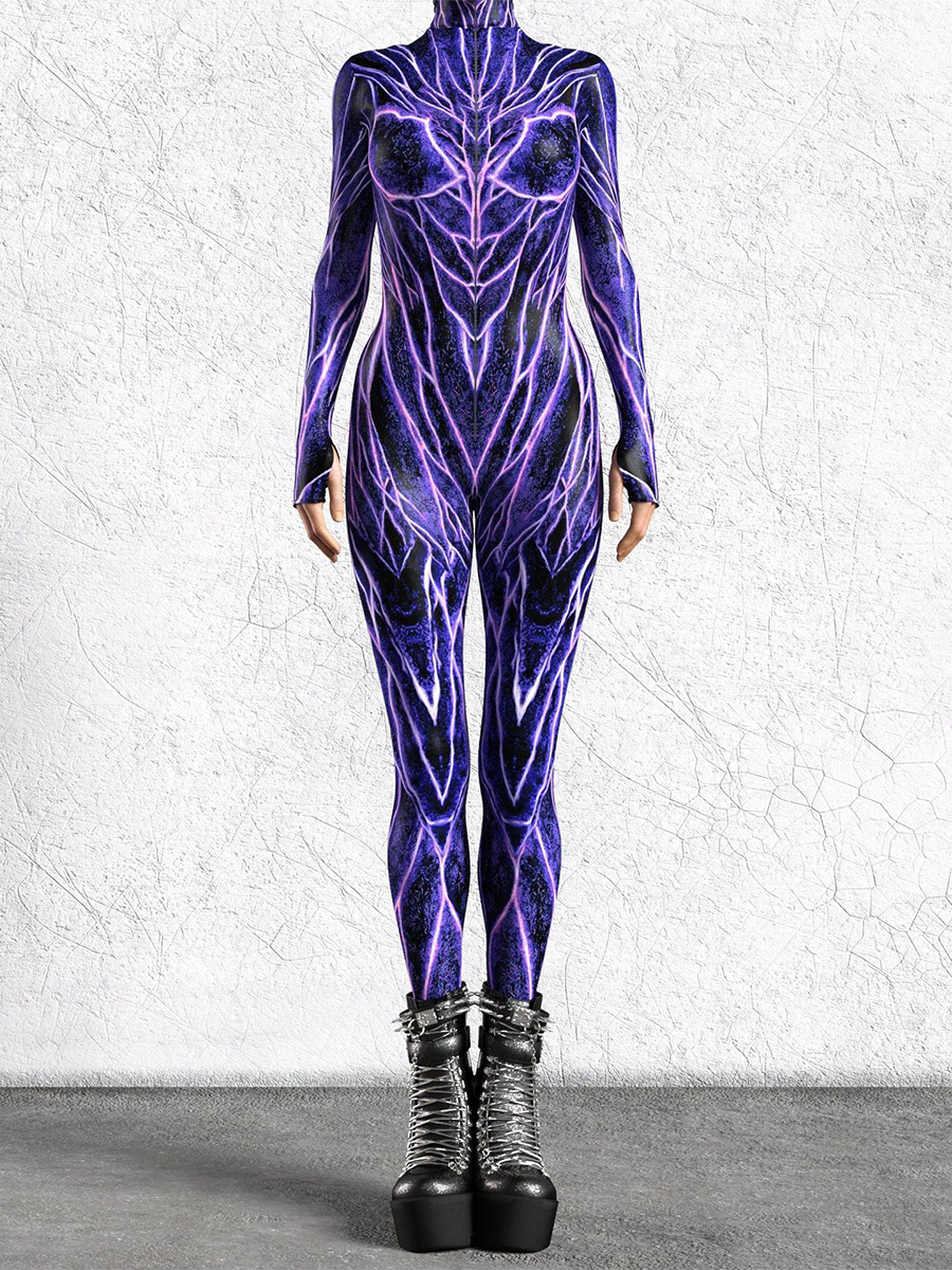 This women's purple vein circuit bodysuit features a intricate 3D-printed biotech pattern, creating a form-fitting jumpsuit that merges organic inspiration with futuristic cybernetic aesthetics.