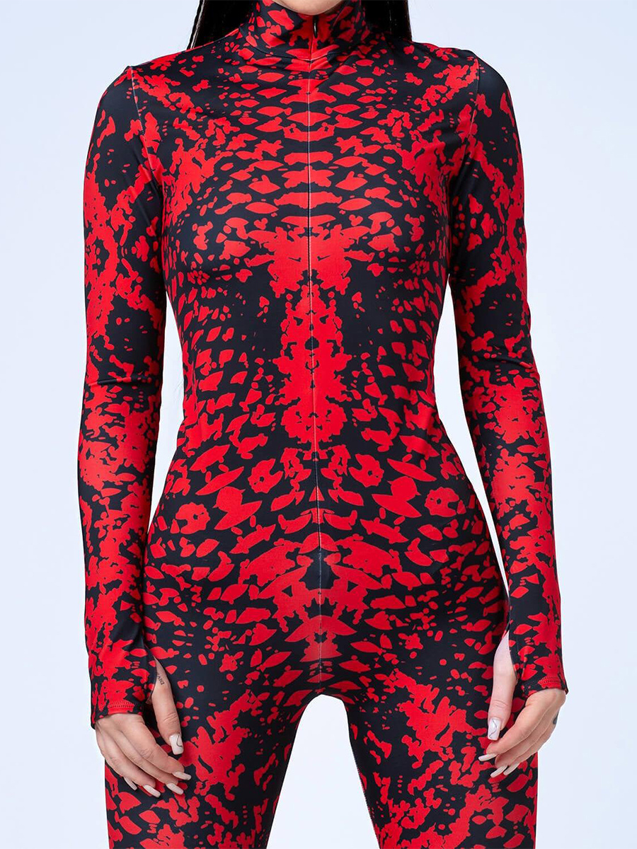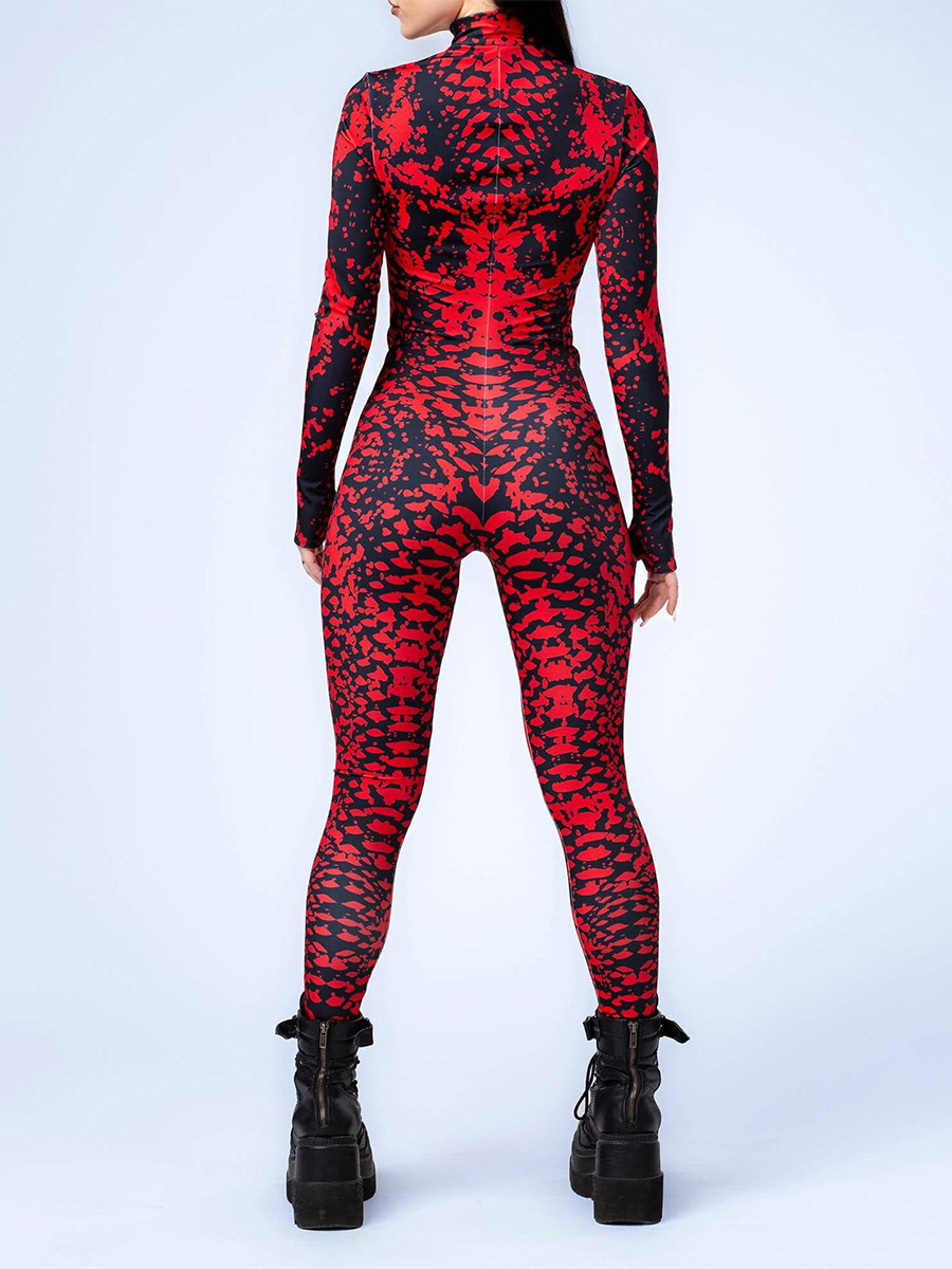 This women's red and black marble texture bodysuit features intricate 3D-printed vein patterns, creating a form-fitting jumpsuit with bold, luxurious contrasts and sensual contours.