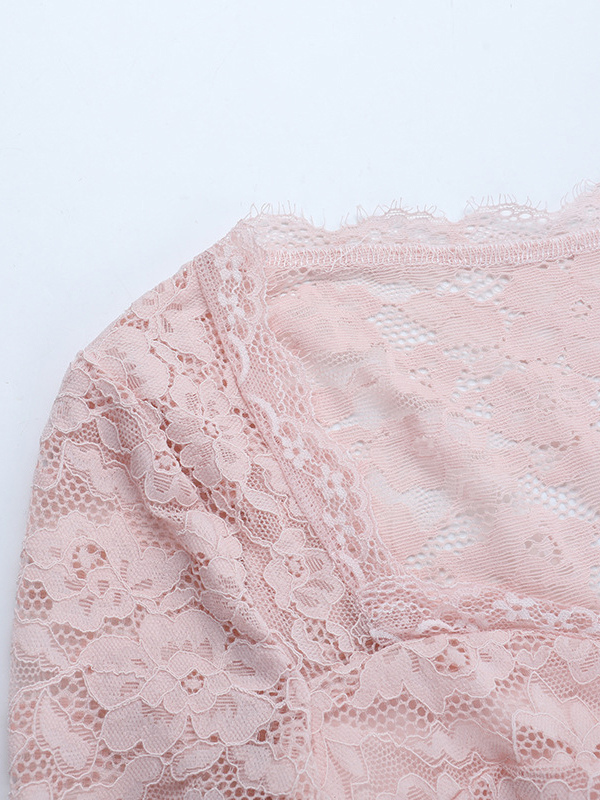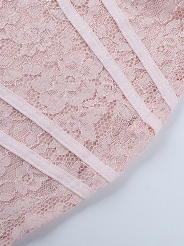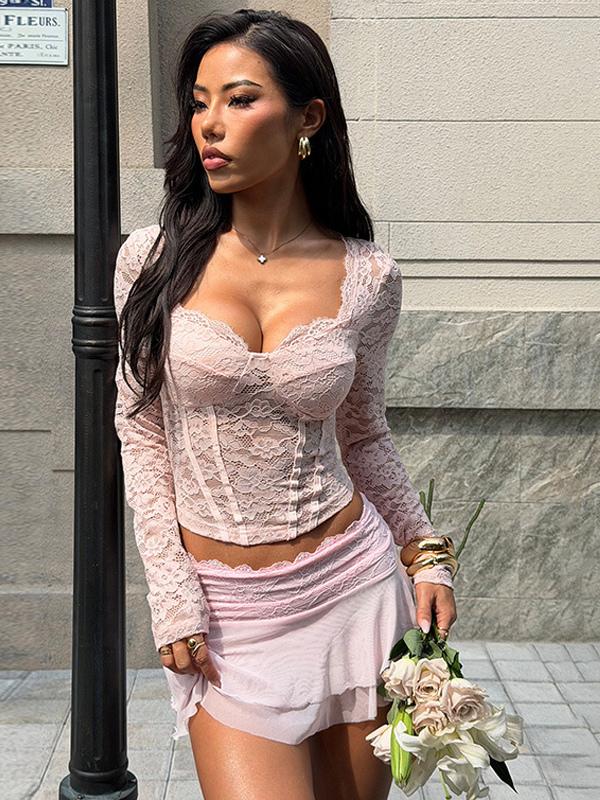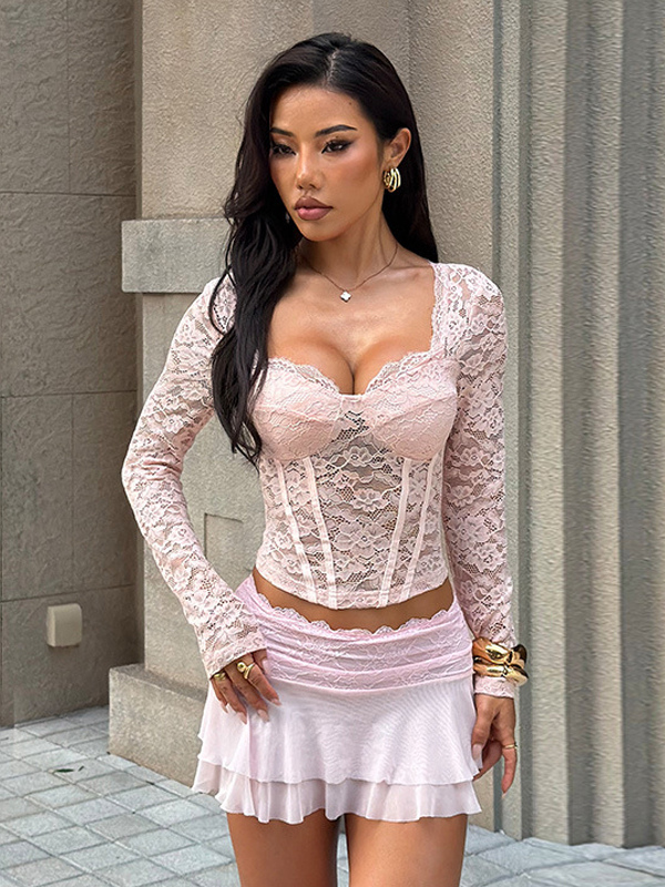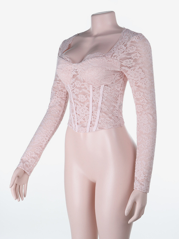 ピンクのコルセット風レーストップス(女性用) - エレガントな長袖ハートネックビスチェブラウス - 春の夜のお出かけにぴったりのクラブウェア 2026