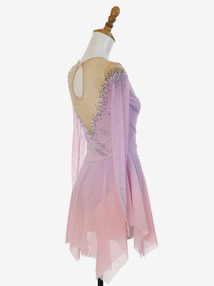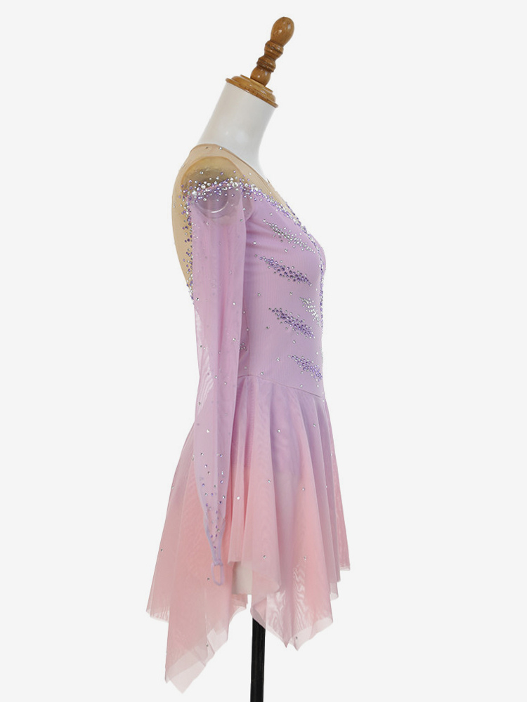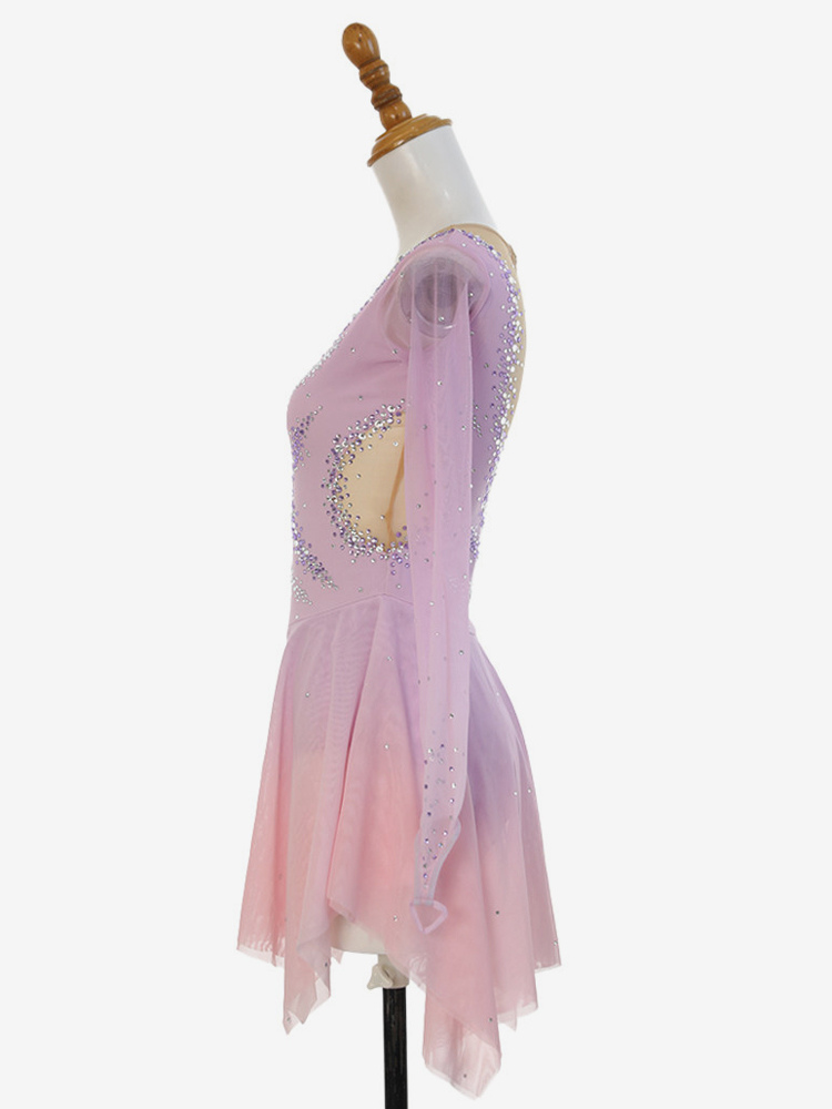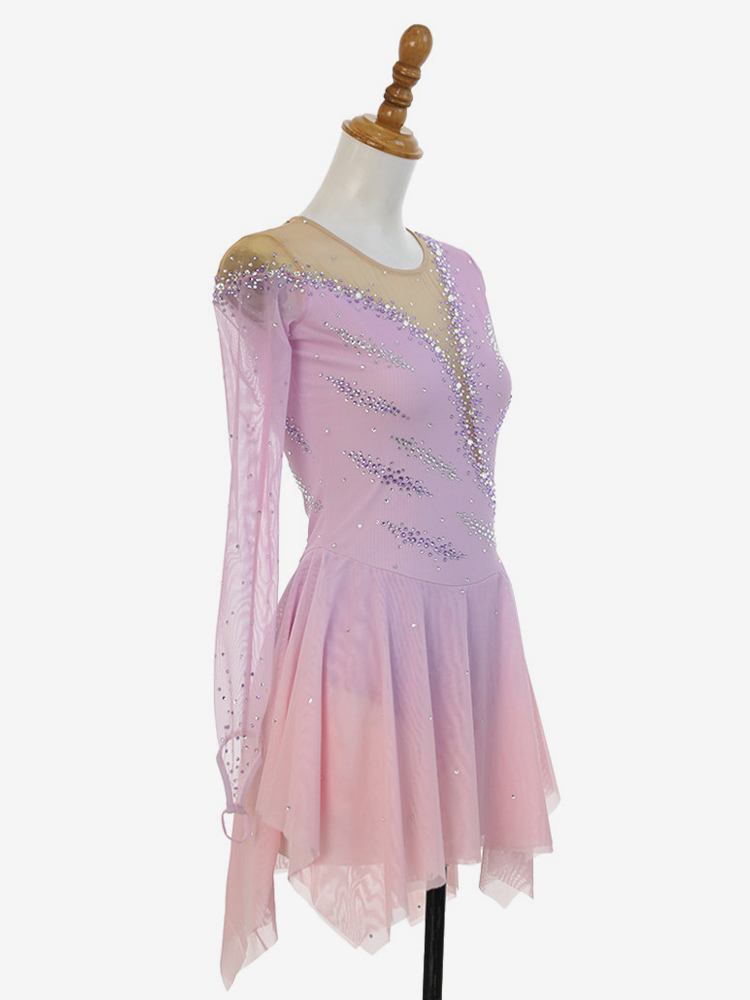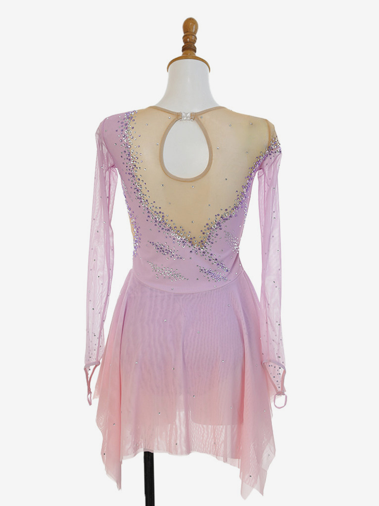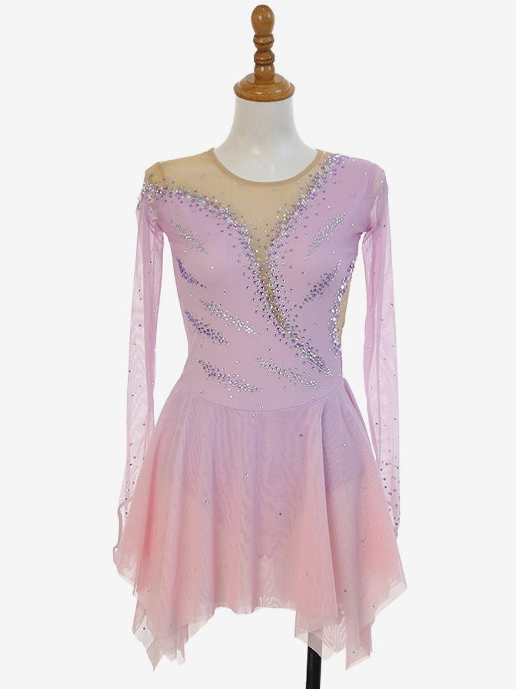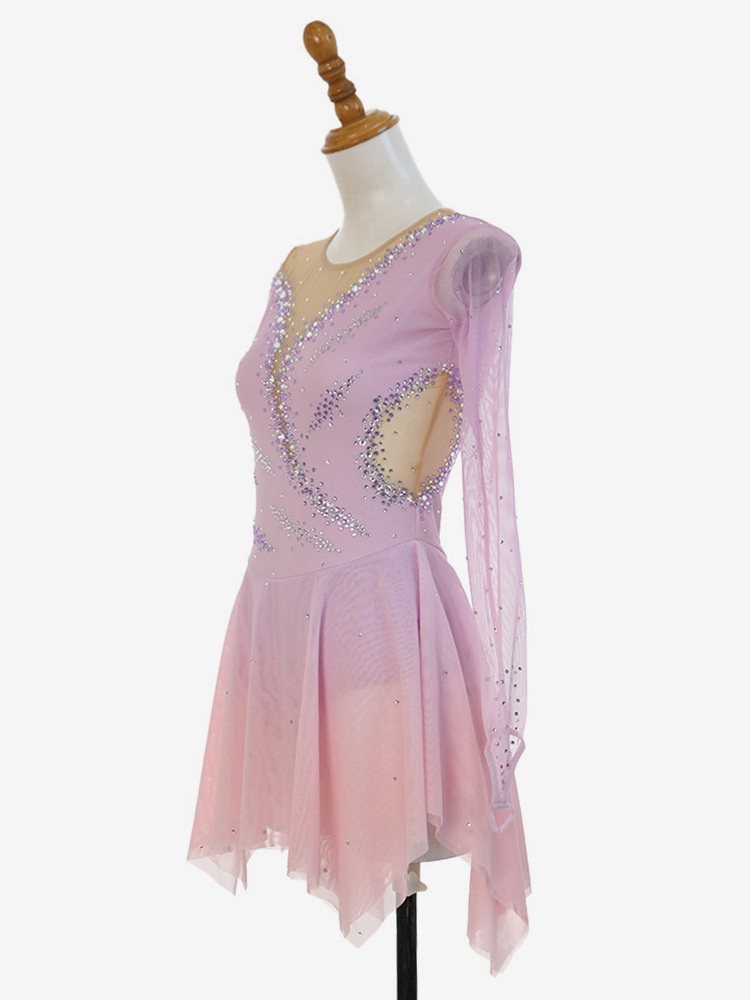 ピンクのキラキララインストーンフィギュアスケートドレス(長袖、全年齢対象)
