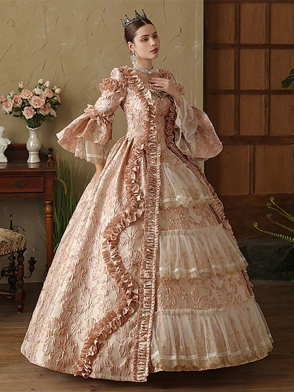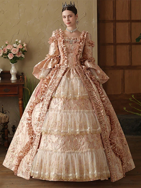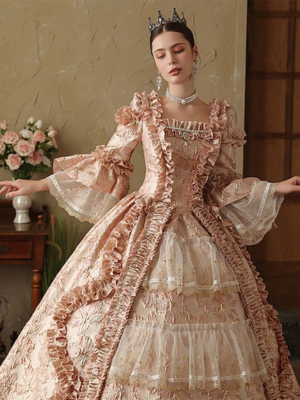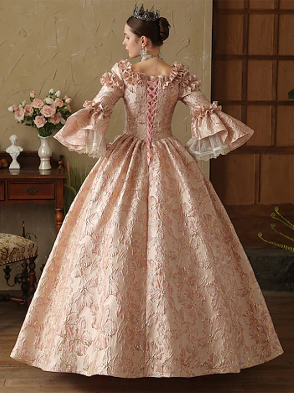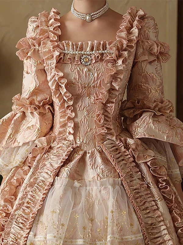 ピンクのレディースビクトリアンロココドレス 長袖 レースアップ フリル ヴィンテージドレス