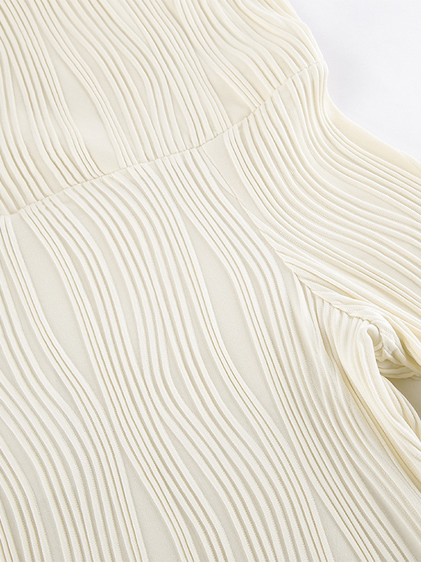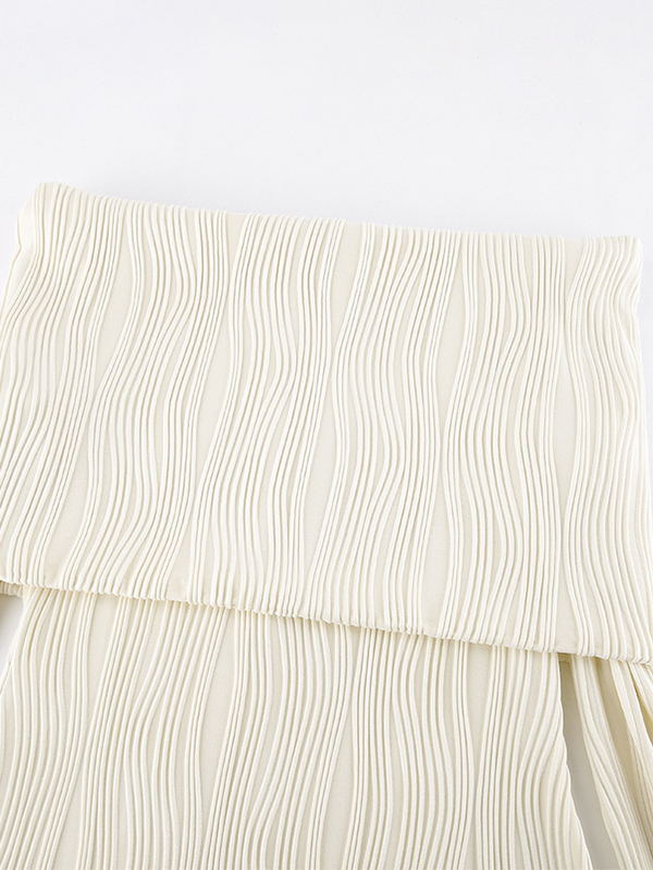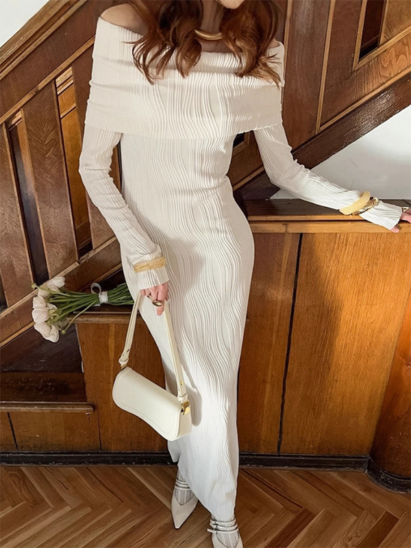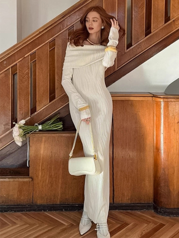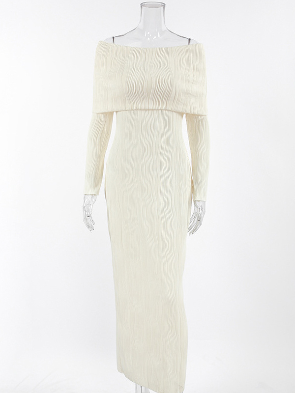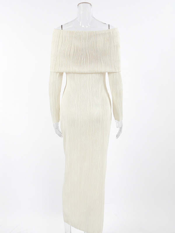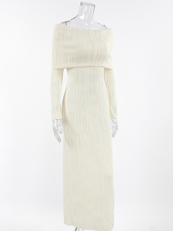 プリーツオフショルダーレディースマキシドレス - エレガントなクリームテクスチャボディコンガウン - 長袖パーティーウェア 2026