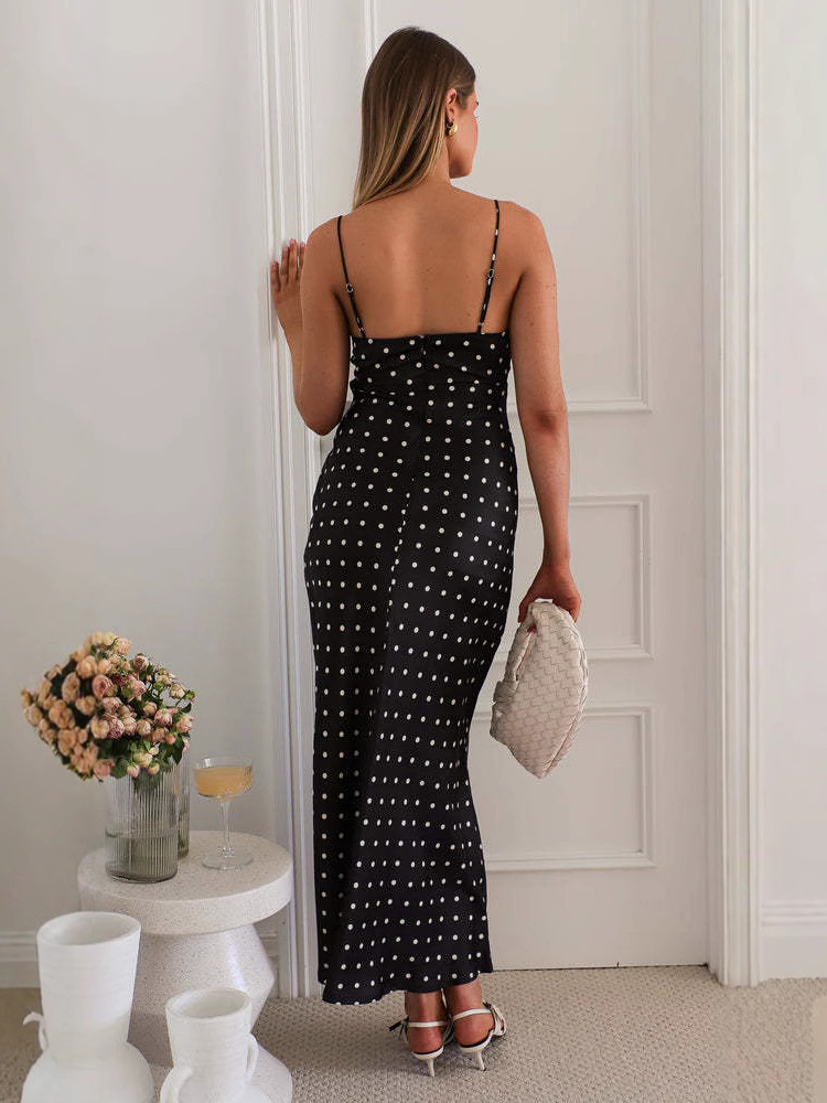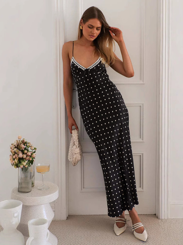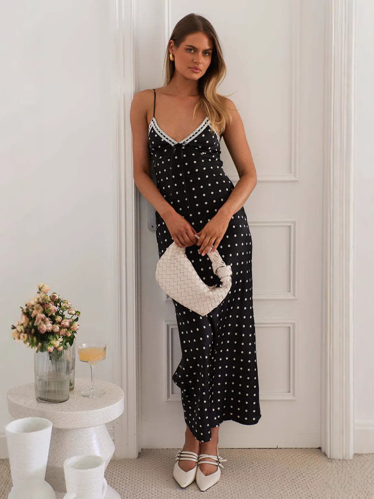 水玉模様のキャミソールマキシドレス(レディース) - フレンチシックなレーストリム、タイフロント、スリムなスリップドレス - 夏のピクニックパーティー 2026
