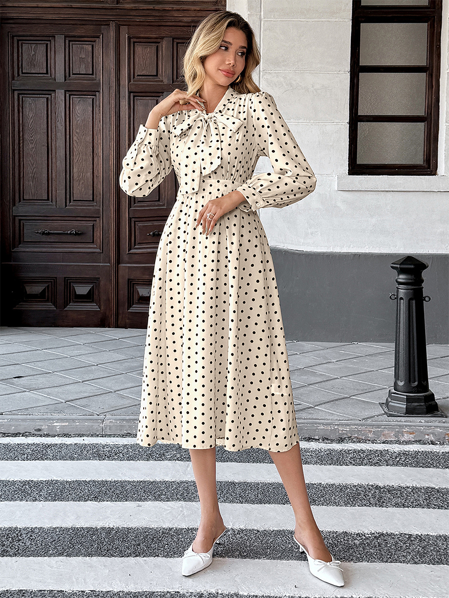 2025年レディース向け、ドット柄ミディ丈ワンピース(ボウネック)