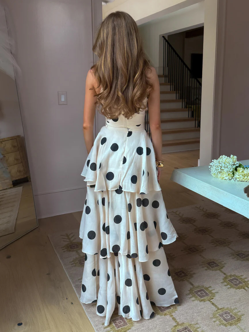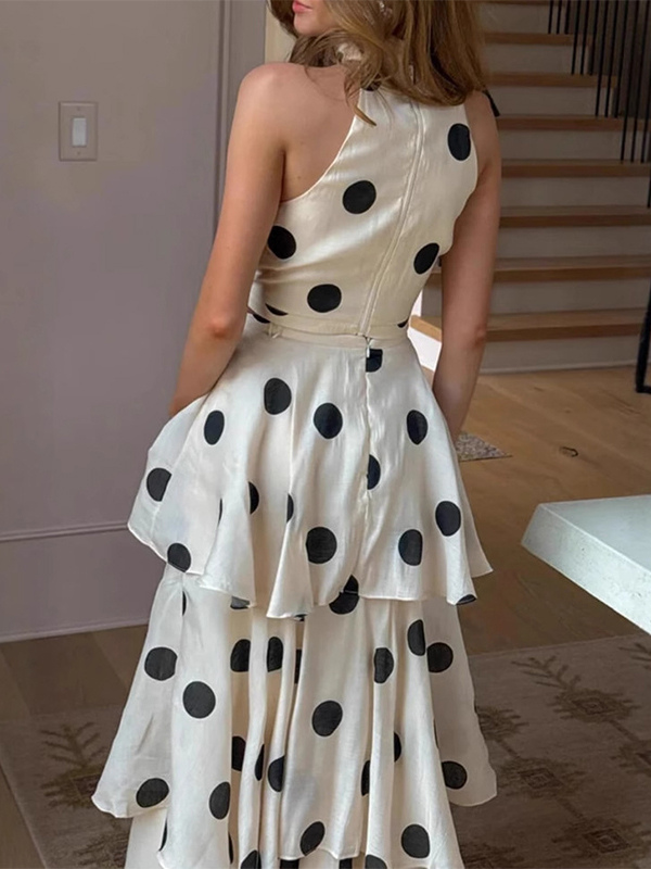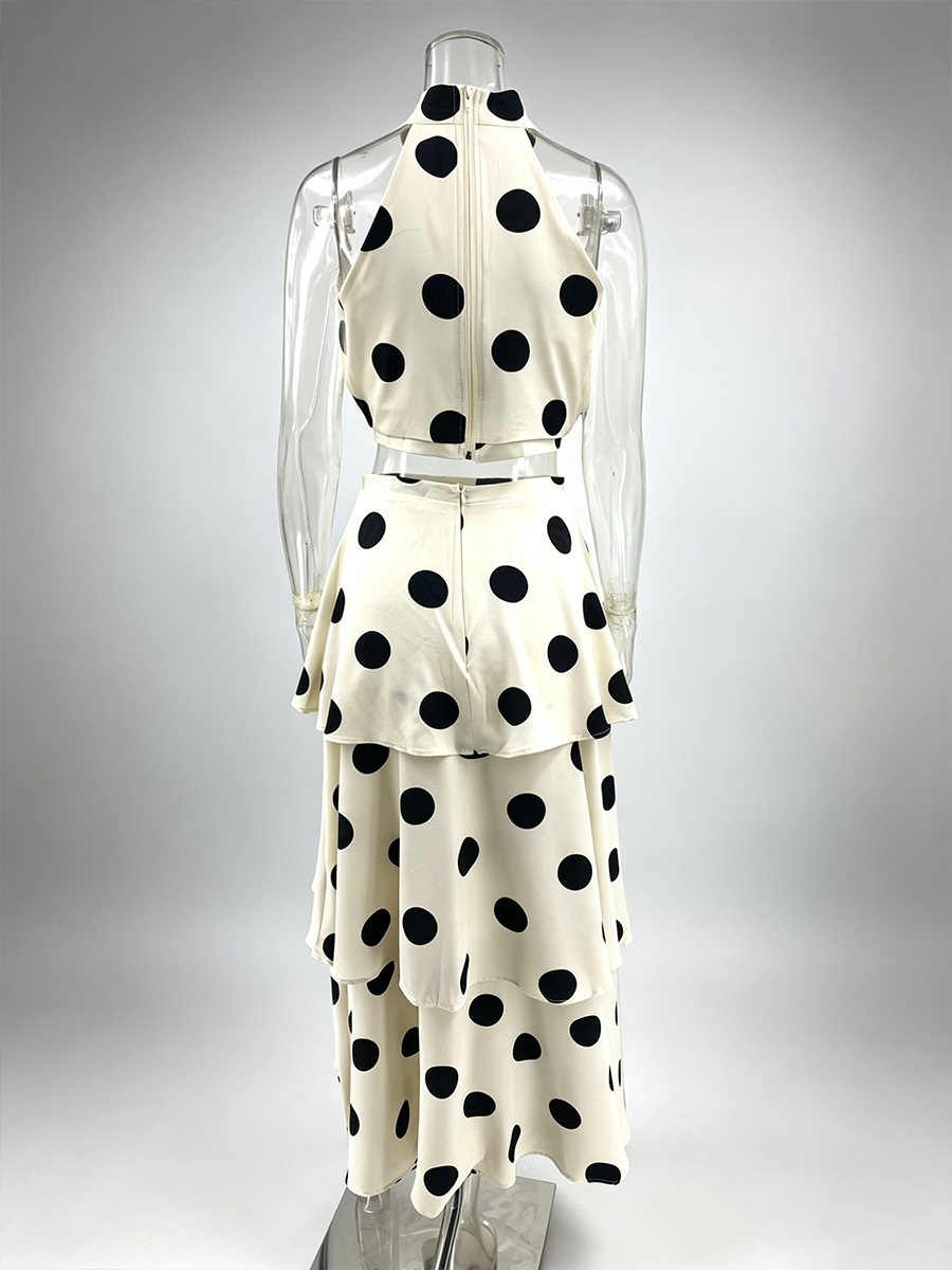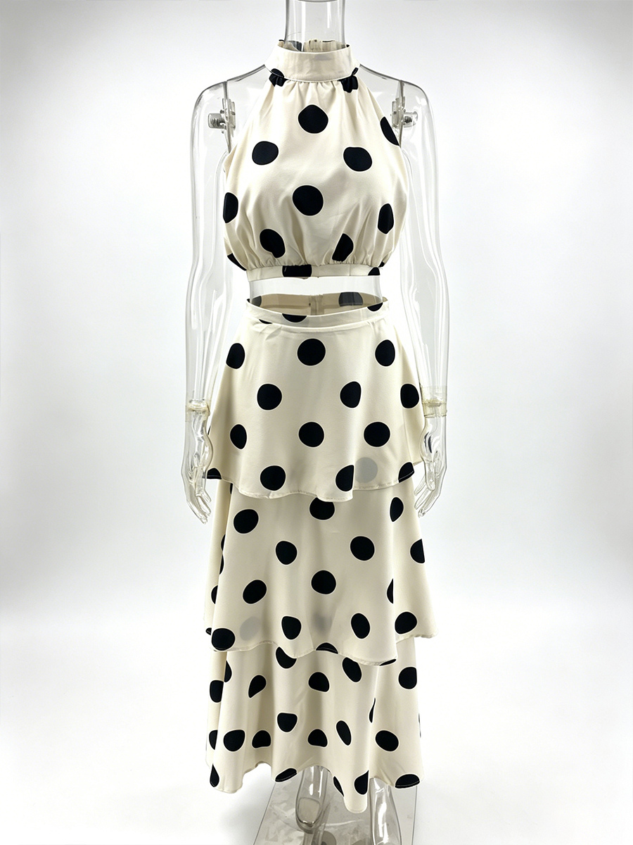 水玉模様のスカート2点セット(レディース) - レトロなホルターネッククロップトップとティアードマキシスカート - サマーガーデンパーティー2026