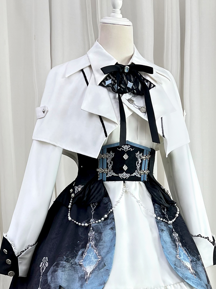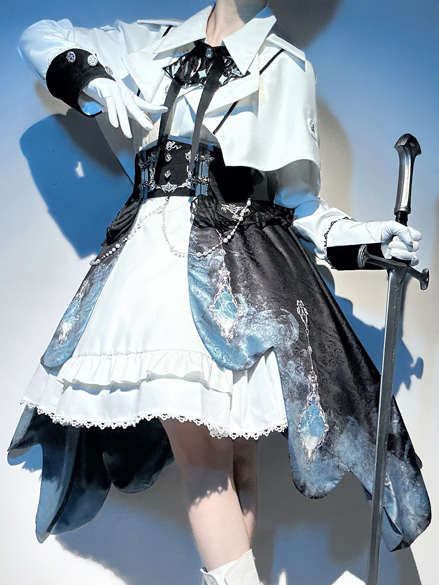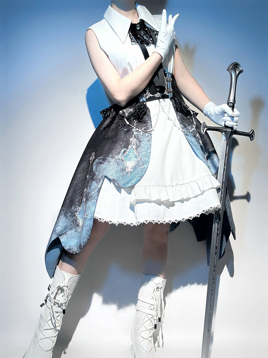 This Prince Lolita set features a sleeveless dress, a long sleeve cape, and a detachable train skirt, combining knight-inspired tailoring with elegant Ouji Lolita aesthetics for a noble yet whimsical three-piece ensemble.