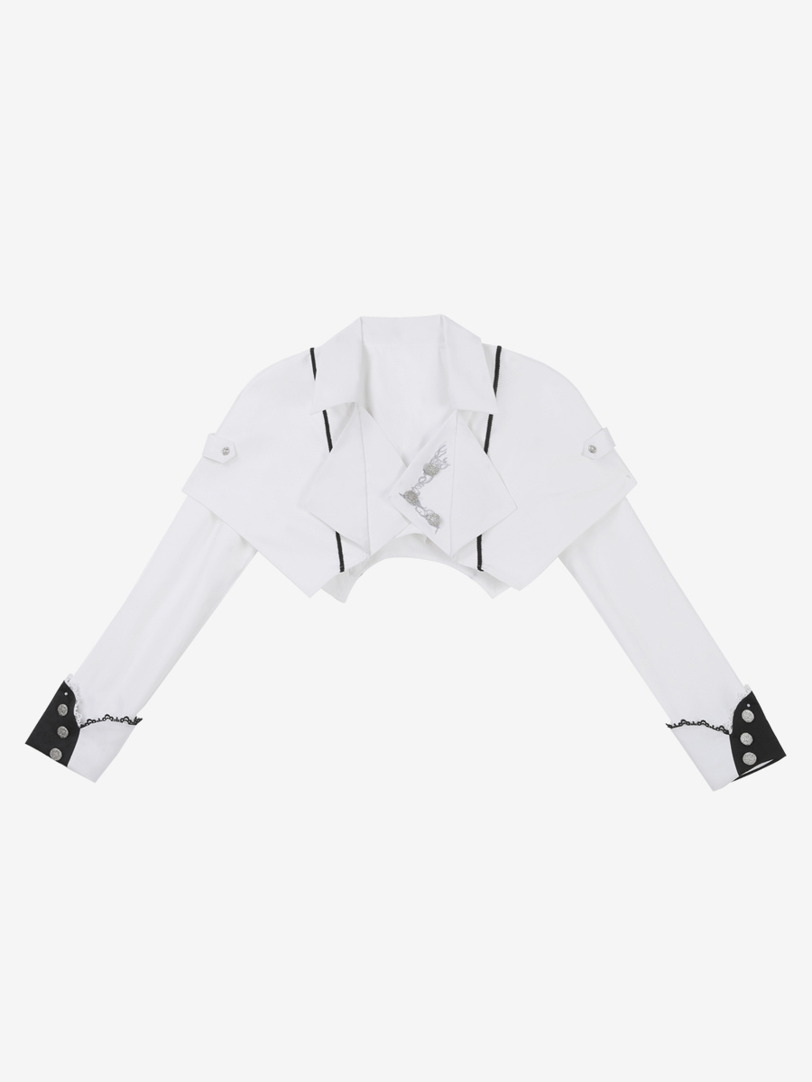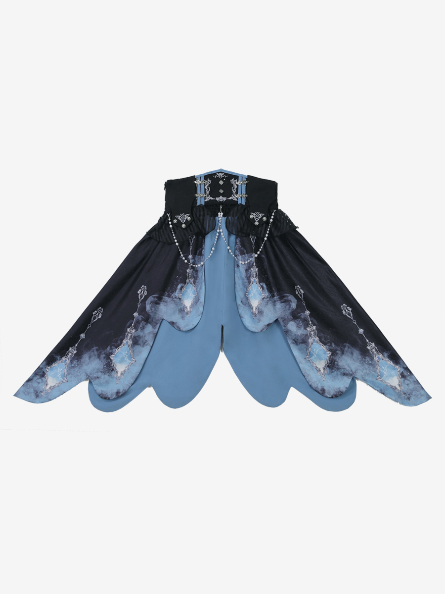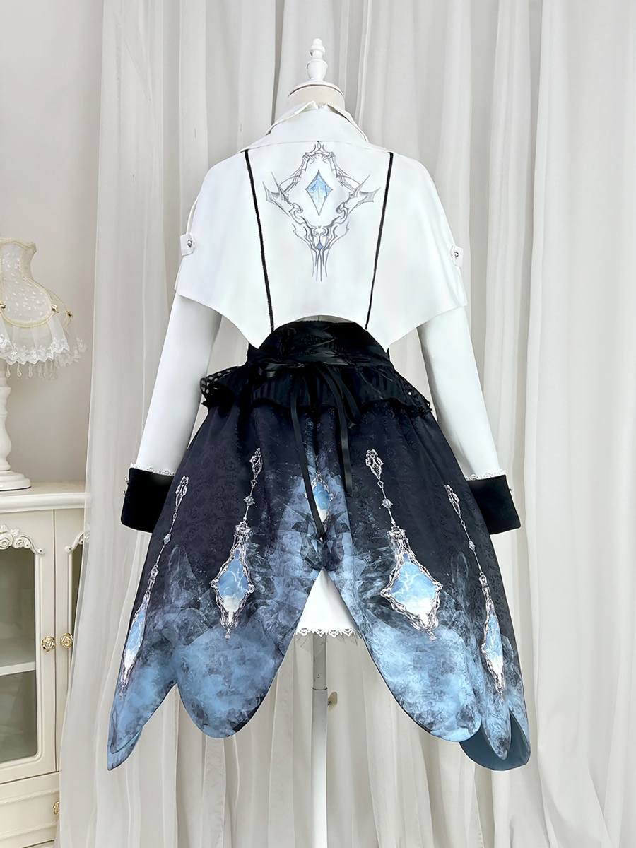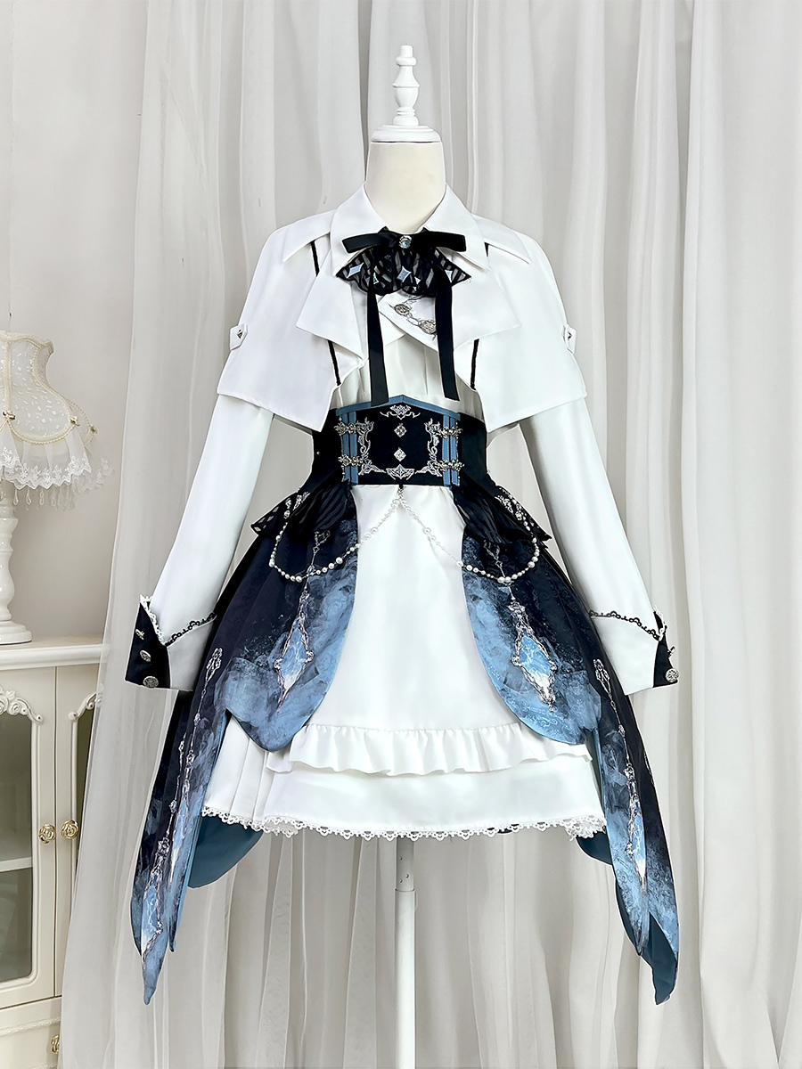 This Prince Lolita set features a sleeveless dress, a long sleeve cape, and a detachable train skirt, combining knight-inspired tailoring with elegant Ouji Lolita aesthetics for a noble yet whimsical three-piece ensemble.