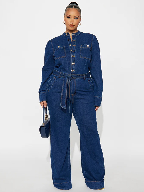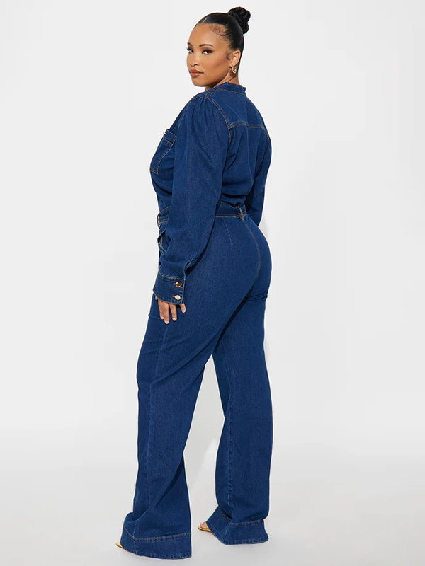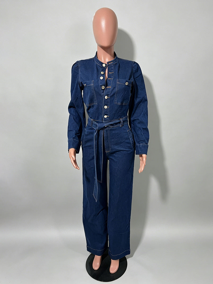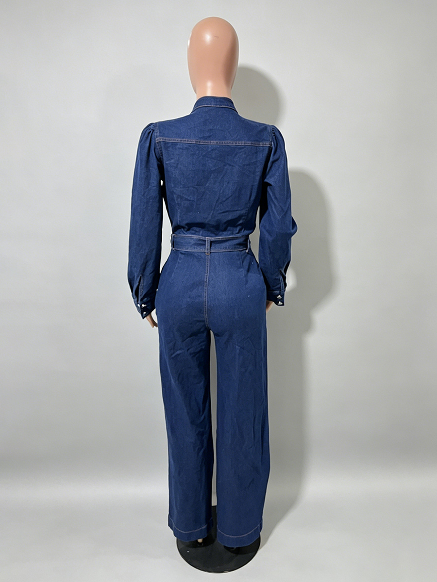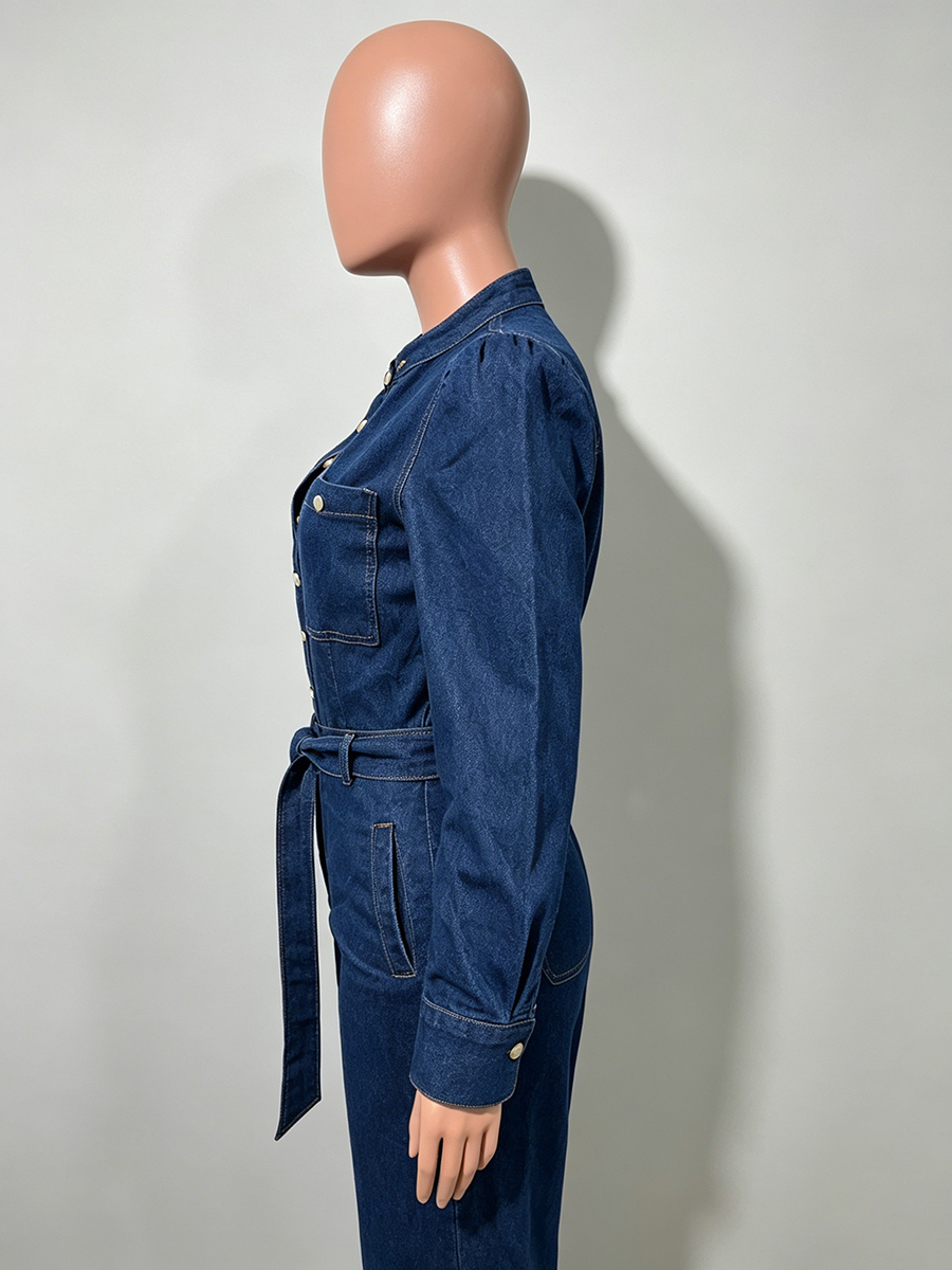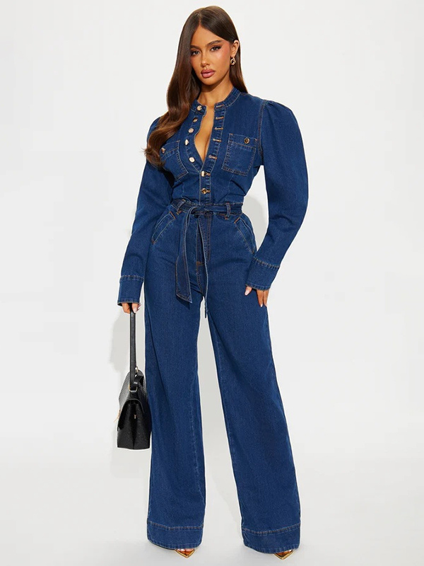 パフスリーブデニムジャンプスーツ(レディース) - ダークブルー レトロ ワイドレッグ ベルト付き ボタンフロント ロンパース - 春のカジュアルパーティウェア 2026
