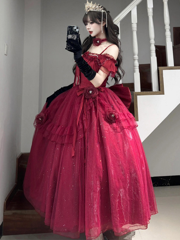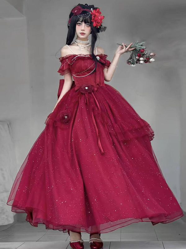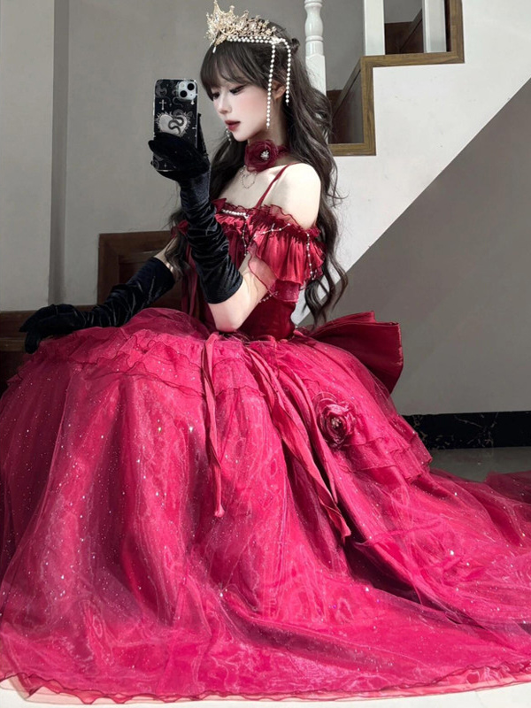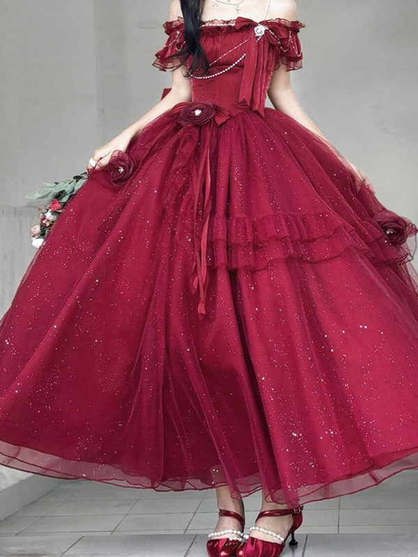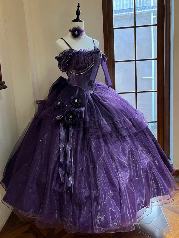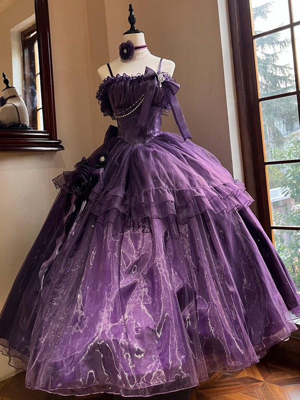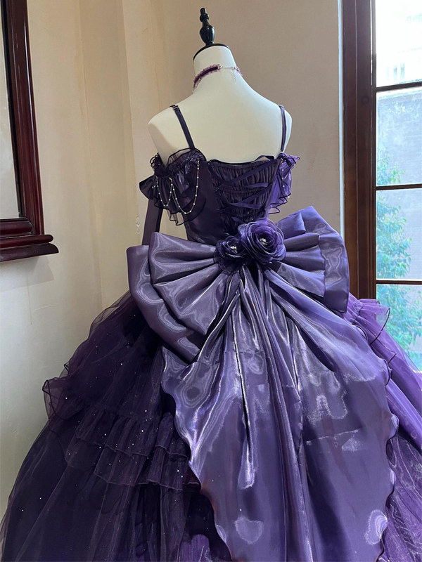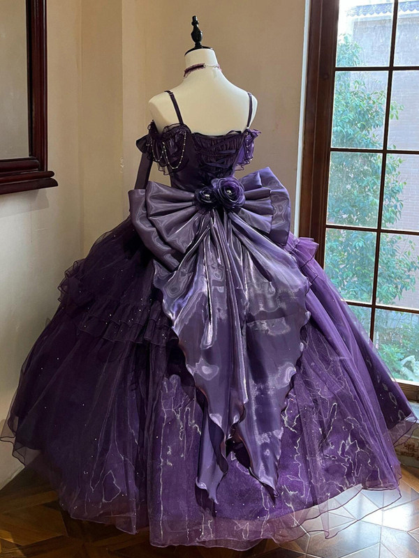 パープルフェアリーロリータドレス、背中バンデージリボン、フロア丈、ティーパーティーロリータプロムドレス