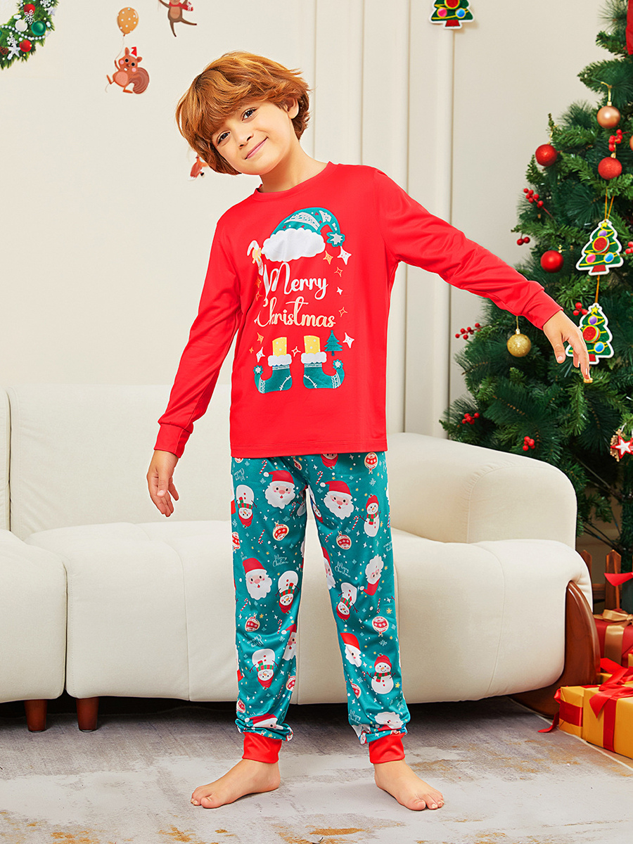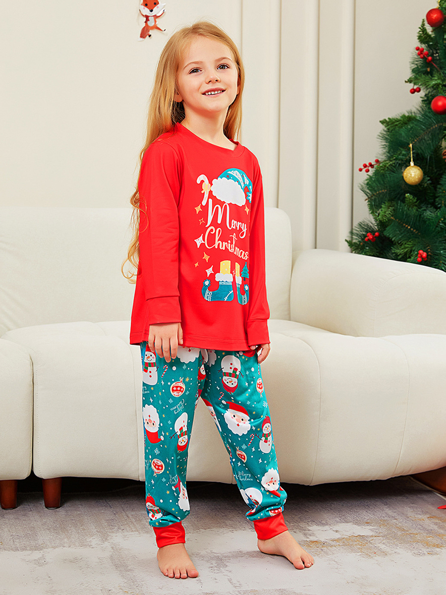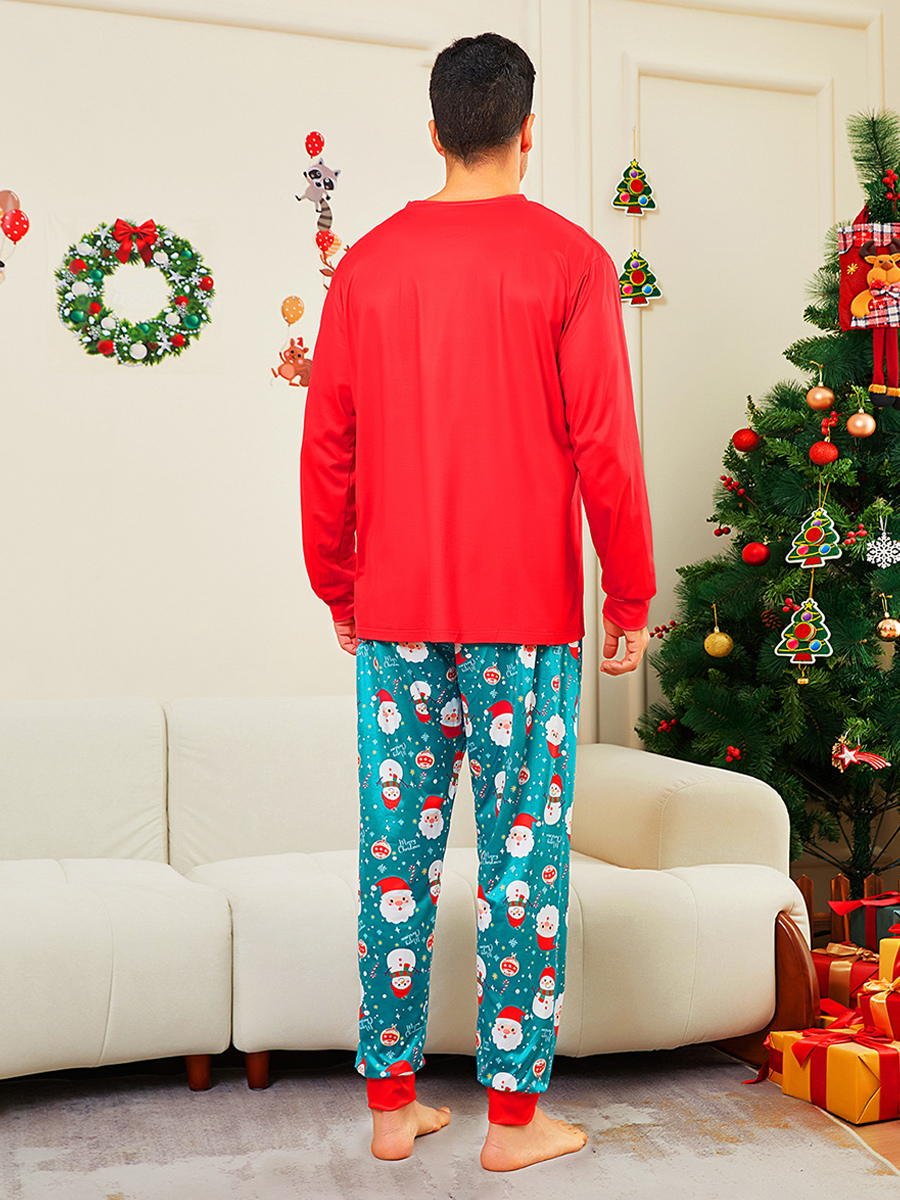 メリークリスマスプリントの赤と青緑のファミリーパジャマ 2025