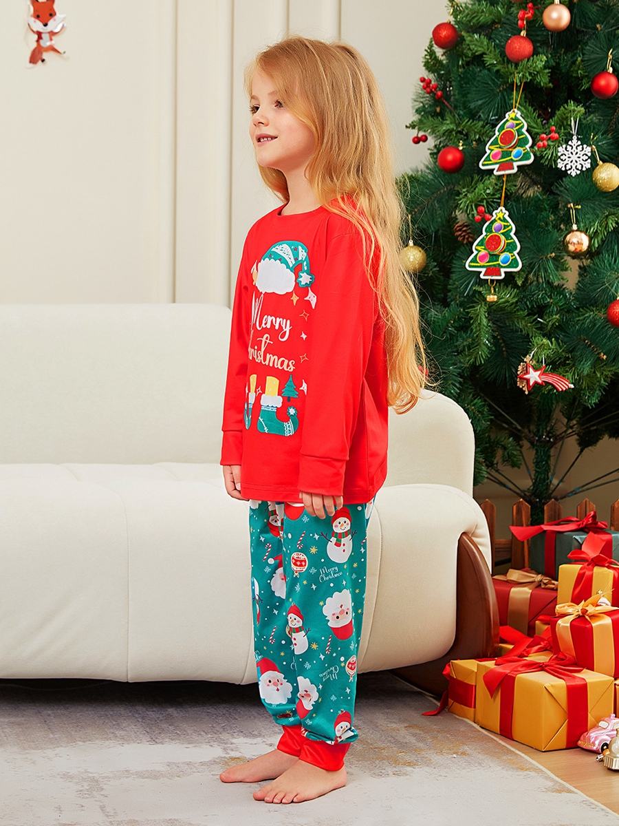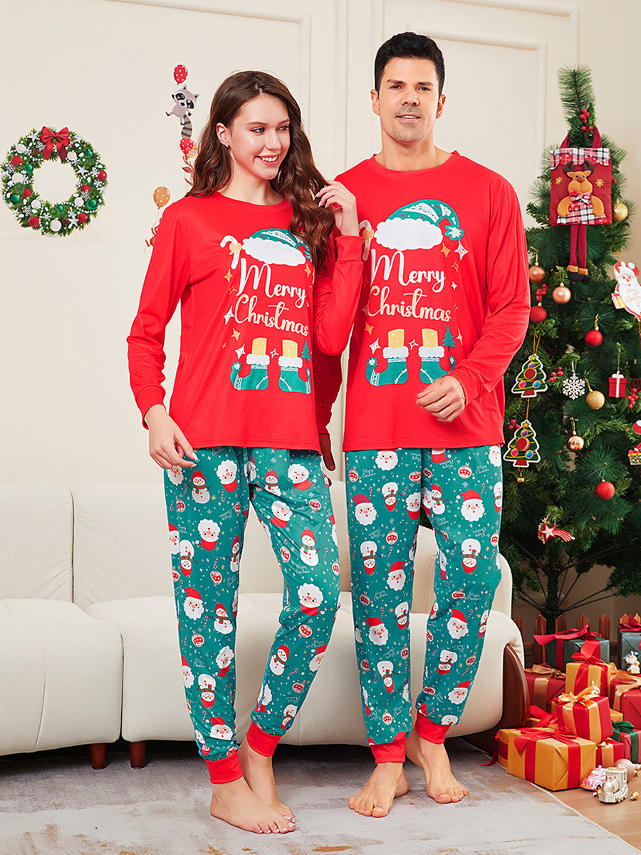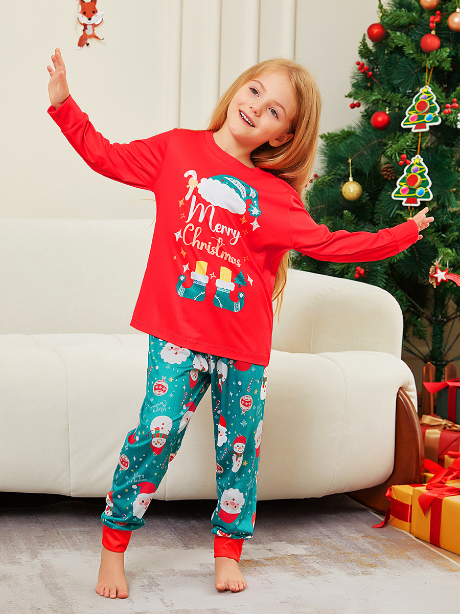 メリークリスマスプリントの赤と青緑のファミリーパジャマ 2025