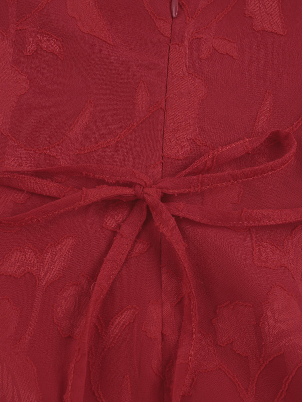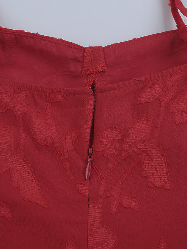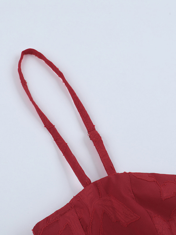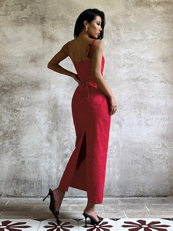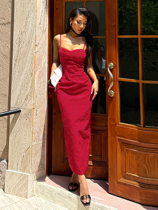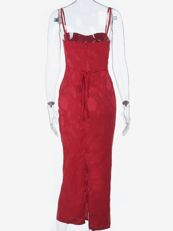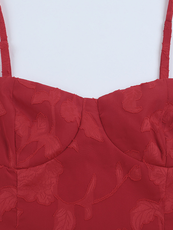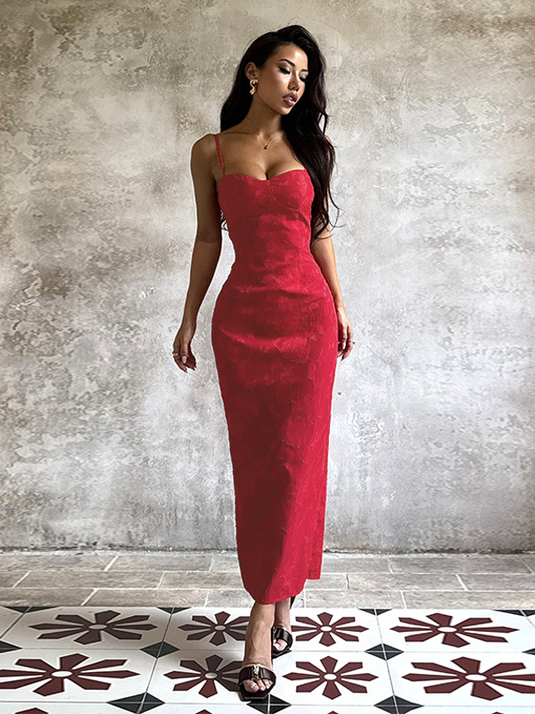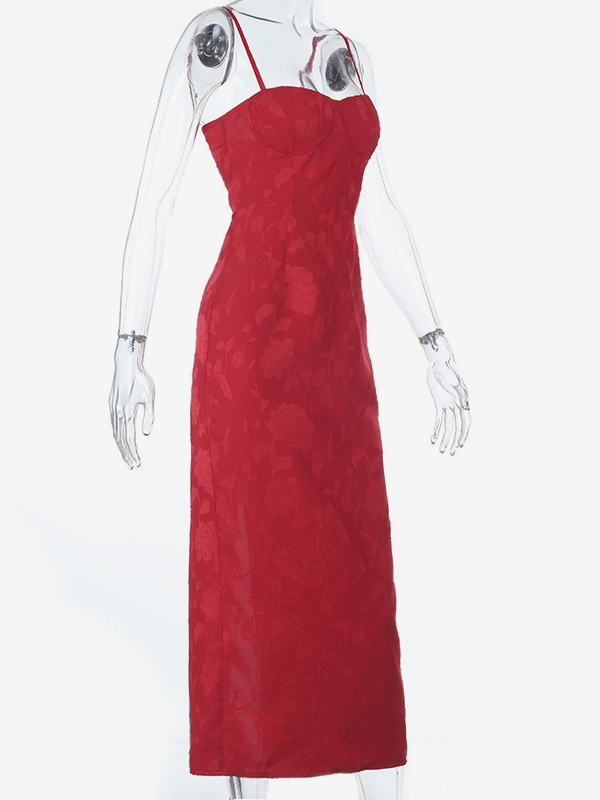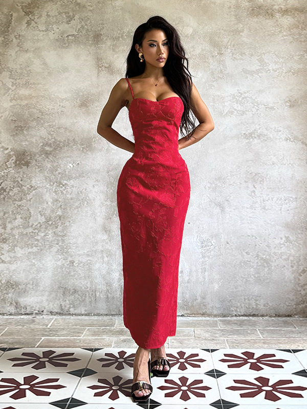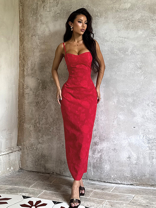 赤い花柄ジャカードマキシドレス(女性用) - ロマンチックなスリムフィットキャミドレス - 夏のデートナイトコーデ 2026