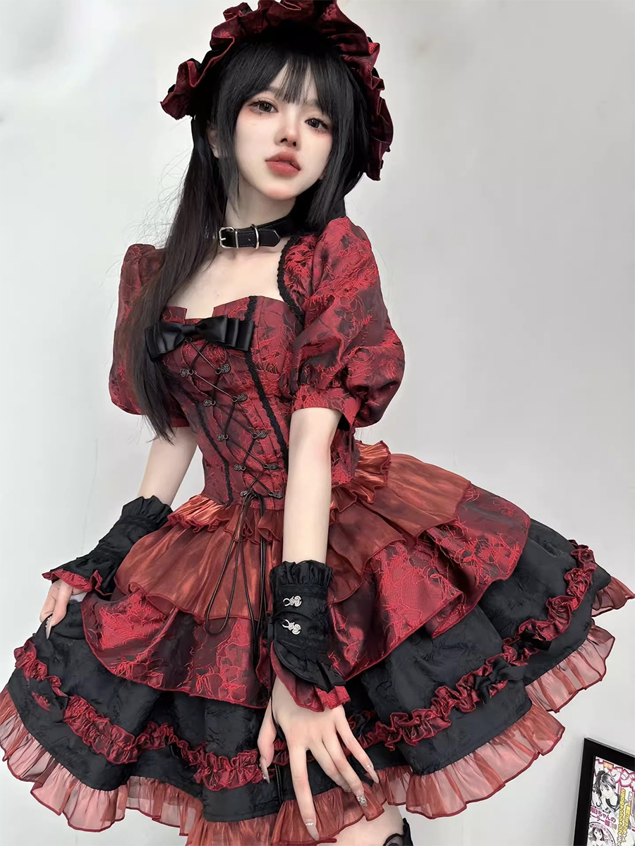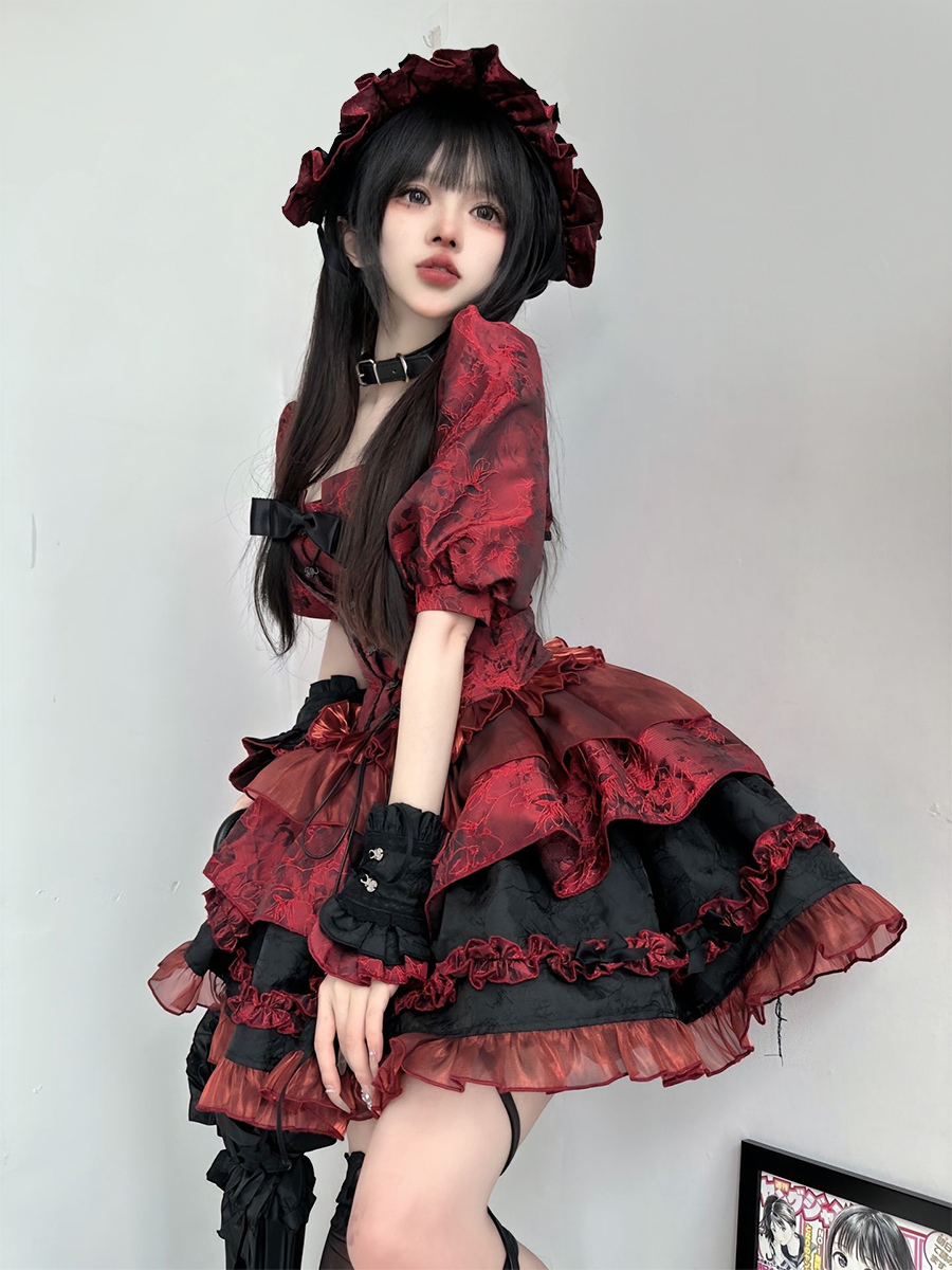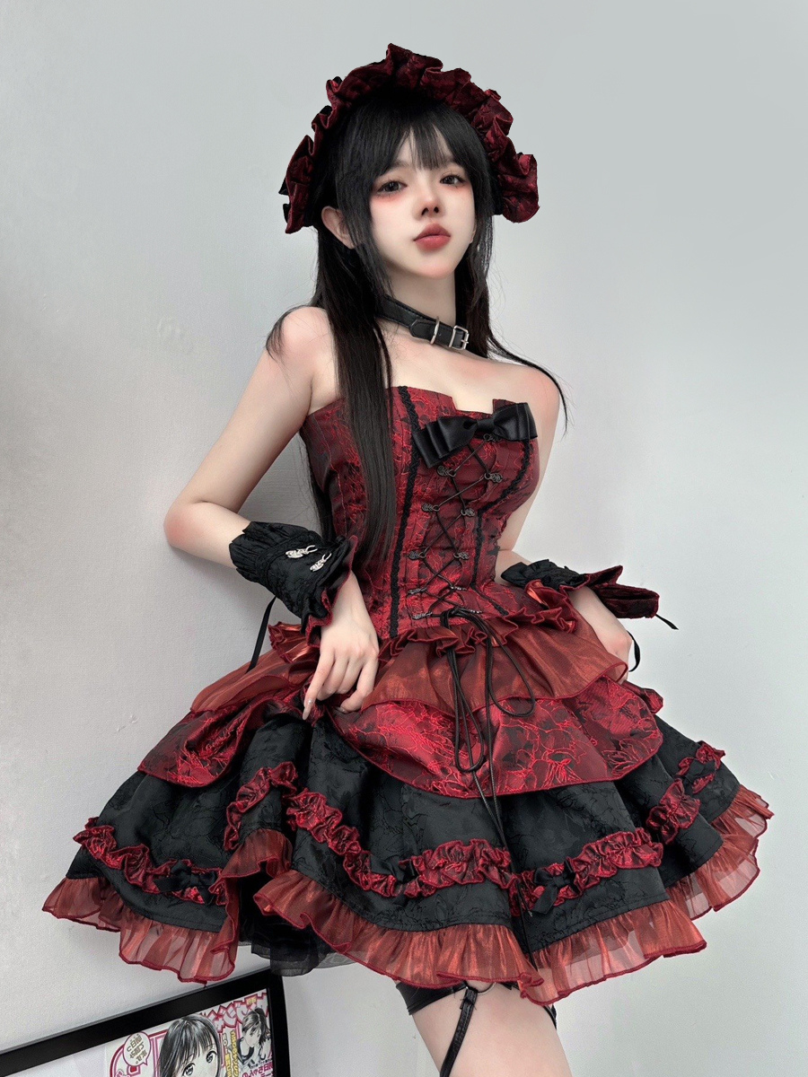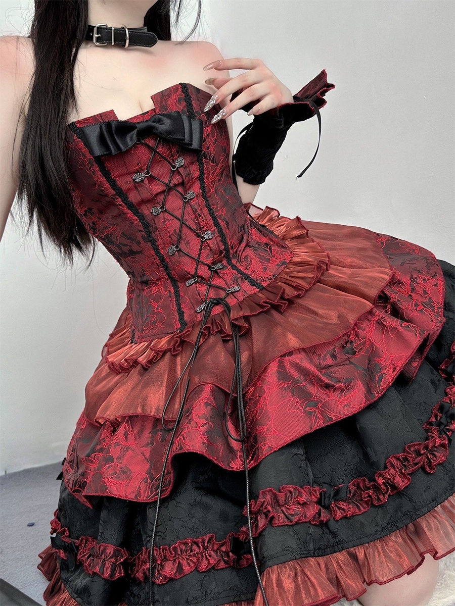 赤いゴシックロリータドレス、ストラップレス、レースアップ、フリル付きロリータドレスセット