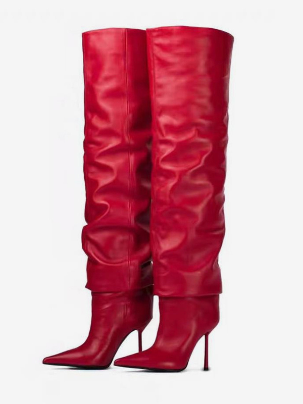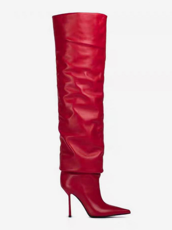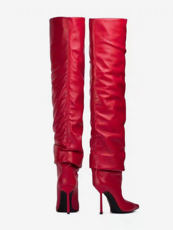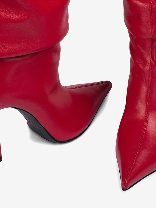 赤いハイヒールブーツ、つま先が尖ったスラウチ、つま先が尖ったニーハイブーツ