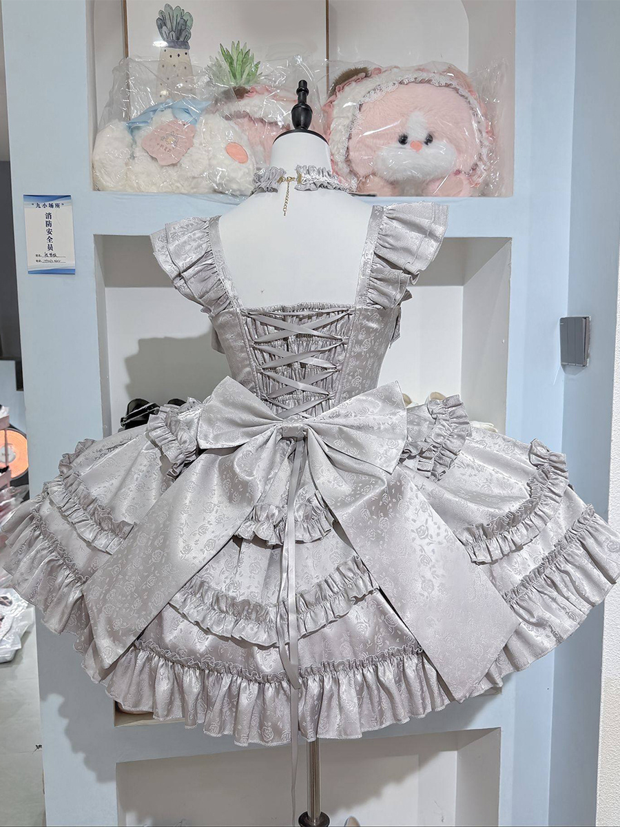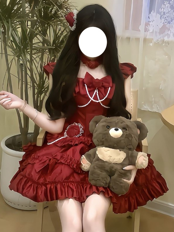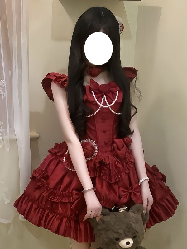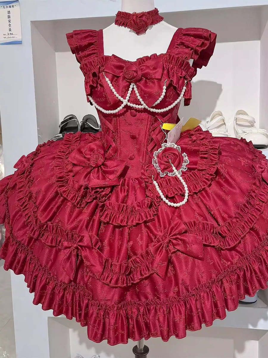 レッドヒメロリータドレス スイートバックレースバンデージフリルボウショートロリータドレス