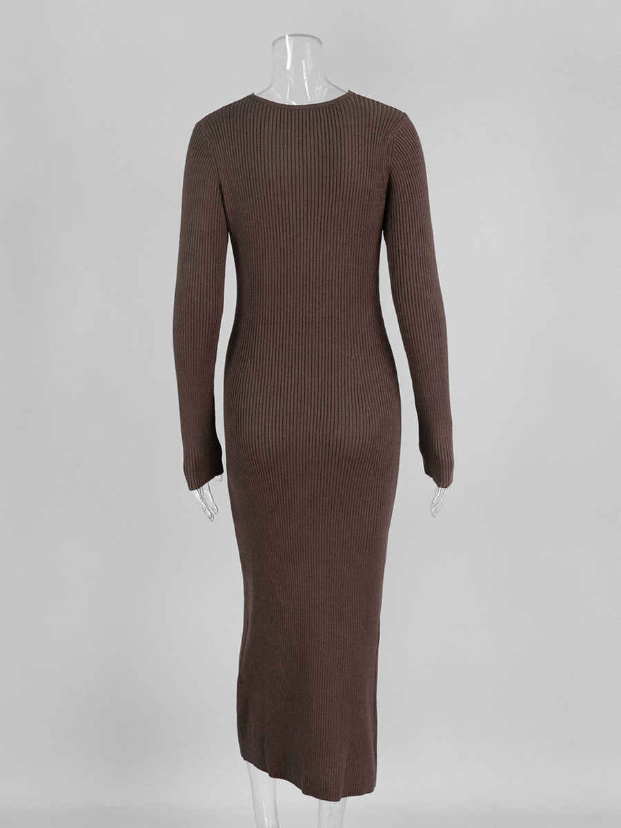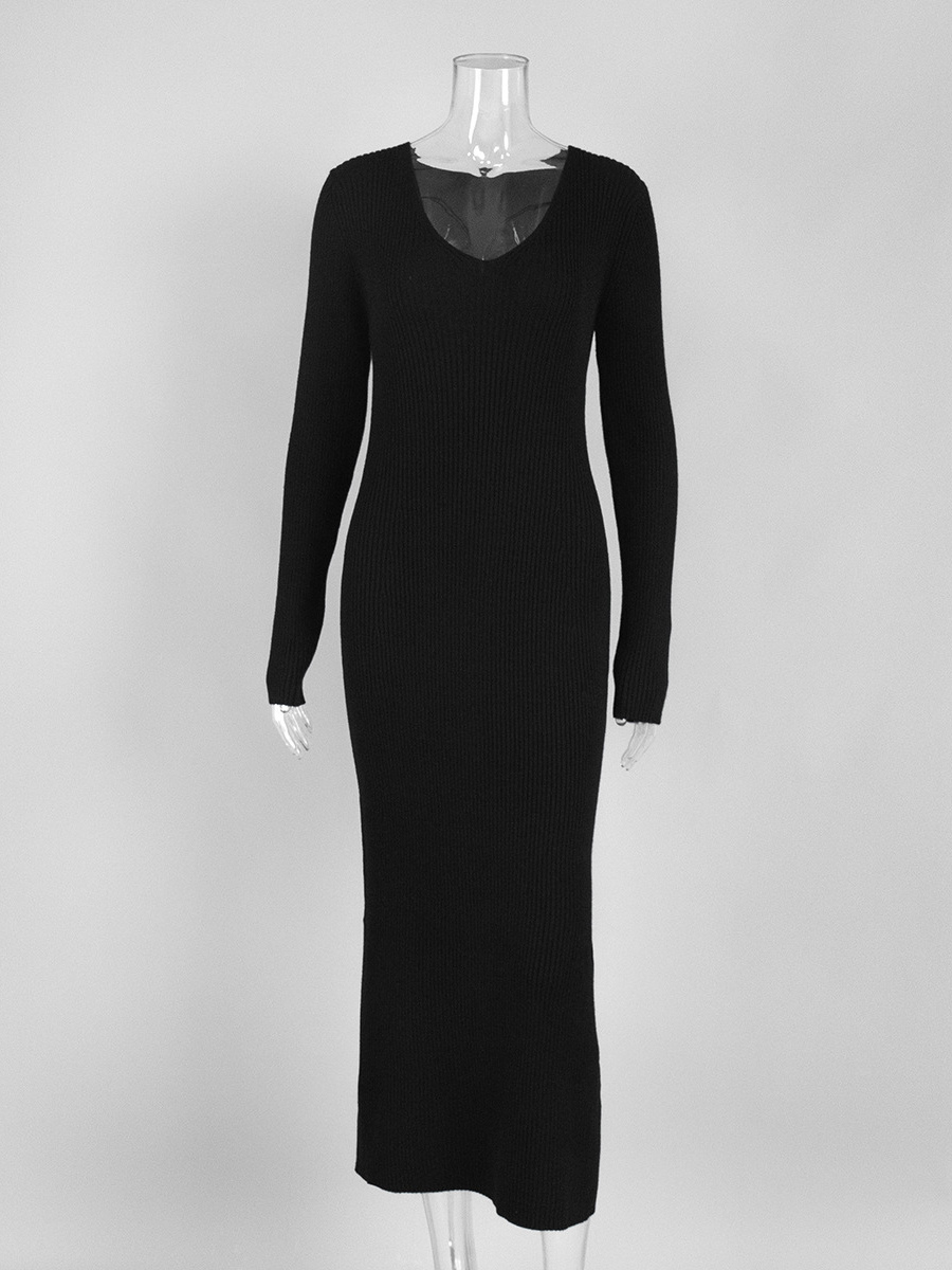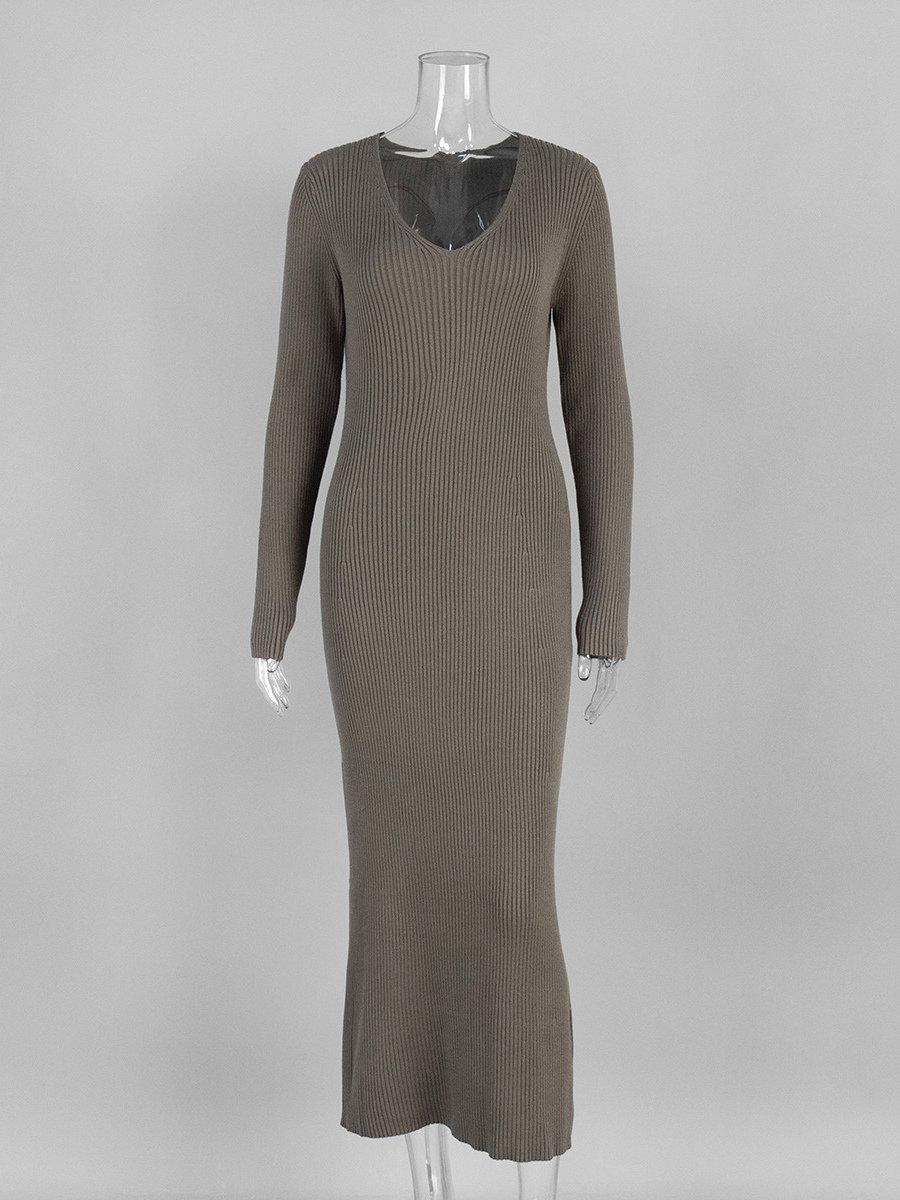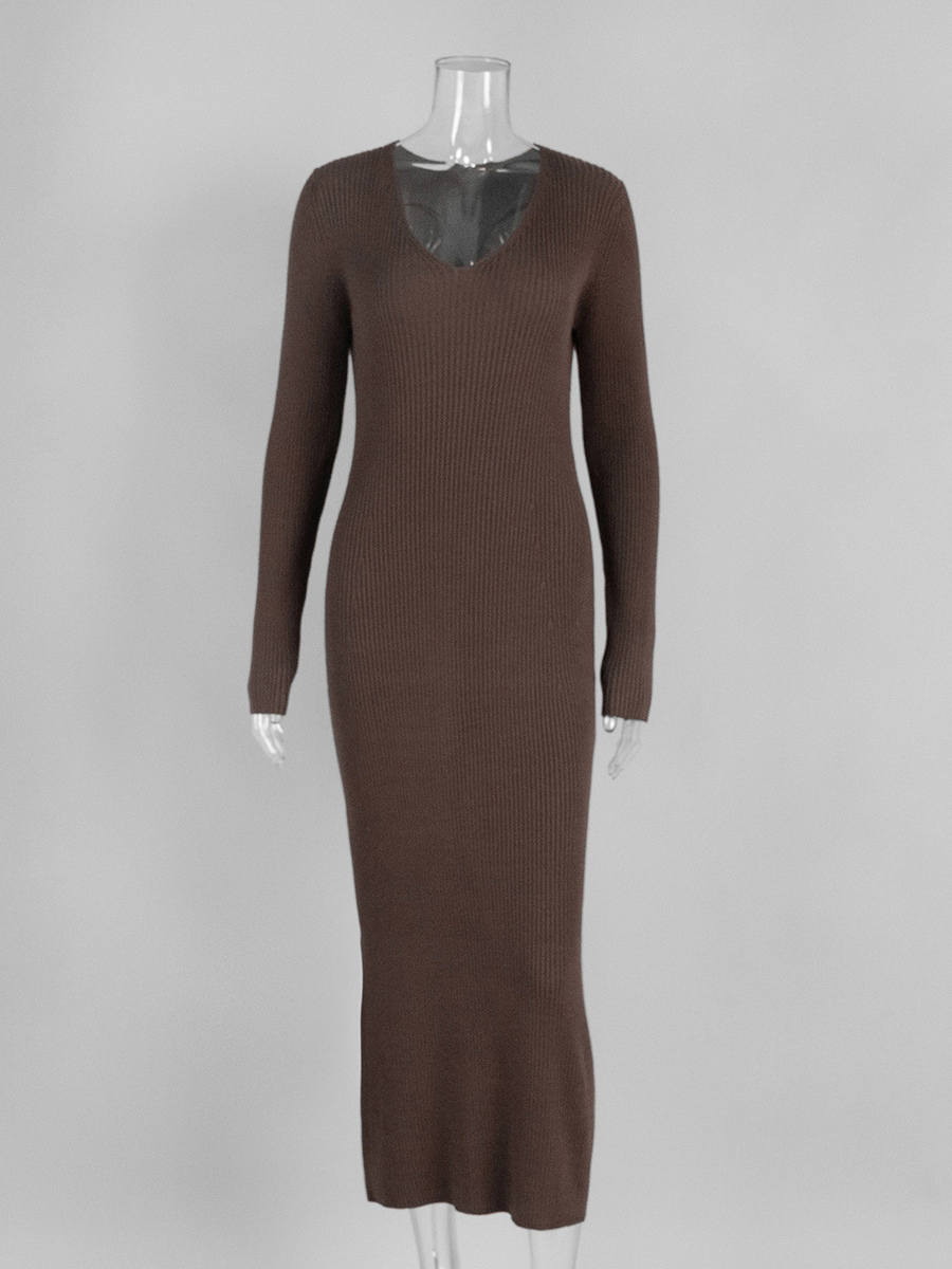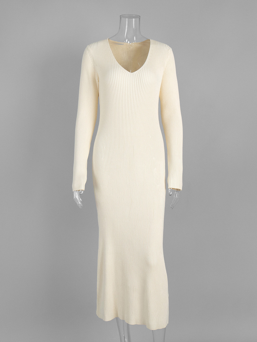 リブニット Vネック スリムフィット 長袖 ボディコン マキシ丈 セータードレス レディース 2026