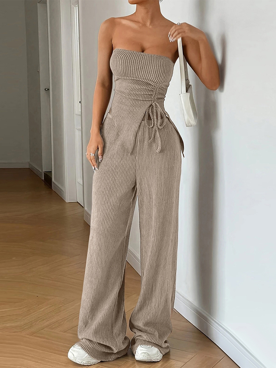 リブ編みツーピースセット(女性用) - カーキのセクシーなチューブトップとワイドレッグパンツのセット - 2026年夏のビーチバケーション