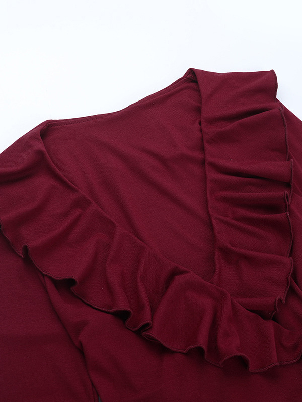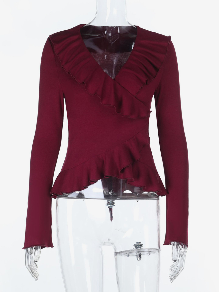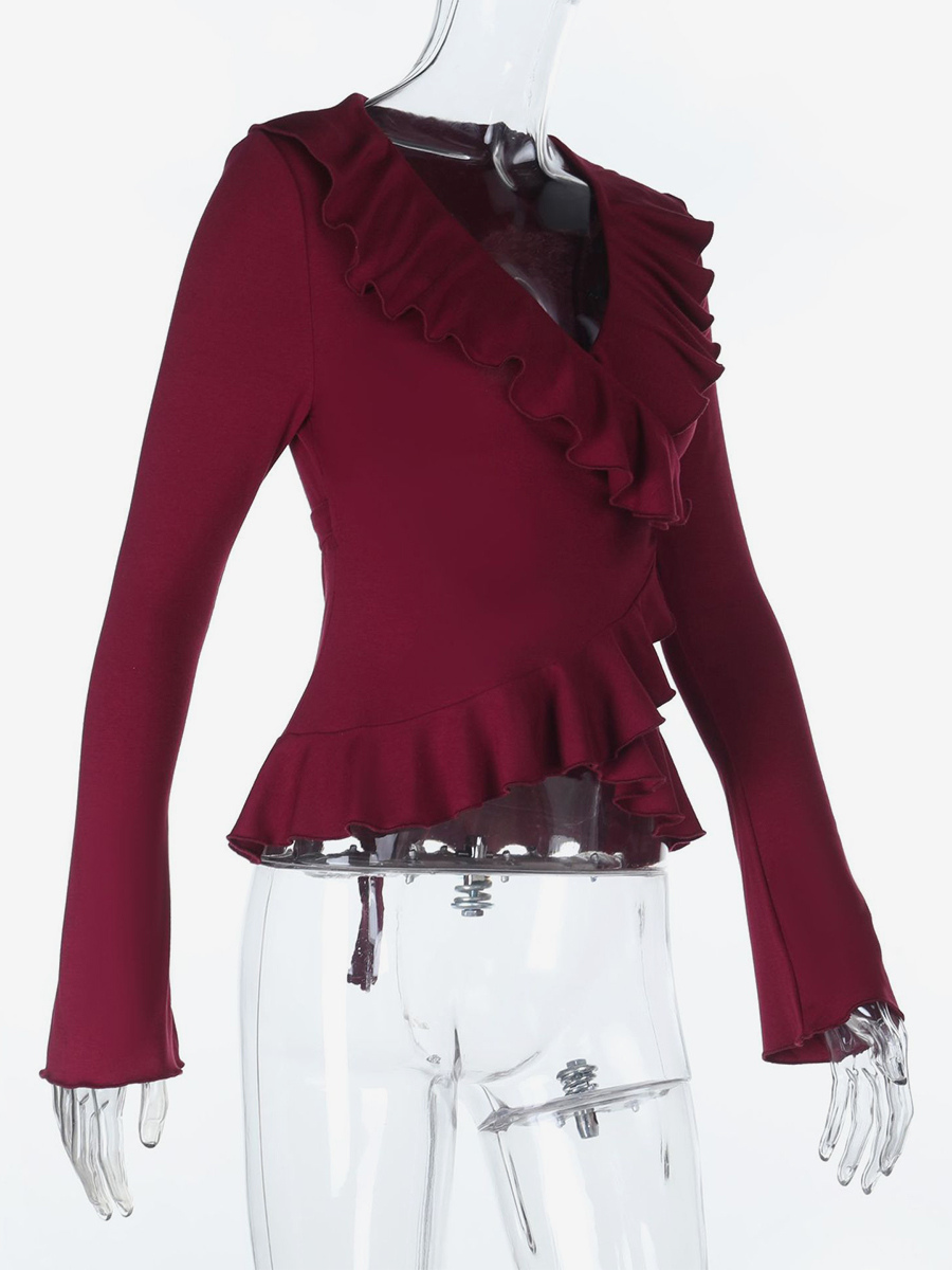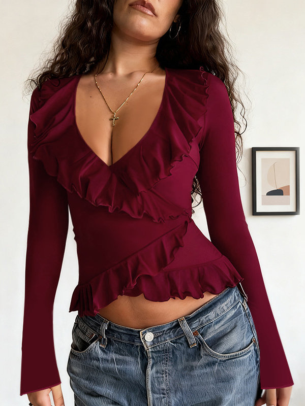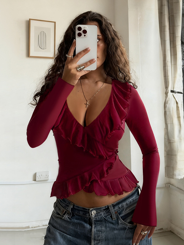 ロマンチックなフリル付きレディースラップトップ - Vネック長袖 - コケットな雰囲気の春のデートナイトウェア 2026