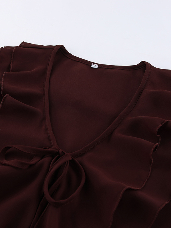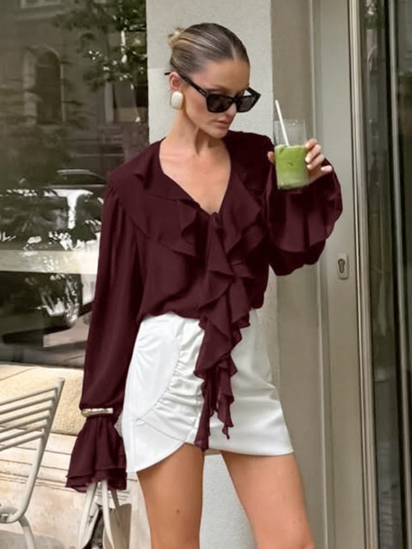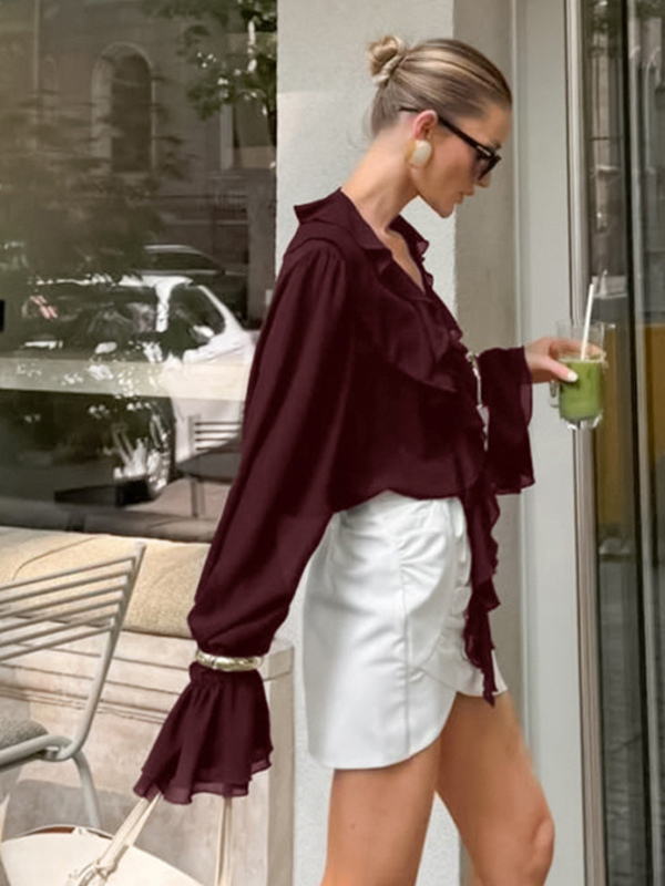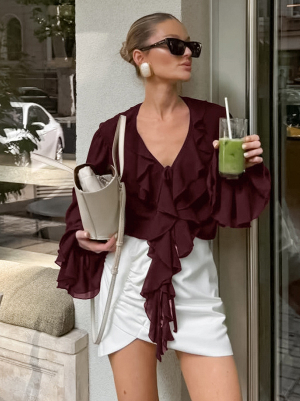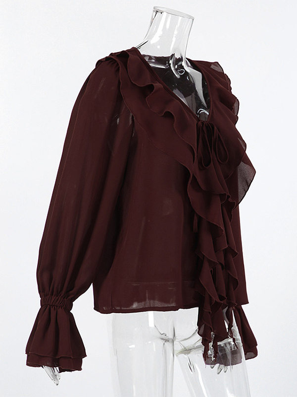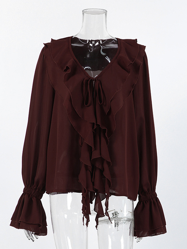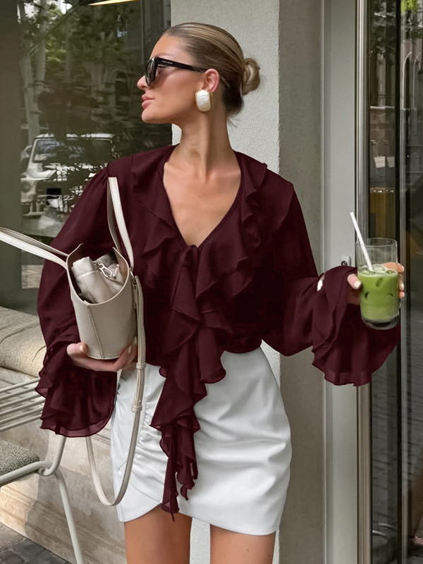 レディース用フリルシフォンブラウス - バーガンディ エレガントなタイフロントフレア長袖トップス - 春のオフィスからディナーまで 2026