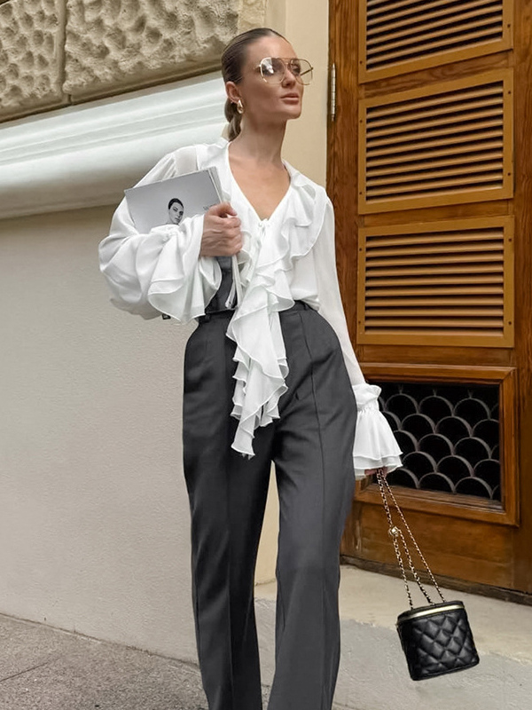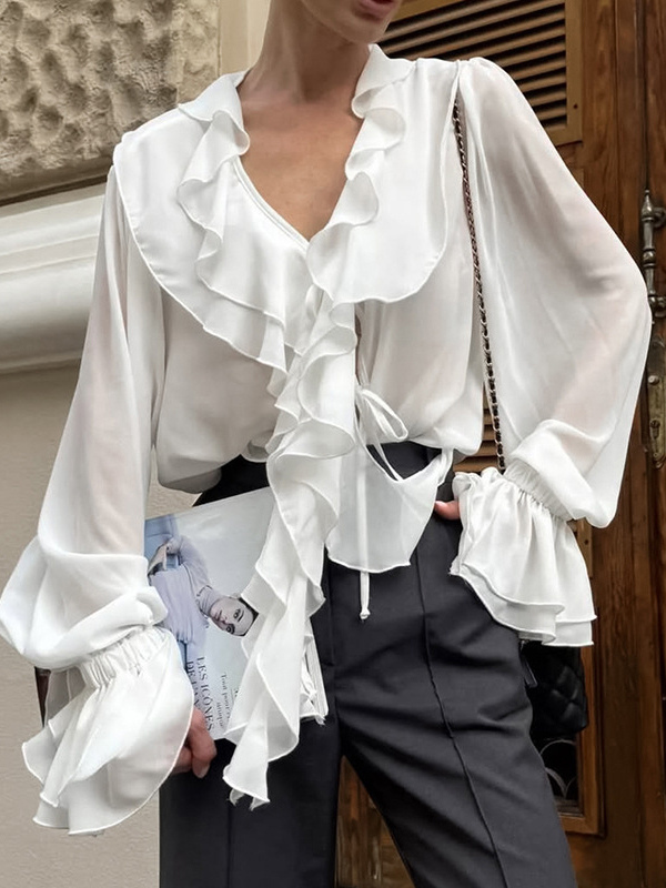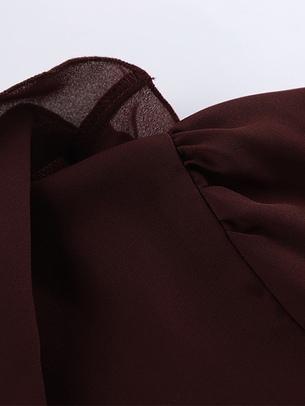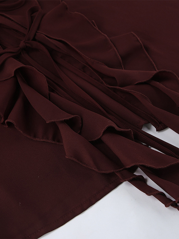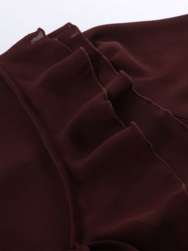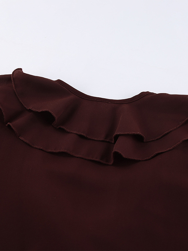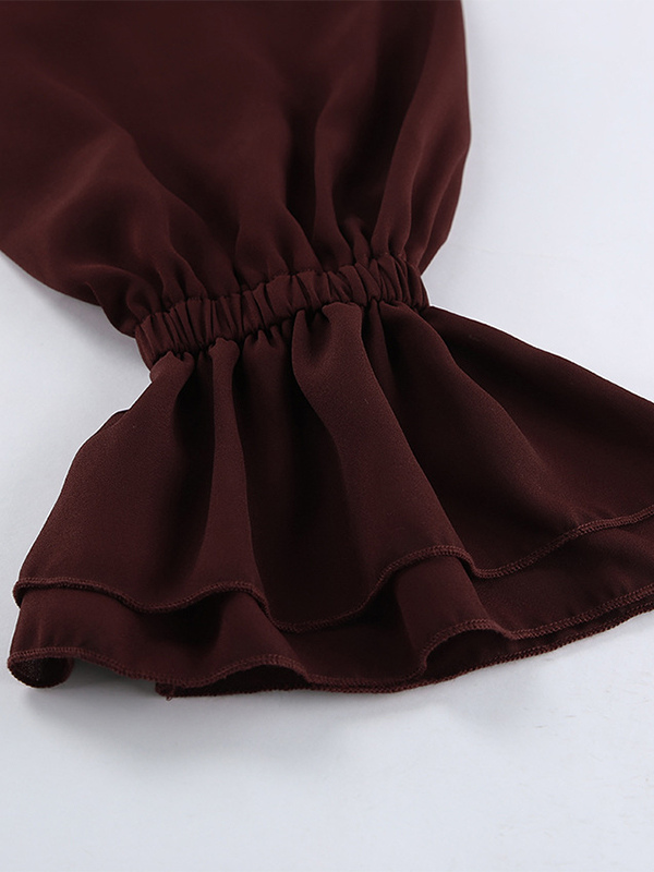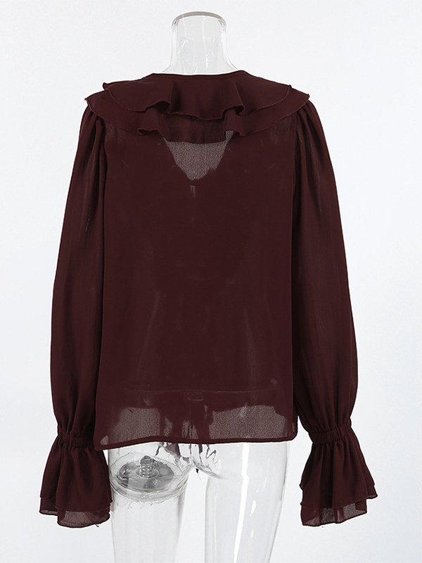 レディース用フリルシフォンブラウス - バーガンディ エレガントなタイフロントフレア長袖トップス - 春のオフィスからディナーまで 2026