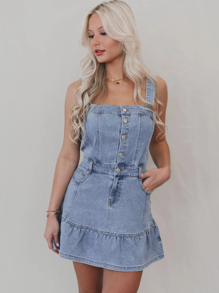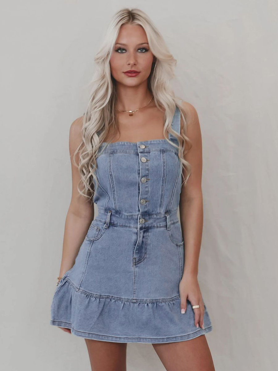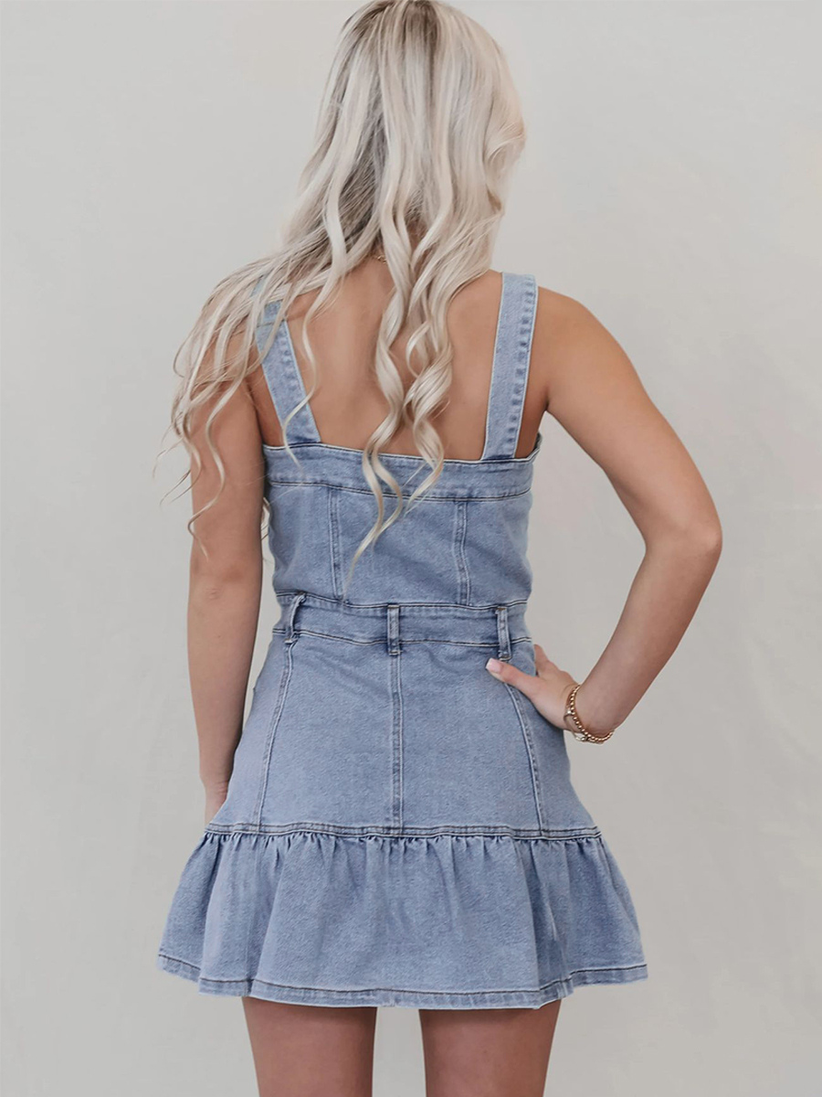 フリル裾デニムワンピース(レディース) - ライトブルーのキュートなY2K風ボタンアップミニドレス - 夏のビーチフェスティバルパーティー衣装 2026