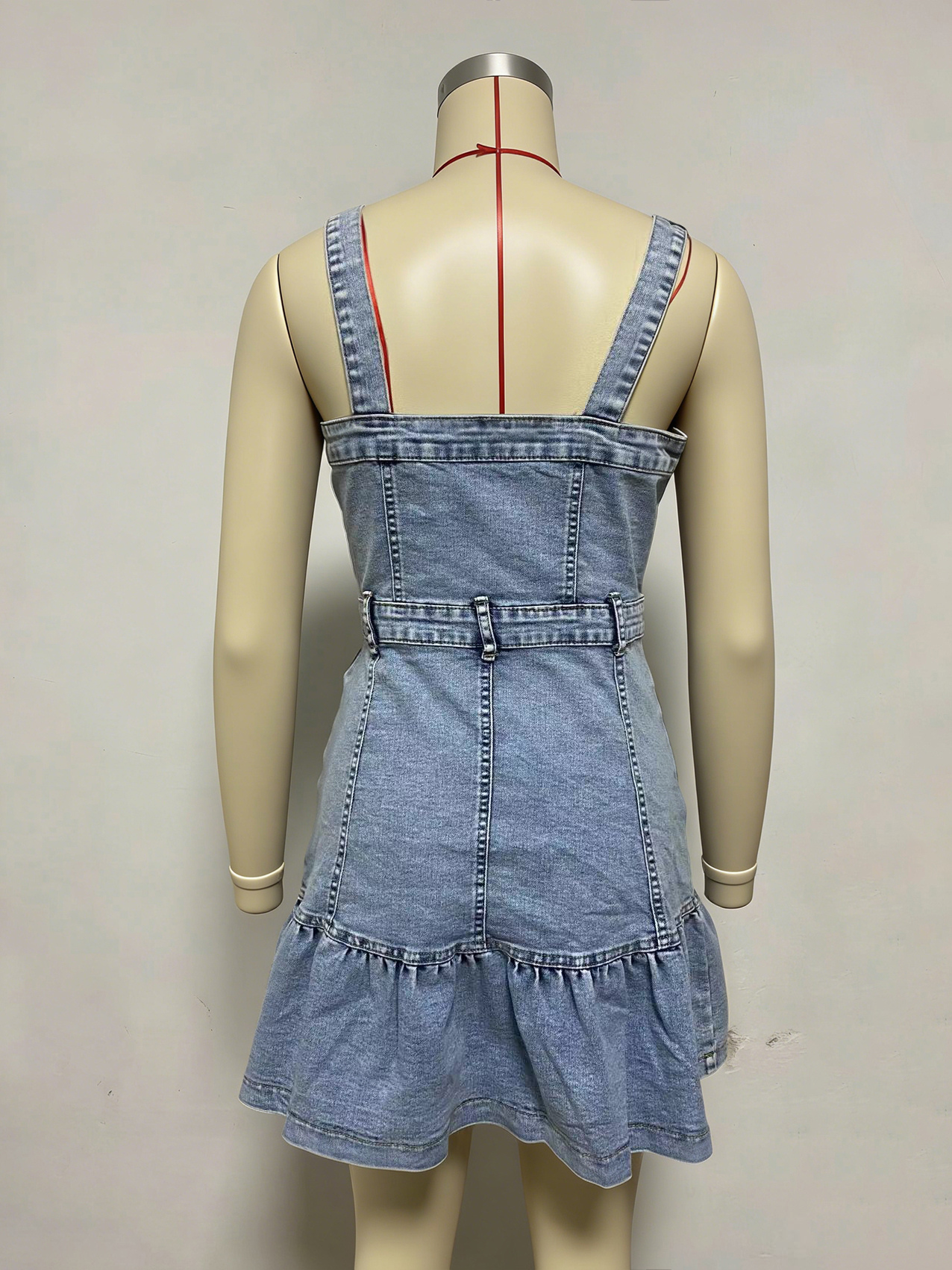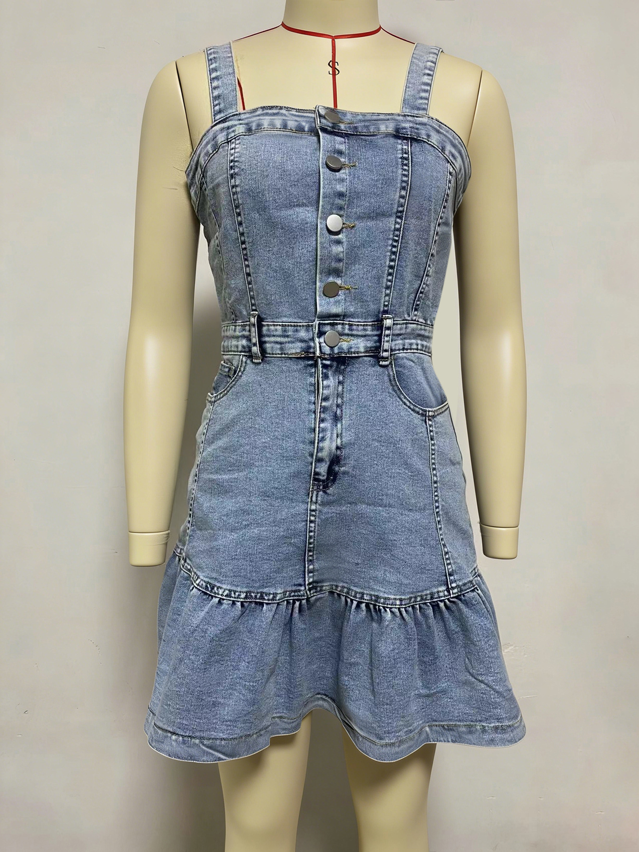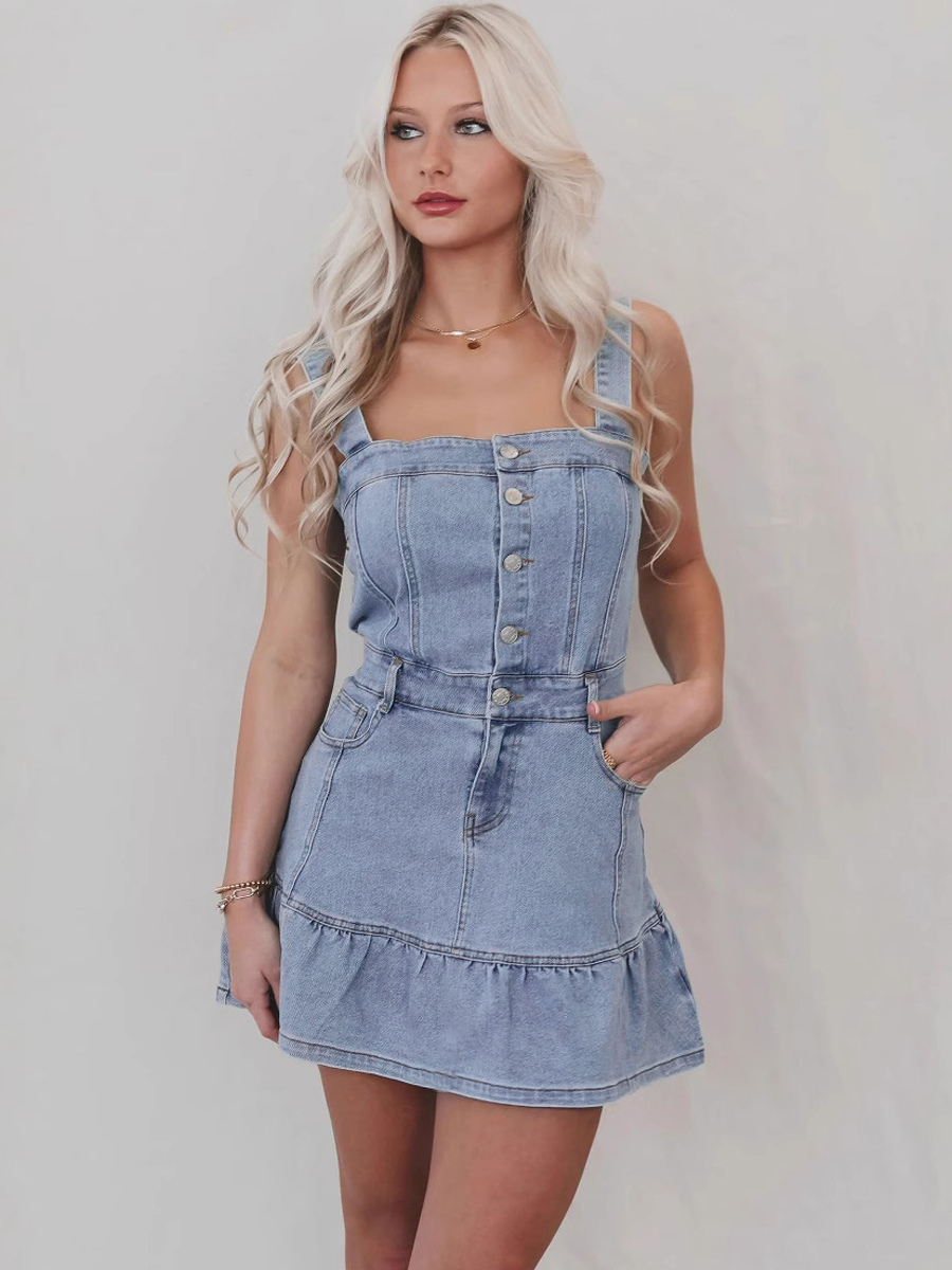 フリル裾デニムワンピース(レディース) - ライトブルーのキュートなY2K風ボタンアップミニドレス - 夏のビーチフェスティバルパーティー衣装 2026