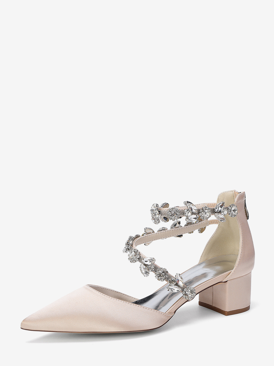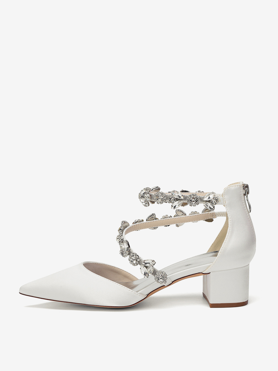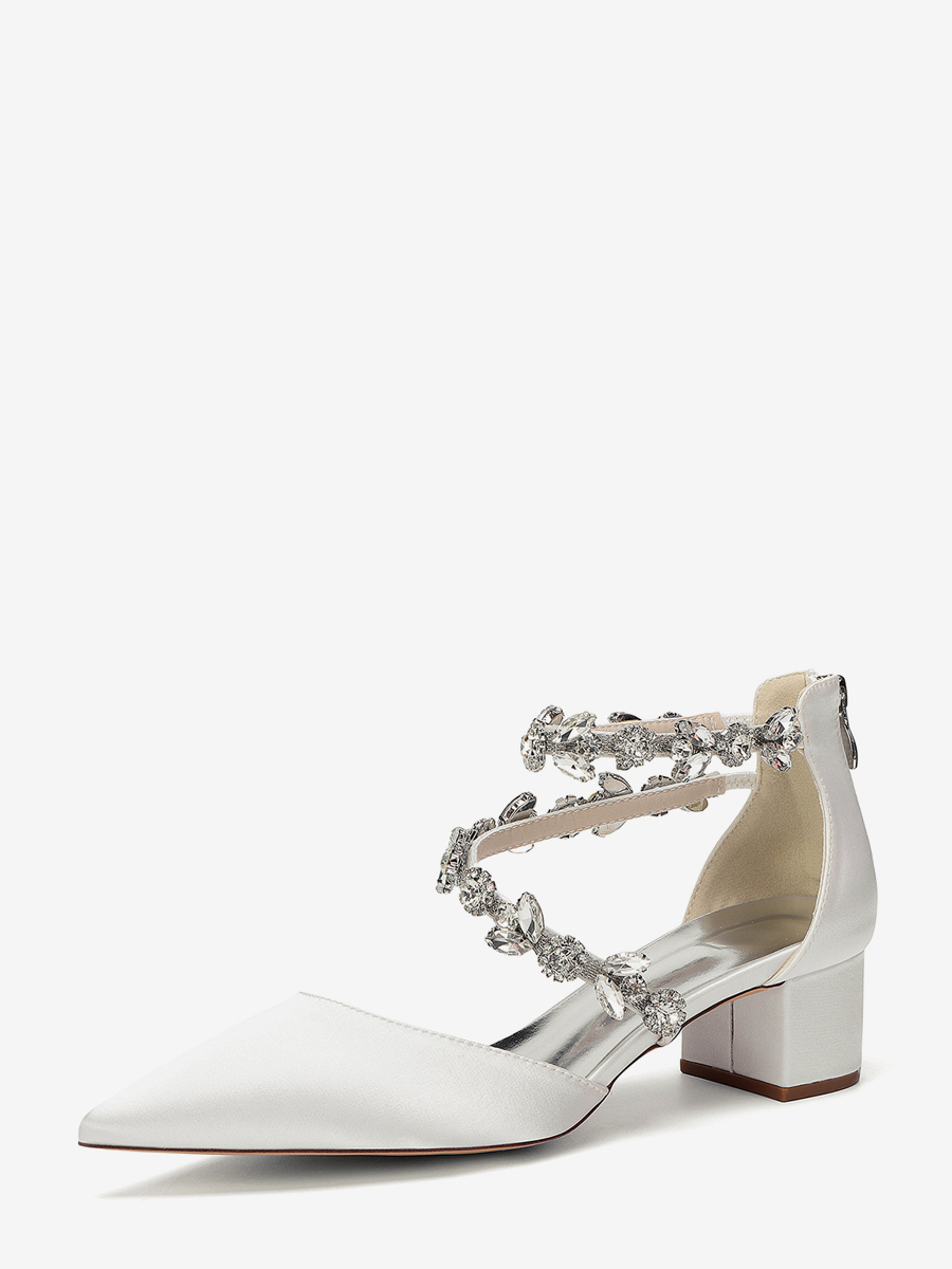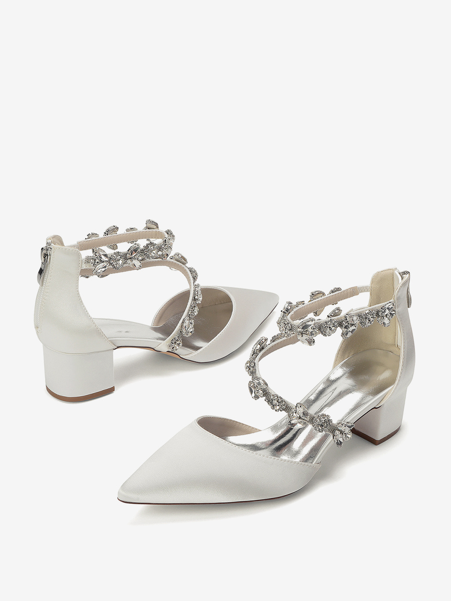 サテン地のブライダルシューズ、ポインテッドトゥ、ラインストーン付き、ストラップ付き、チャンキーヒールパンプス