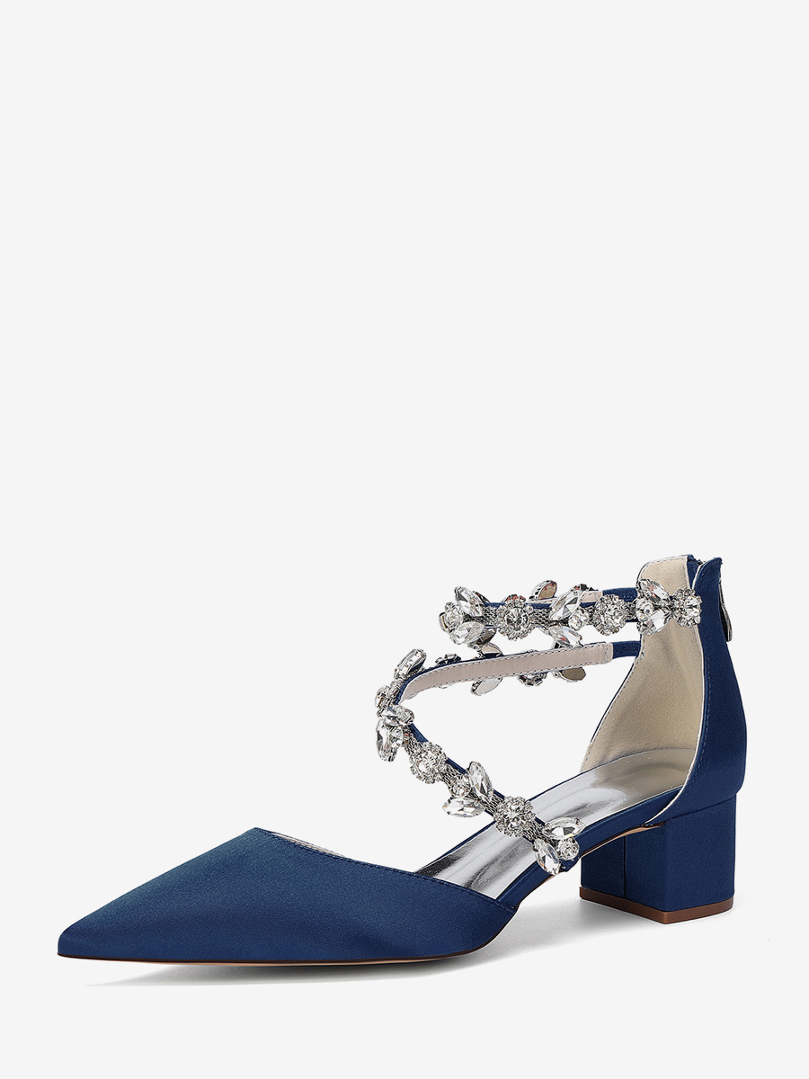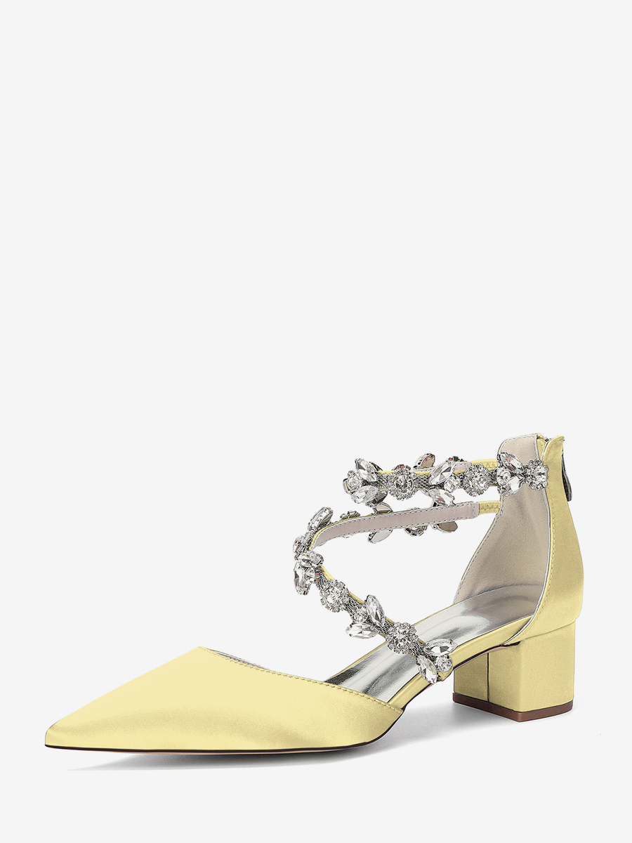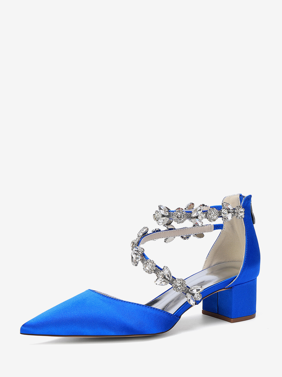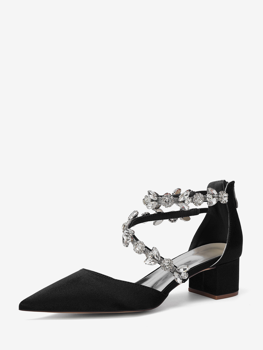 サテン地のブライダルシューズ、ポインテッドトゥ、ラインストーン付き、ストラップ付き、チャンキーヒールパンプス