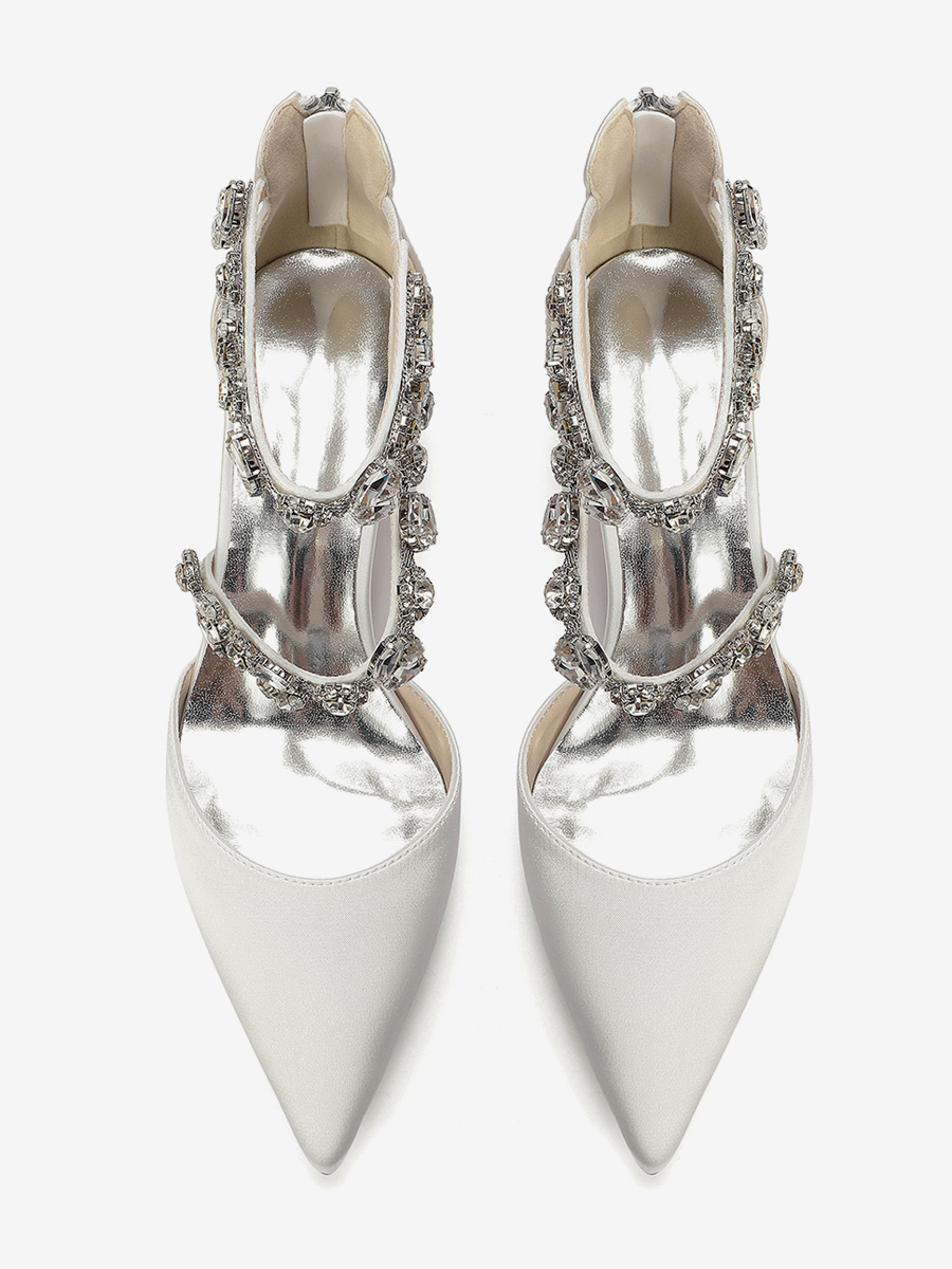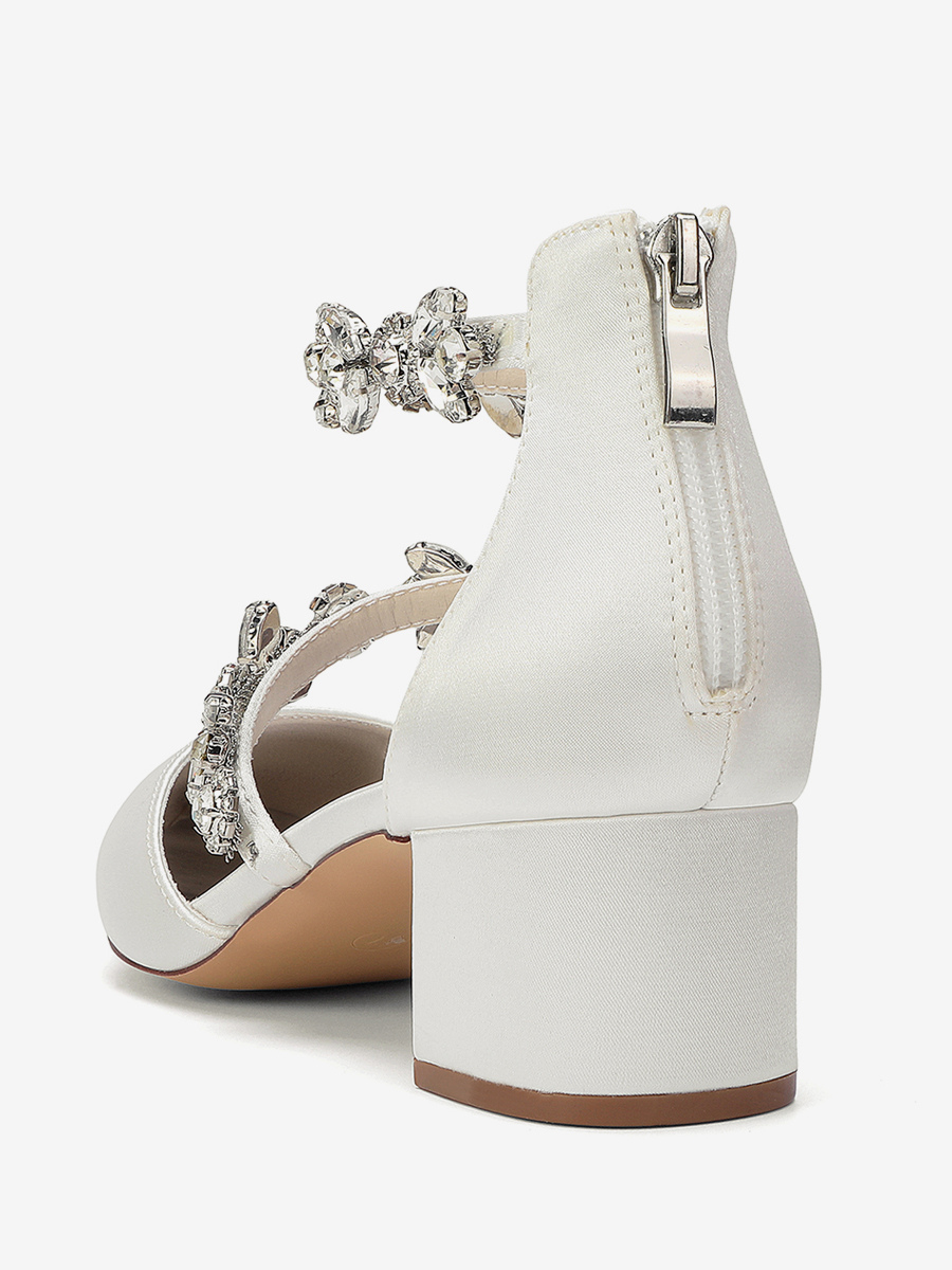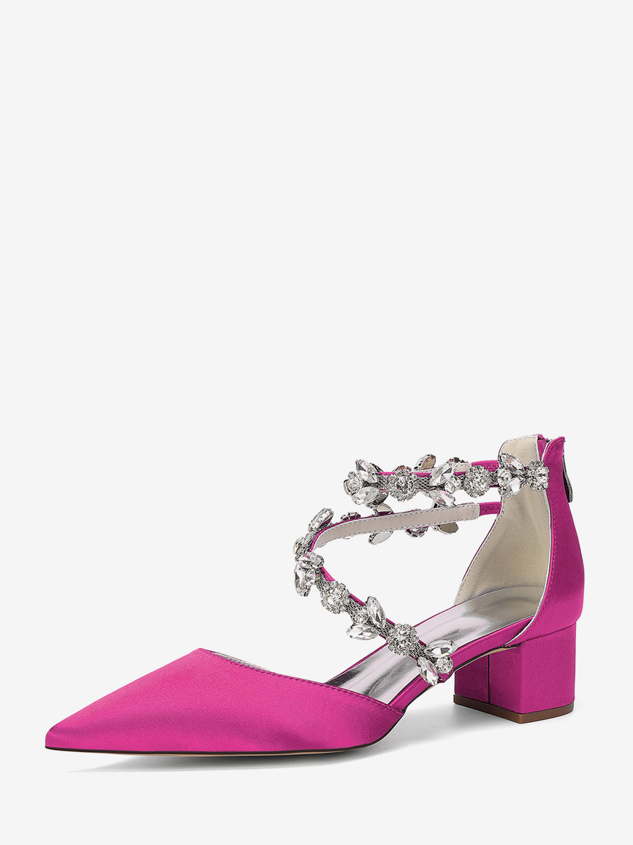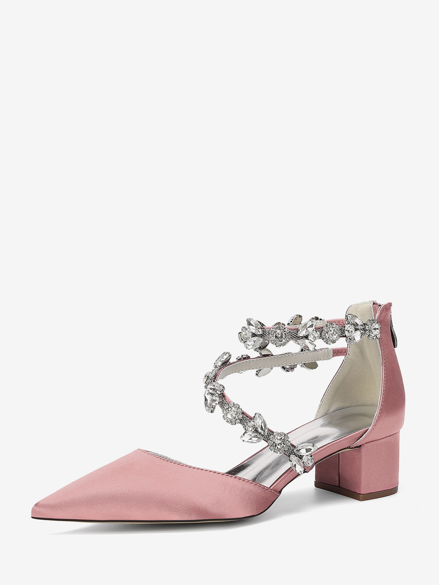 サテン地のブライダルシューズ、ポインテッドトゥ、ラインストーン付き、ストラップ付き、チャンキーヒールパンプス