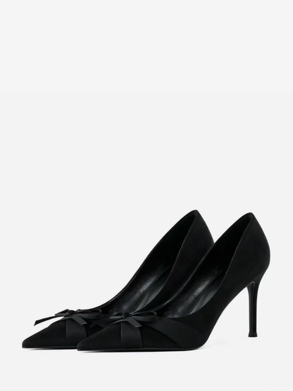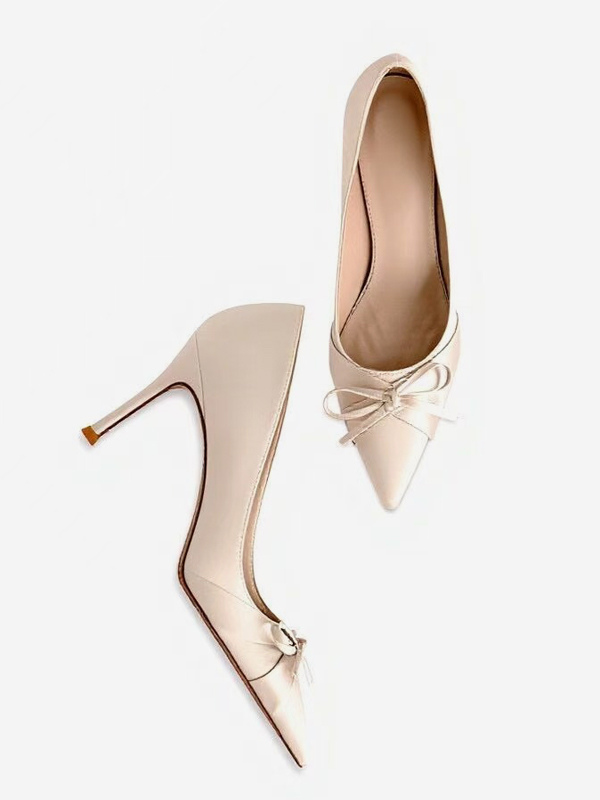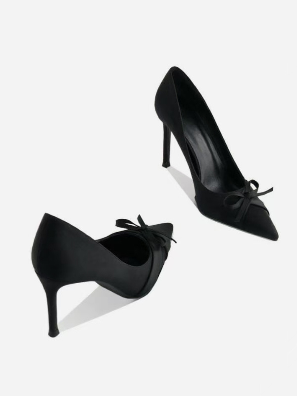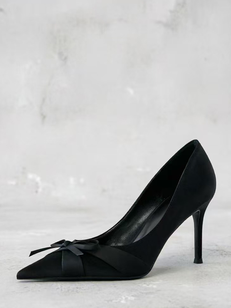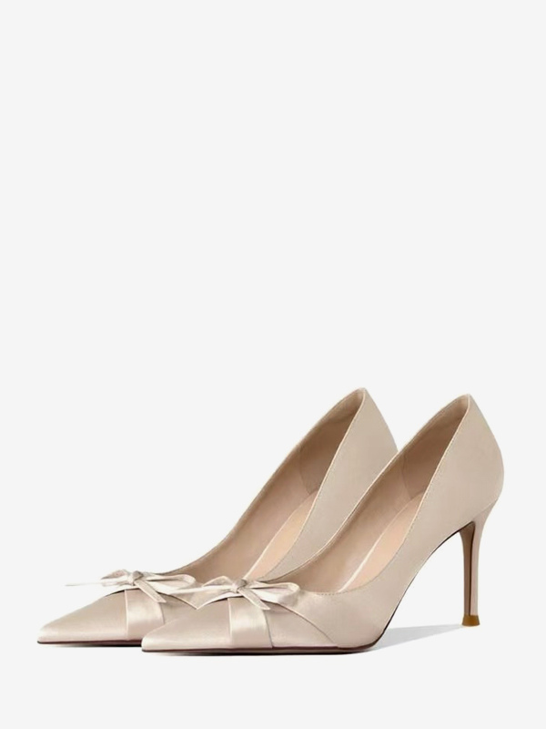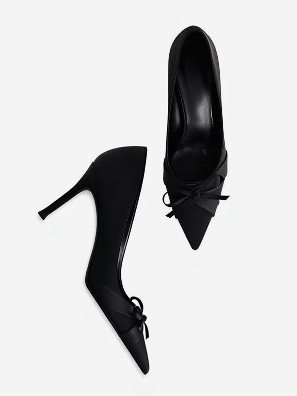 サテン素材のハイヒールパンプス、ポインテッドトゥ、リボン付き、スリッポンタイプのパーティシューズ