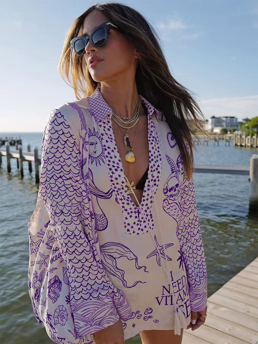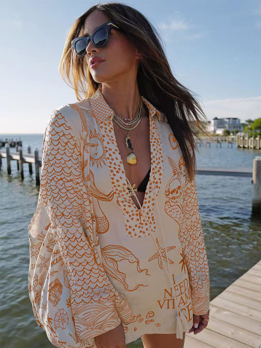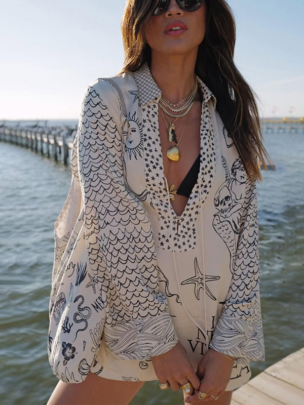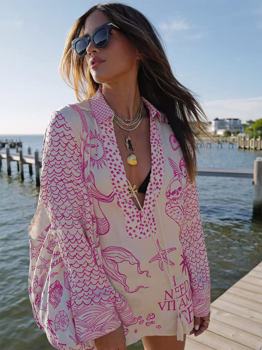 サテンプリントのレディースパジャマセット - 海辺のグラフィックVネック長袖シャツとショートパンツ - サマークルーズパーティー2026