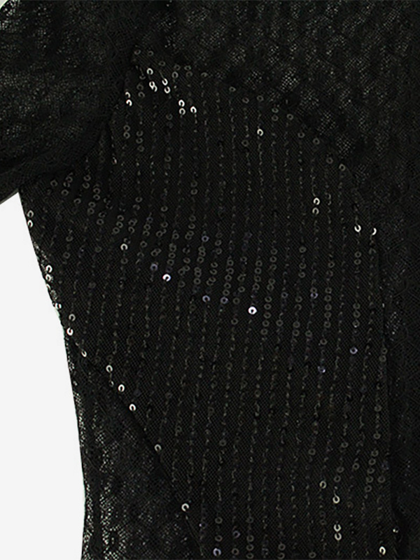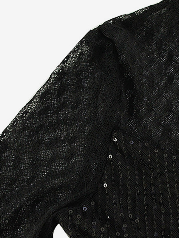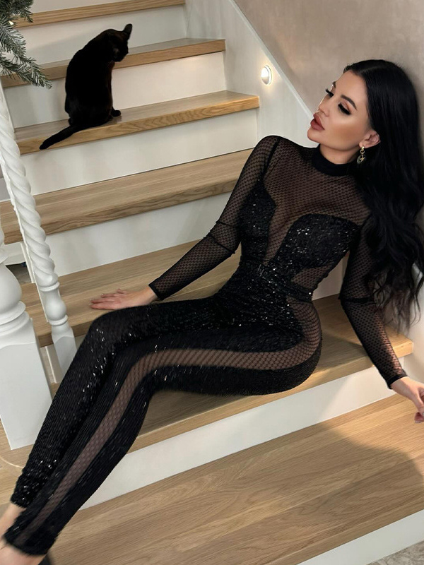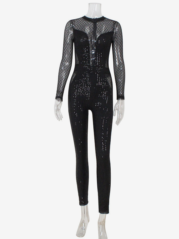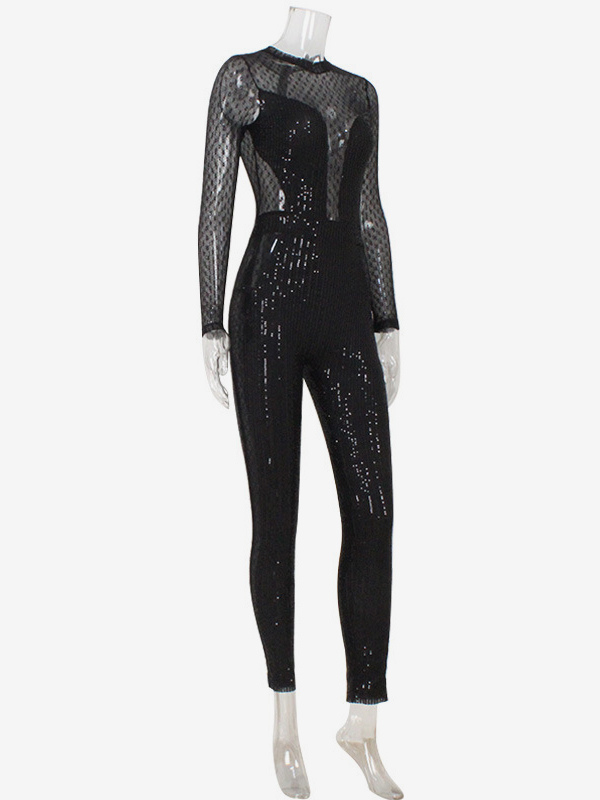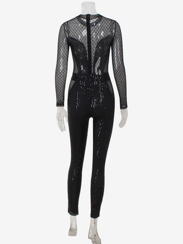 スパンコールメッシュジャンプスーツ(女性用) - ブラック セクシー シースルー バディ 長袖ボディスーツ - 春のクラブウェア ナイトアウト パーティー 2026
