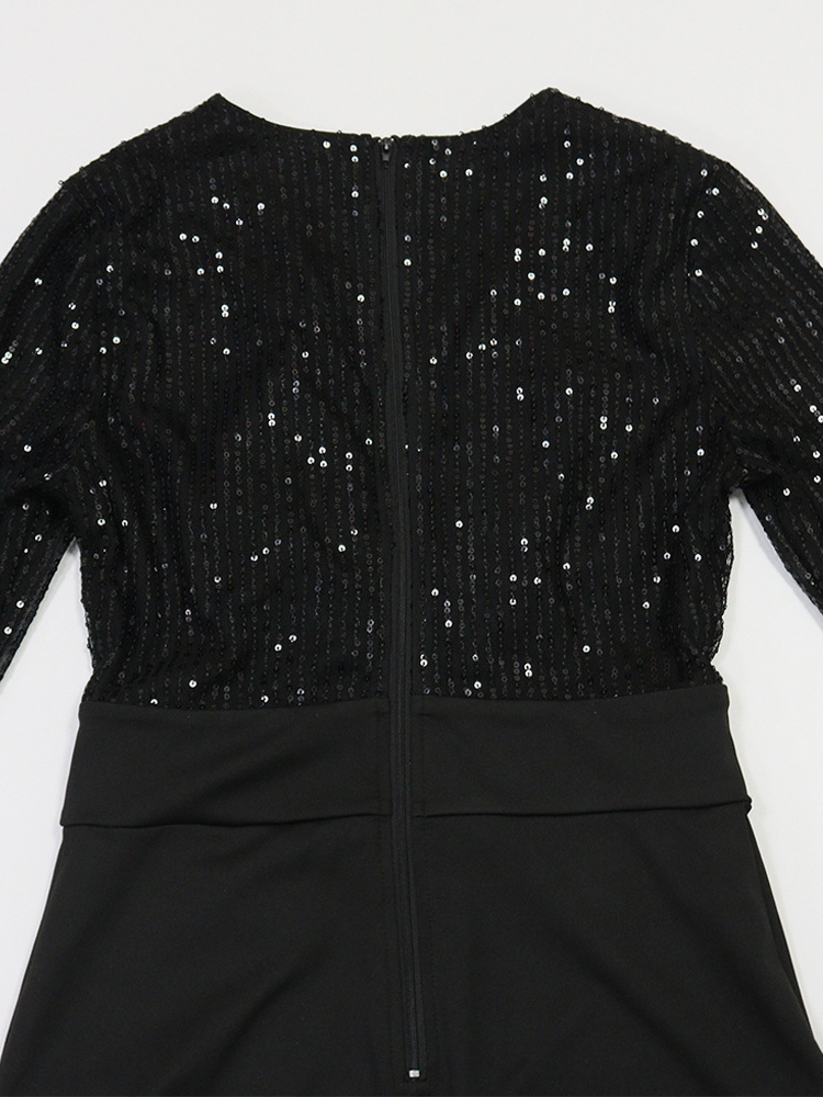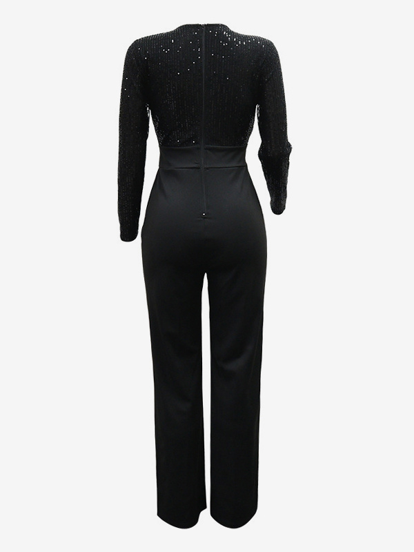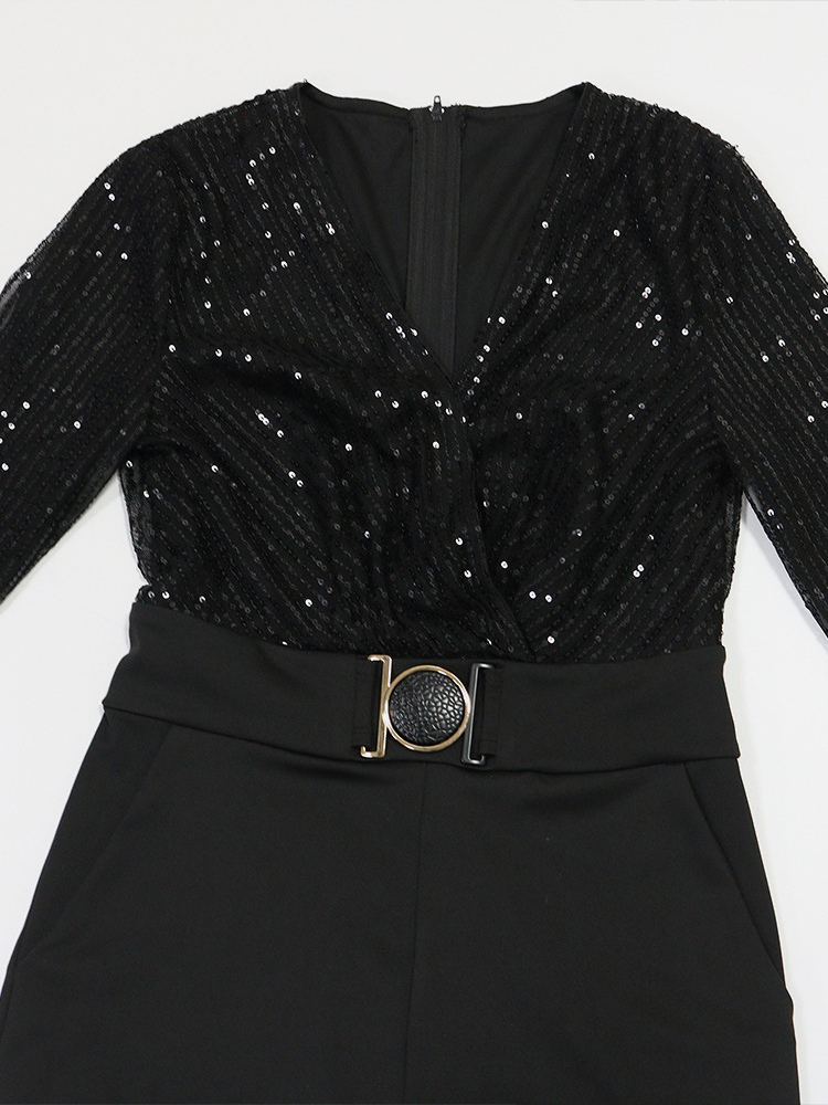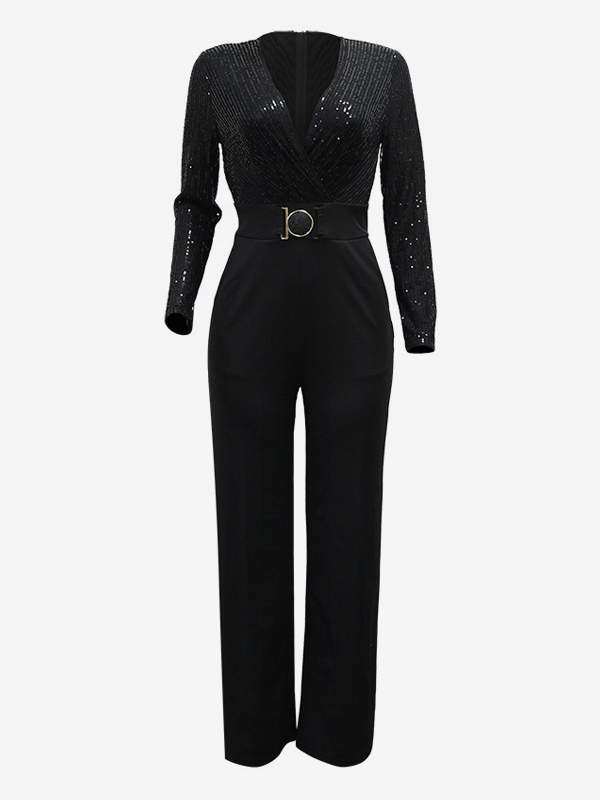 スパンコールストライプVネックベルト付きワイドレッグパーティージャンプスーツ(レディース)2026