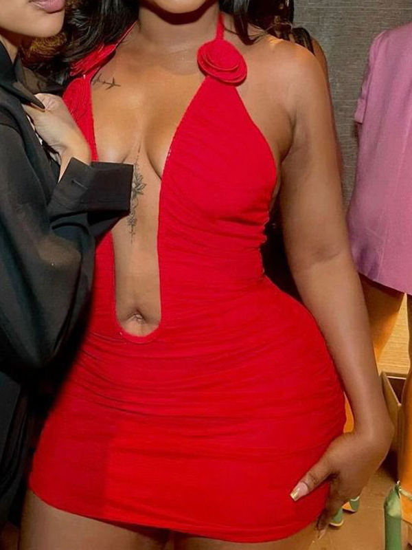セクシーなディープVネック、ルーシュボディコン、ローズアップリケ、ホルターネック、パーティードレス(レディース)2026
